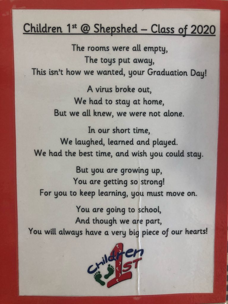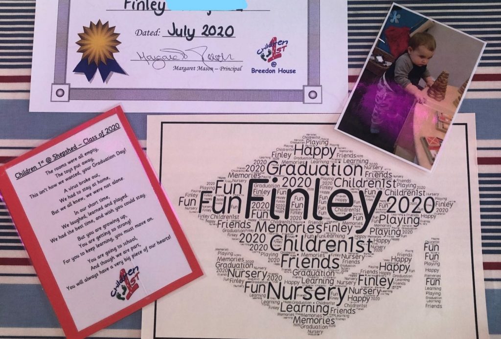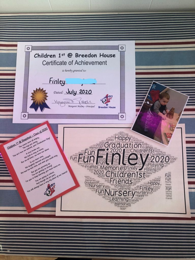 The pack contained a ‘make it yourself ‘graduation hat, so the children could make their own, a certificate, a poem and one of their very first pictures taken with us. We asked the children to take pictures at home, with their certificate and hat, and send it to us, so we could celebrate in different ways.
