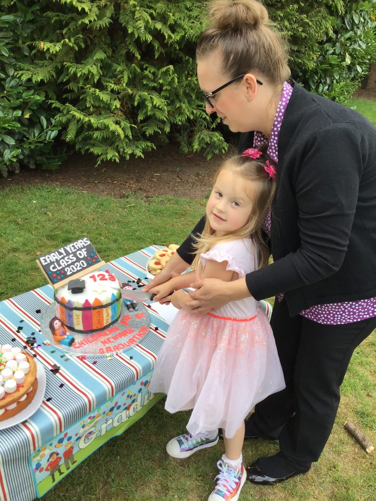 Everyone had a wonderful day at our graduation party which was held in our huge garden. The children received their certificates, had a party picnic and played their favourite party games. The graduation themed cake was a big hit! Many thanks to our trainee Miss Millie who created this wonderful treat.