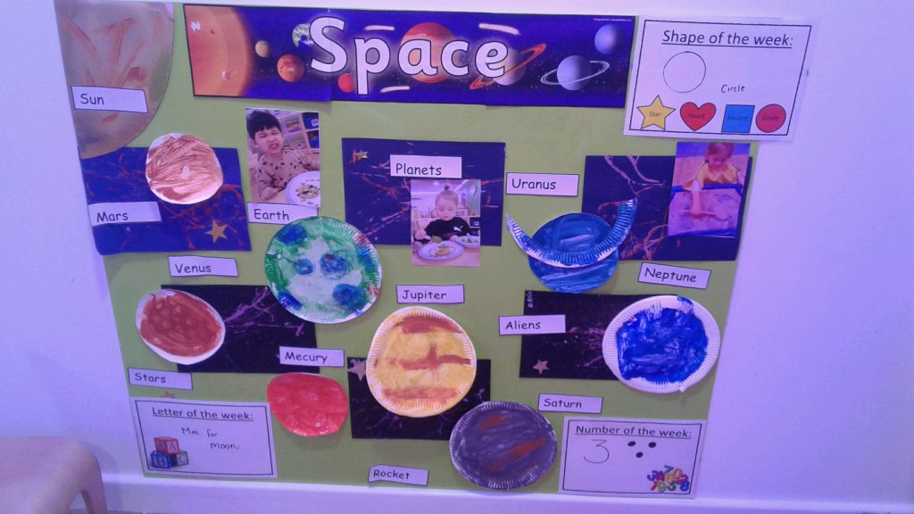 They have enjoyed creating a brilliant space topic board. This included painting and making planets, using messy play cornflour to represent the moon dust and building rockets made with junk modelling materials.