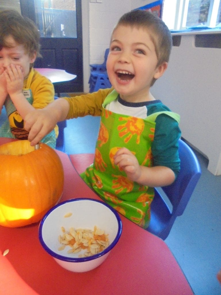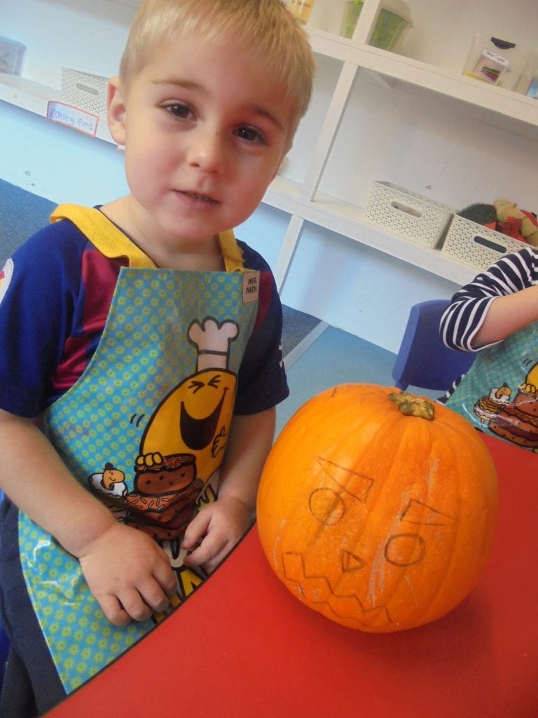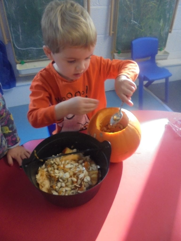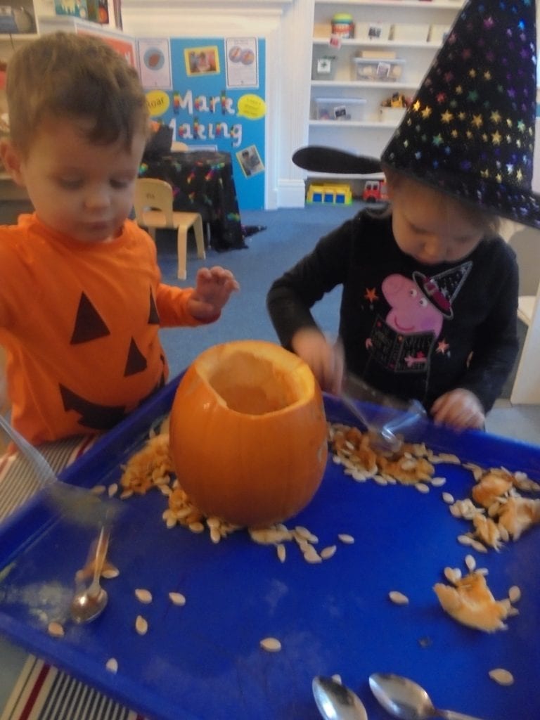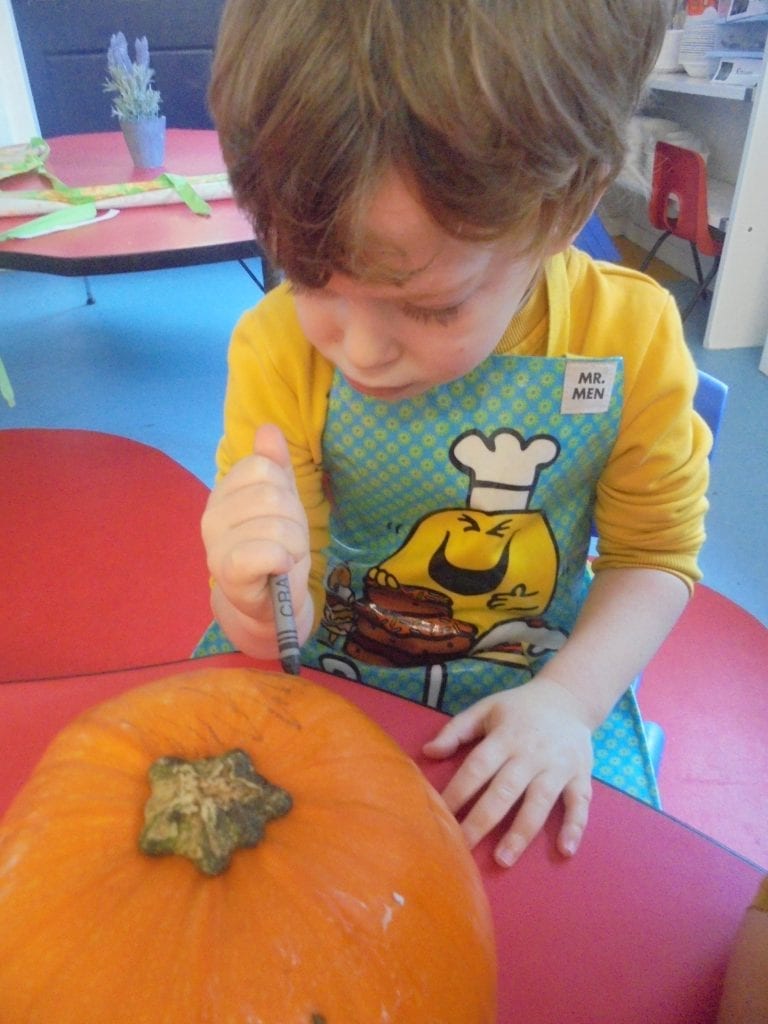 The babies enjoyed exploring the different textures of a pumpkin and cutting and mark making using Halloween colours and textures.