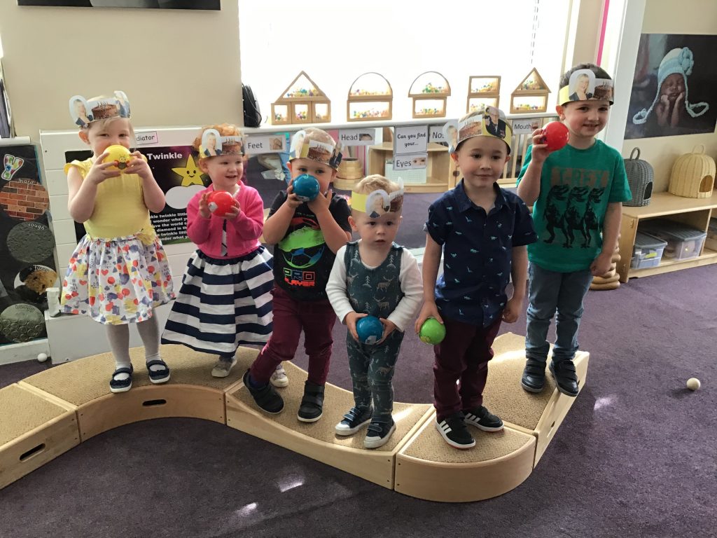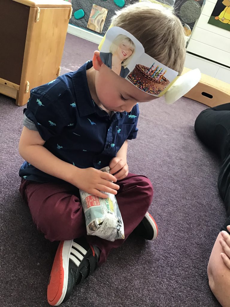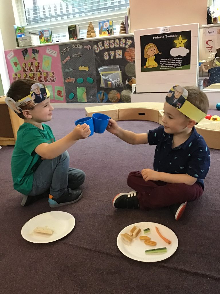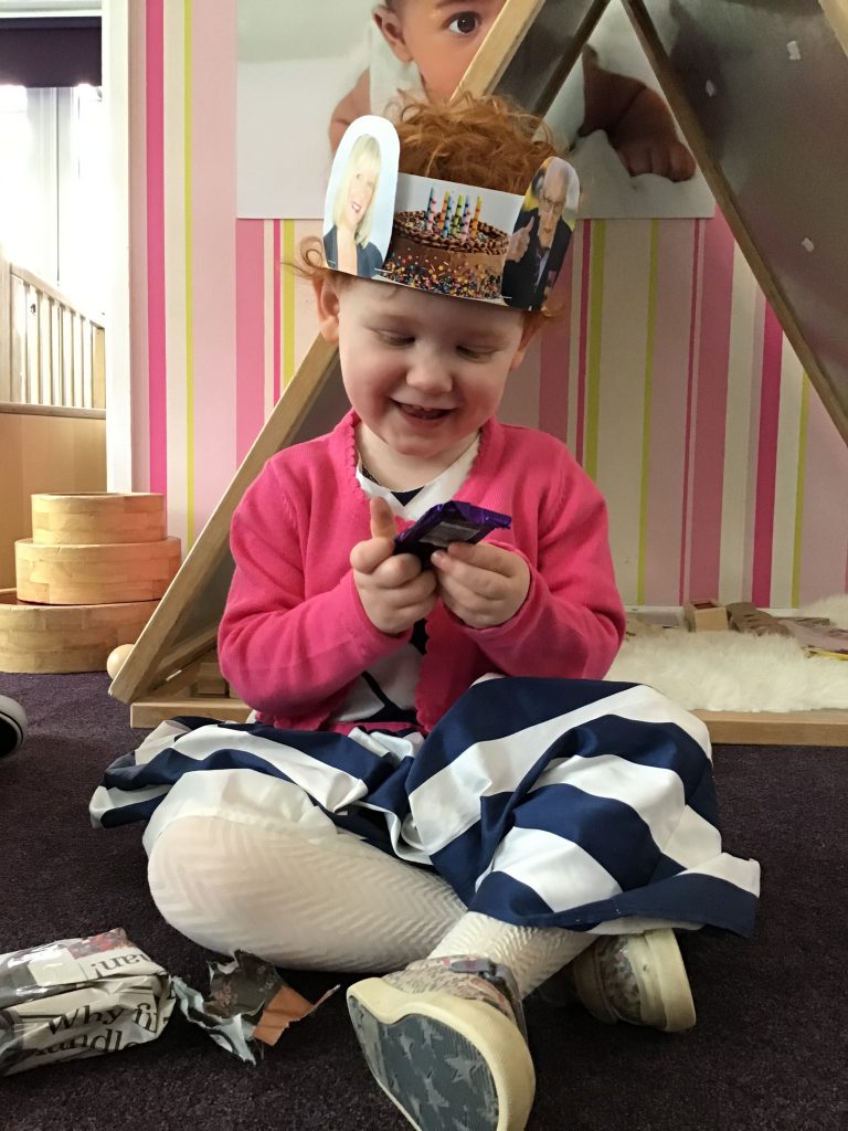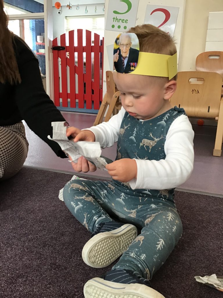 The nursery was decorated with the festive bunting we made earlier in the week. We all dressed in our party clothes and wore party hats decorated with Captain Tom’s face. At the party we played games such as mini golf, skittles, pass the parcel and musical statues. There was also some splendid party food which featured the lovely scones we all helped to make.