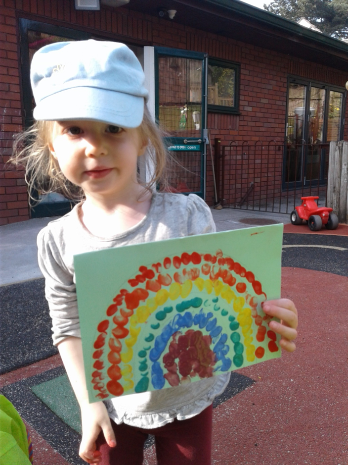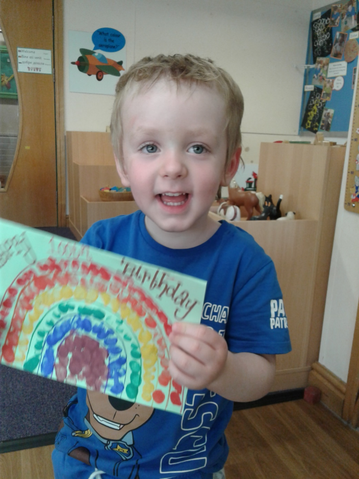 To show their appreciation of his fantastic achievement, the children made a colourful rainbow birthday card for him and popped it in the post. The children were really careful as they applied the paint using their fingertips to make the rainbow. Great work everyone!