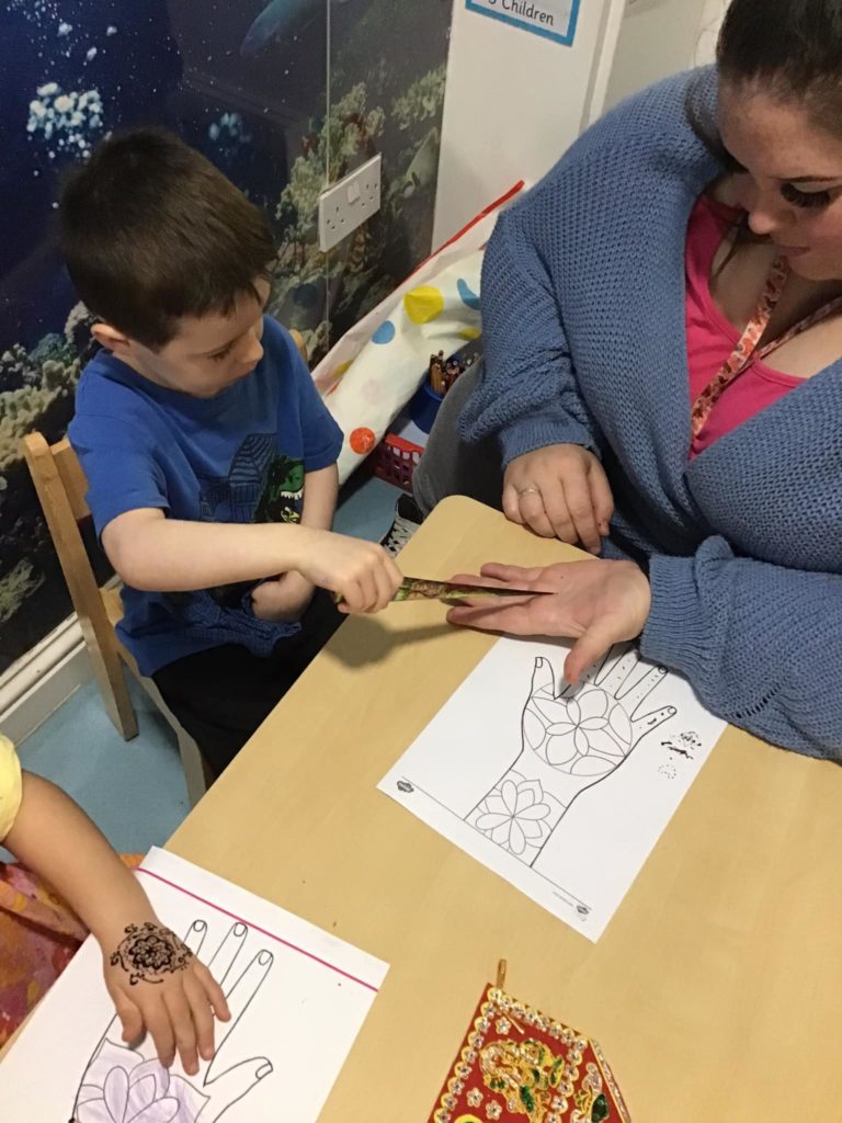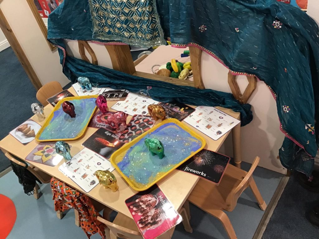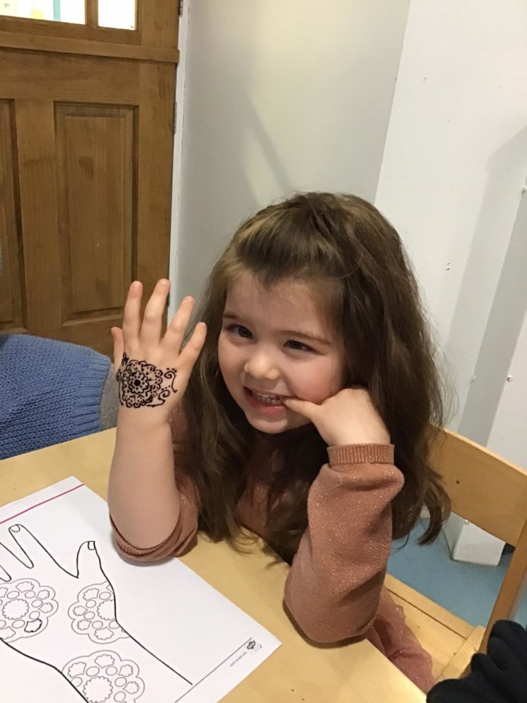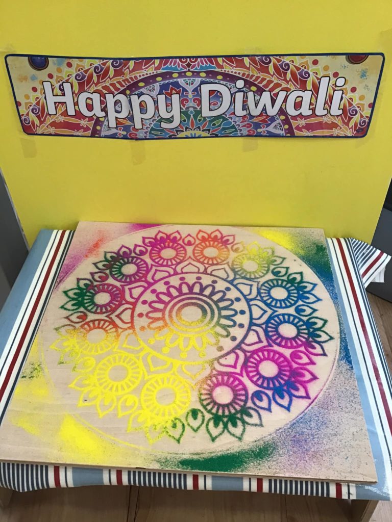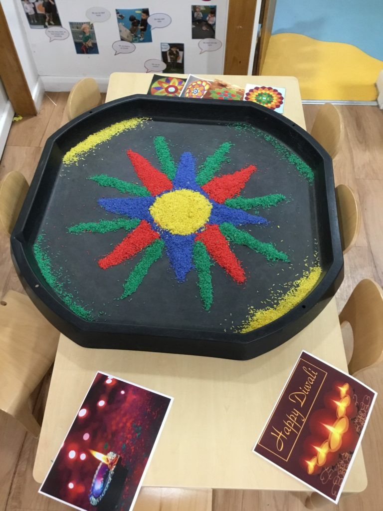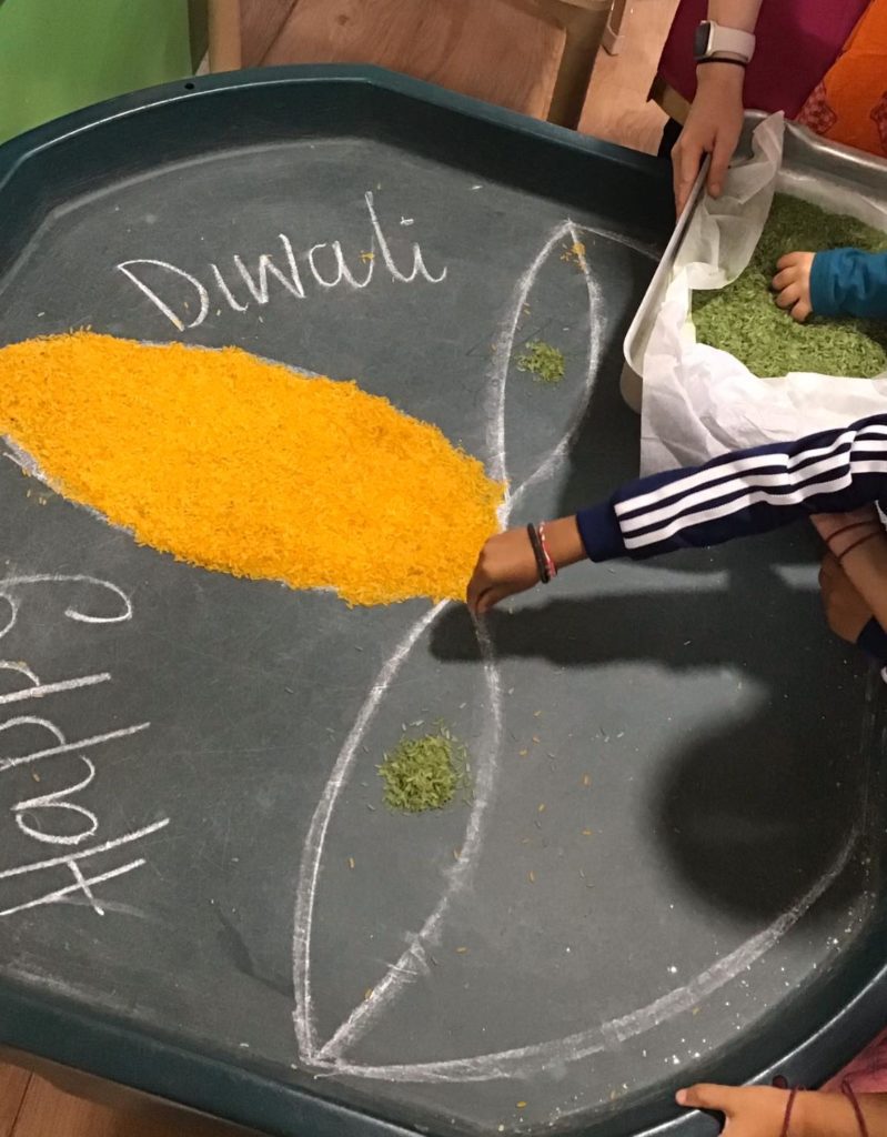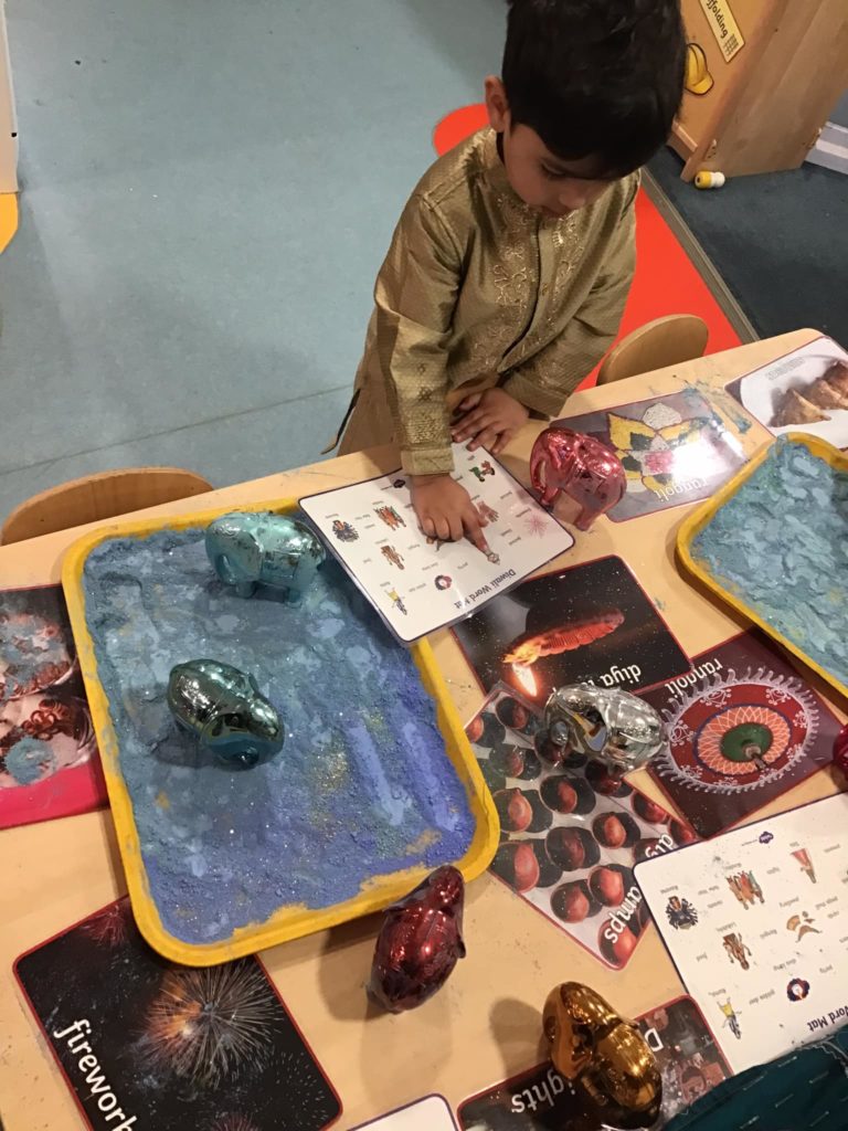 Sensory tuff spots have become transformed by beautiful rangoli patterns which enabled the children to explore vibrant colours and textures. Diva lamps have been made and decorated and hands have been made beautiful with intricate mehndi patterns.