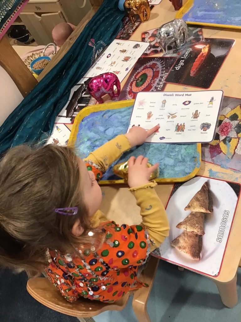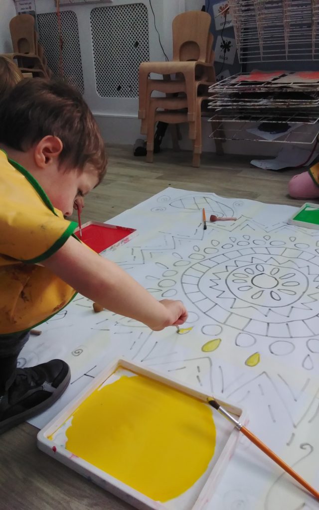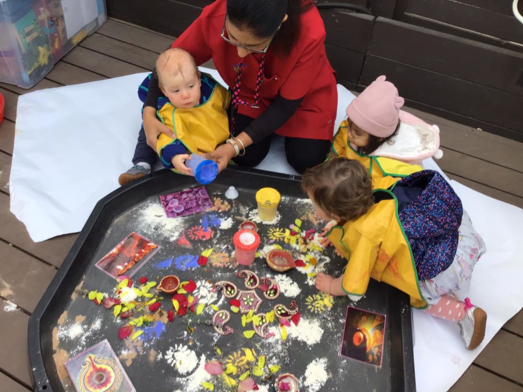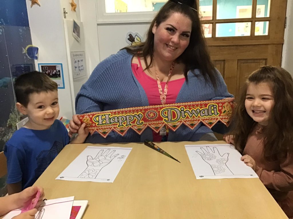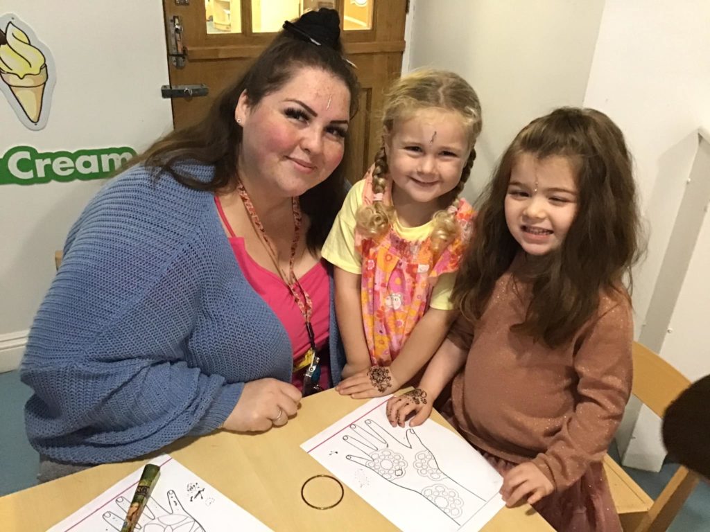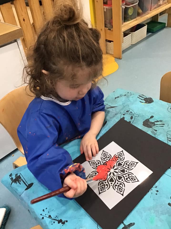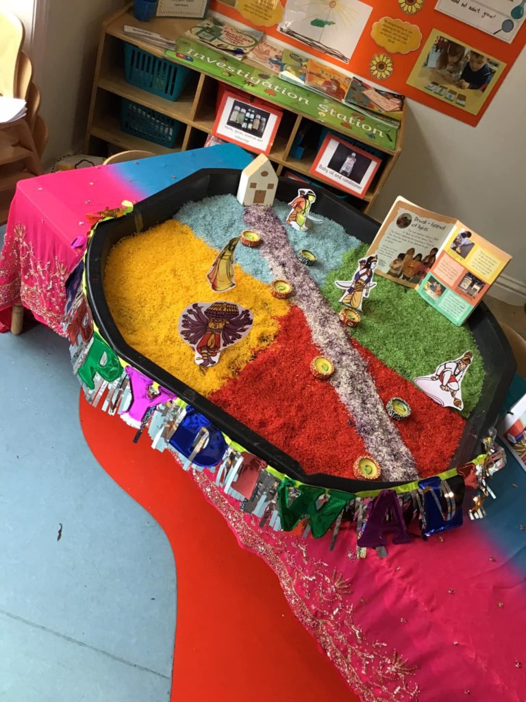 Sensory tuff spots have become transformed by beautiful rangoli patterns which enabled the children to explore vibrant colours and textures. Diva lamps have been made and decorated and hands have been made beautiful with intricate mehndi patterns.
