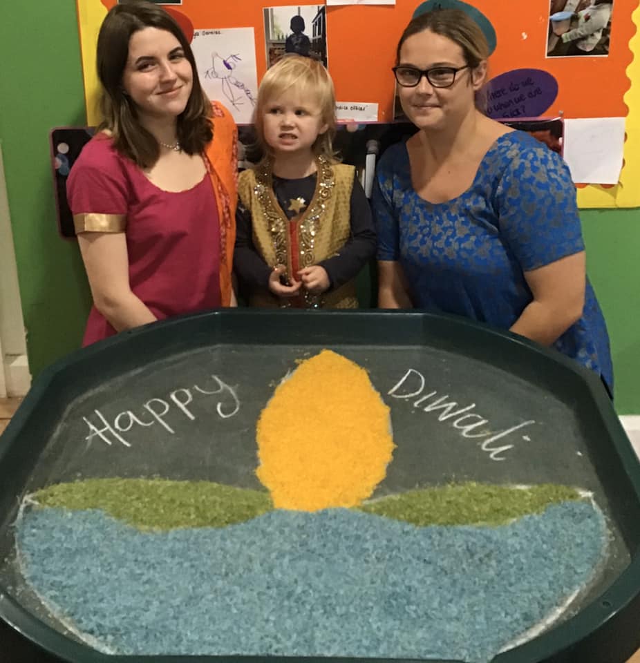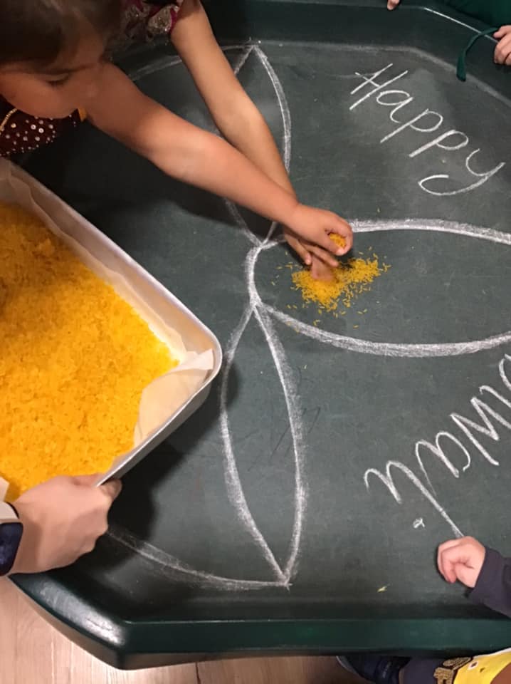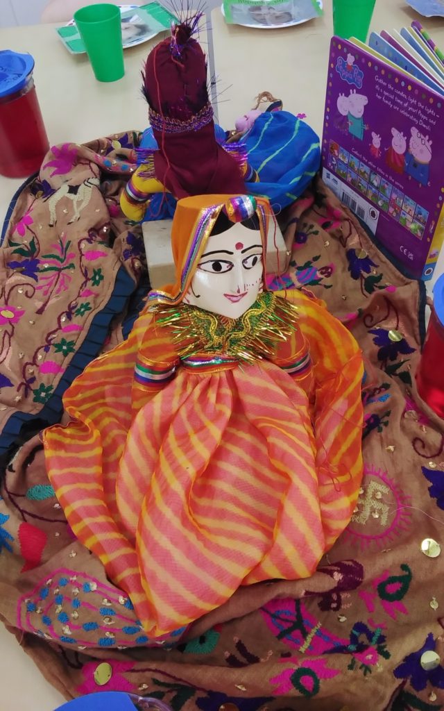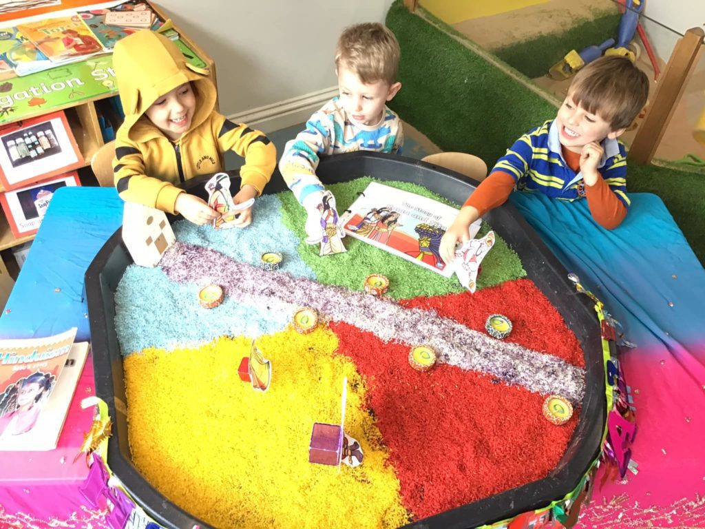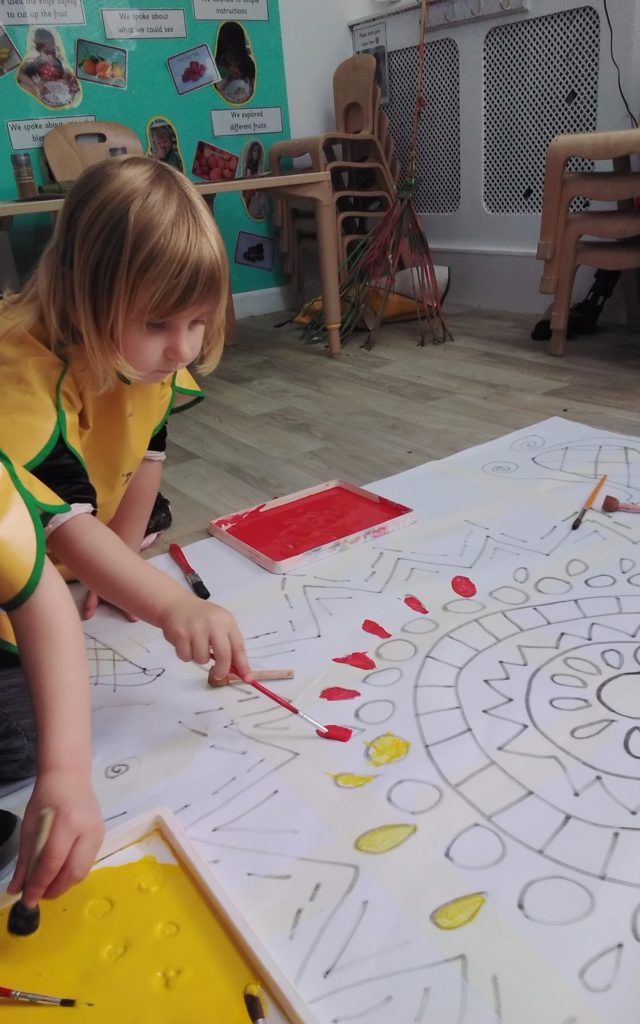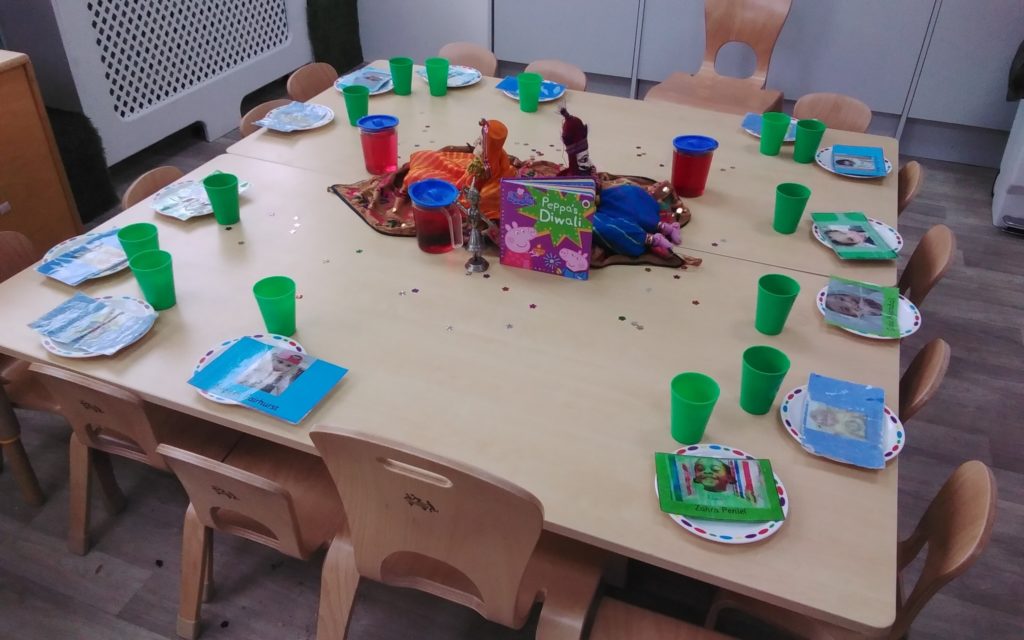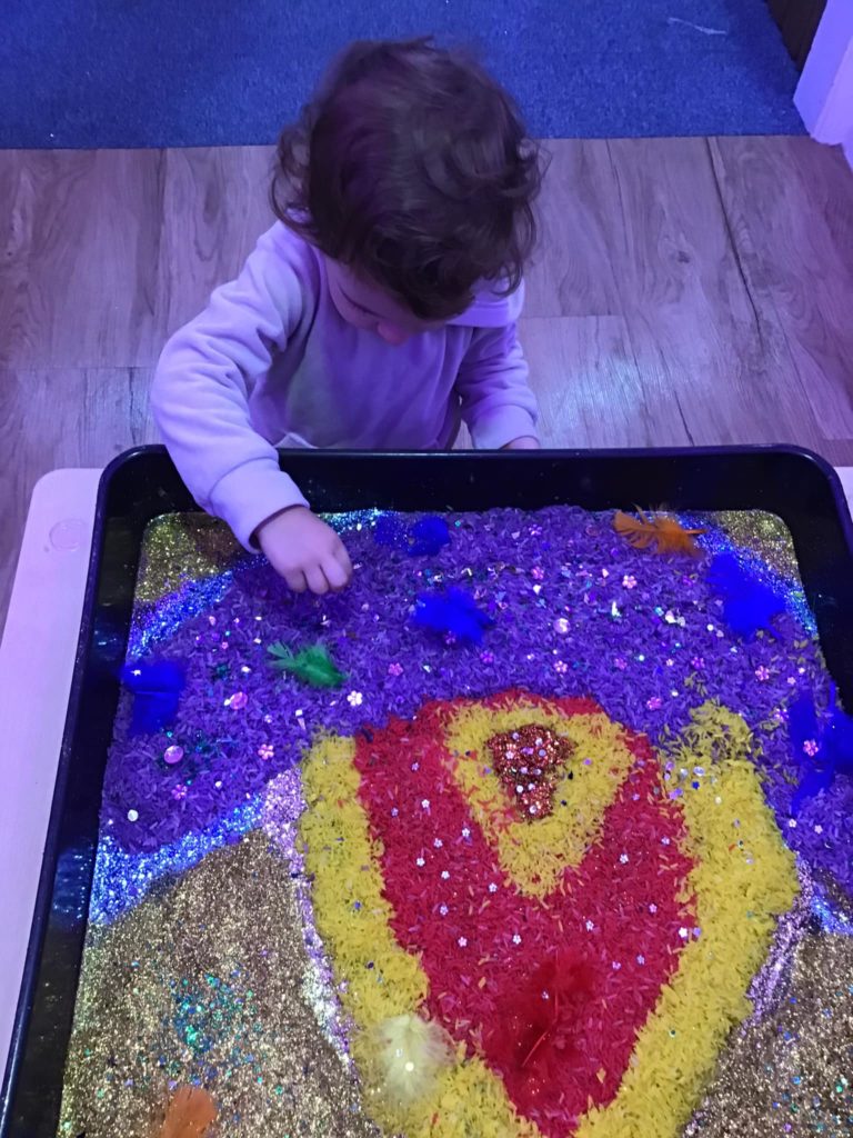 Sensory tuff spots have become transformed by beautiful rangoli patterns which enabled the children to explore vibrant colours and textures. Diva lamps have been made and decorated and hands have been made beautiful with intricate mehndi patterns.