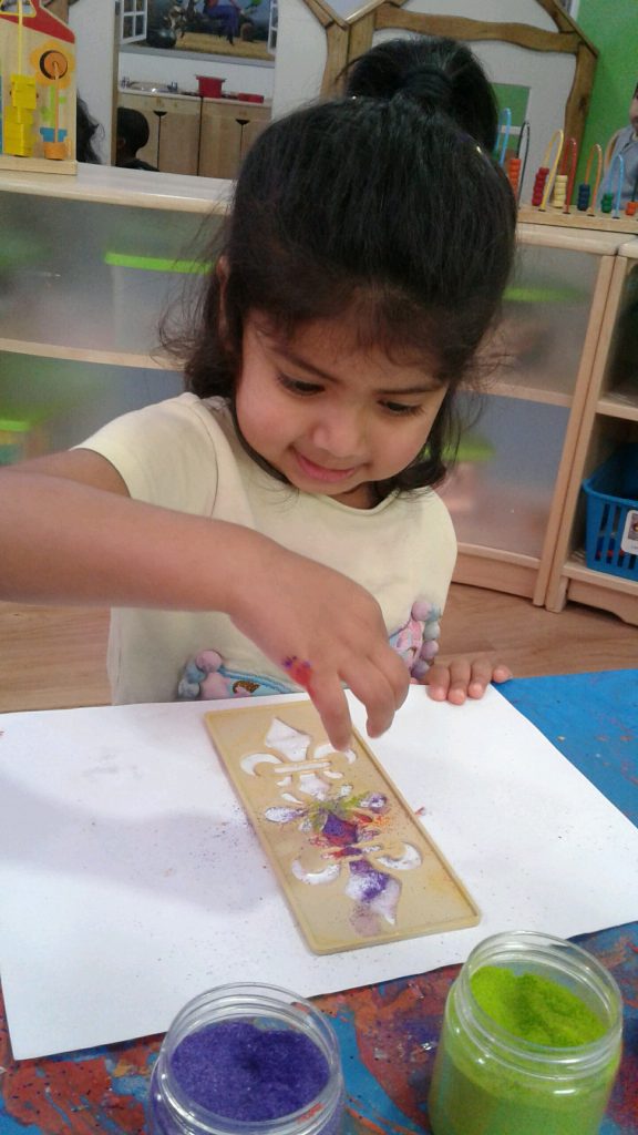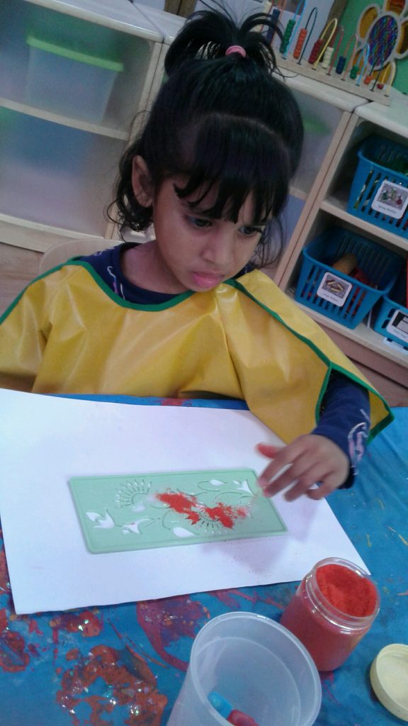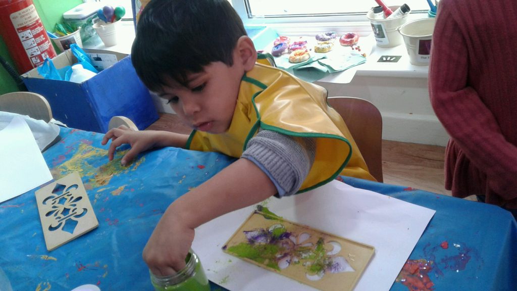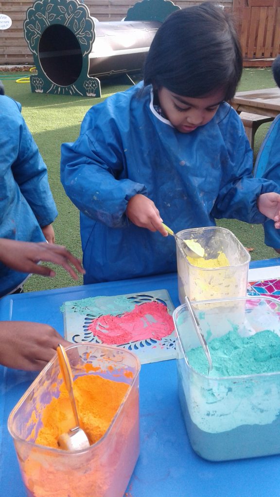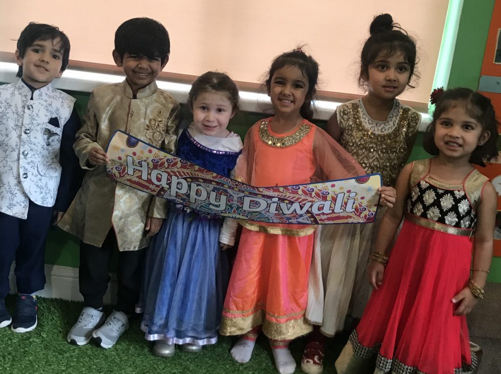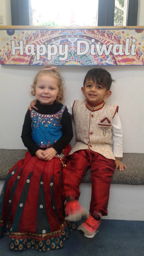 The children at Birstall looked fantastic as they dressed for Diwali in their beautiful and colourful outfits. It was a busy day at nursery, with the Early Years children making Rangoli patterns using powder paint and stencils. The under 2’s had a brilliant time decorating diva lamps and getting messy with the paints.
