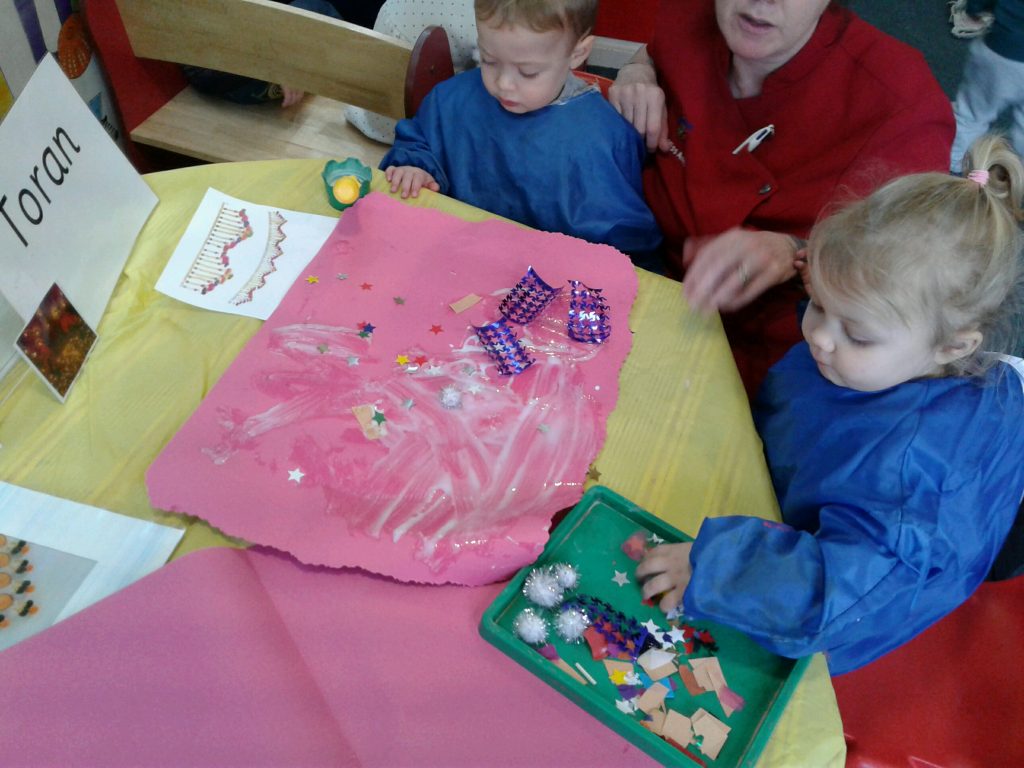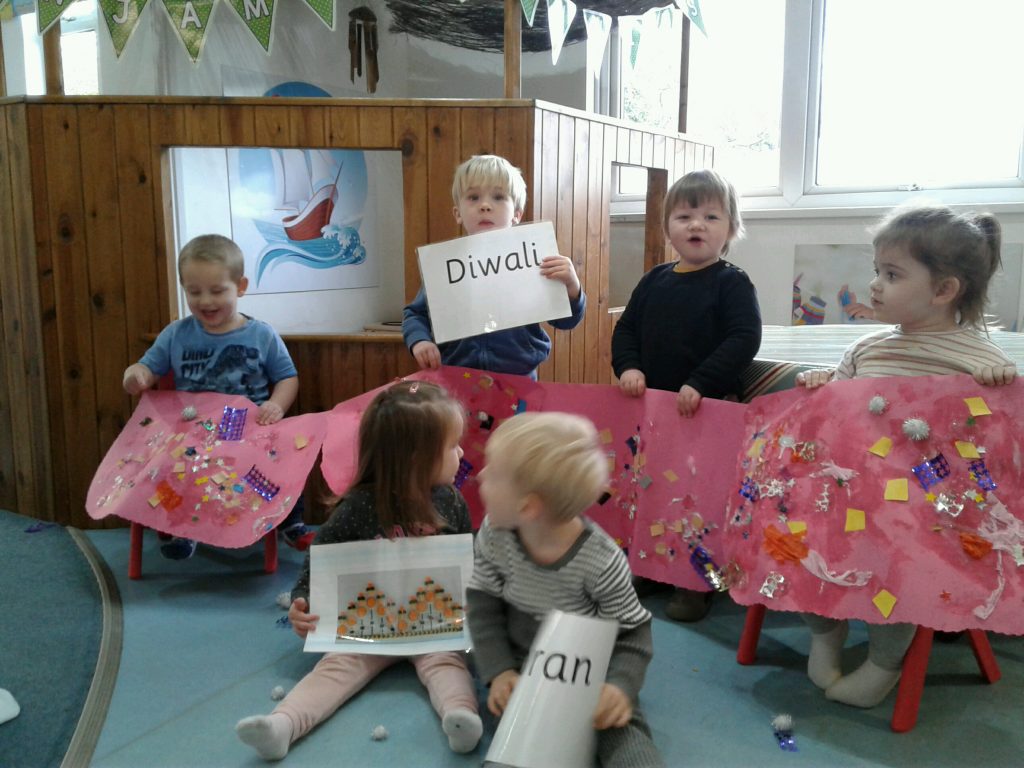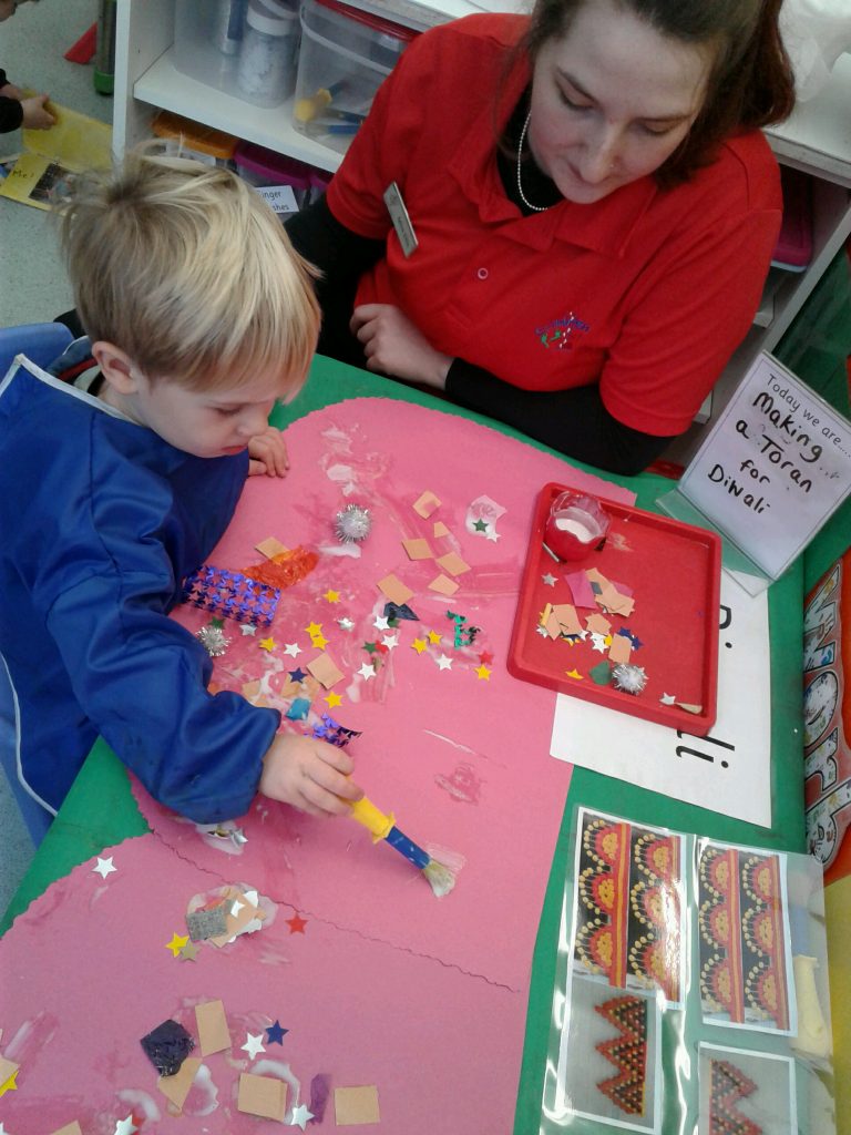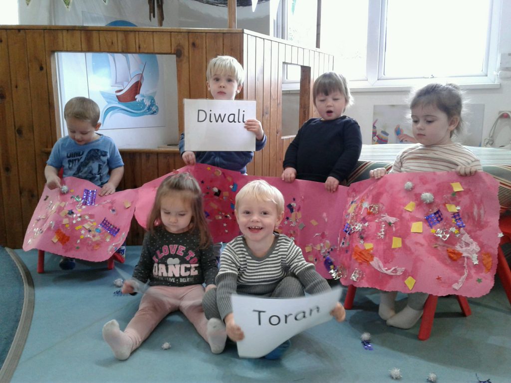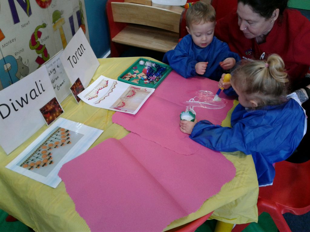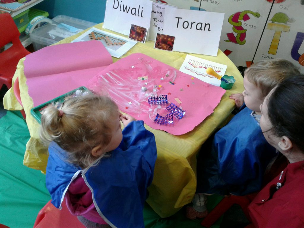 To celebrate Diwali and to find out more about the festival, Benjamin Bunnies at Derby Road made a Toran which is an Indian door hanging decoration. They had lots of fun learning new words and working together to make their beautiful decoration. The activity was a little messy with the use of some rather sticky glue but the little ones were very proud to show off what they had made.