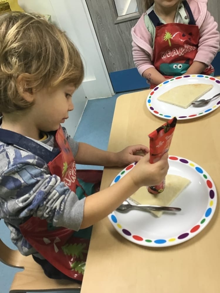 Such a responsibility when the children decided to make pizzas for tea! As part of our ‘People Who Help Us’ theme the children learned about the processes our cook uses when she is making tea and thought they would have a go at being cooks for the day!