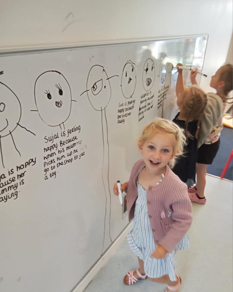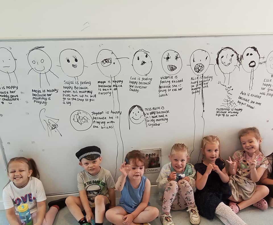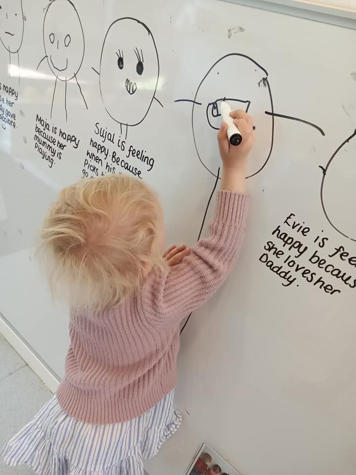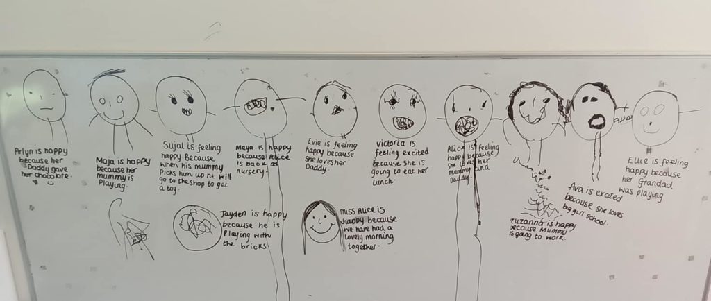 The children were very good at saying how they were feeling and why and Miss Alice added their words to their pictures. There were so many reasons to be happy! Jayden said he was happy because he was playing with the bricks at nursery. Alice is happy because she loves her mummy and daddy!