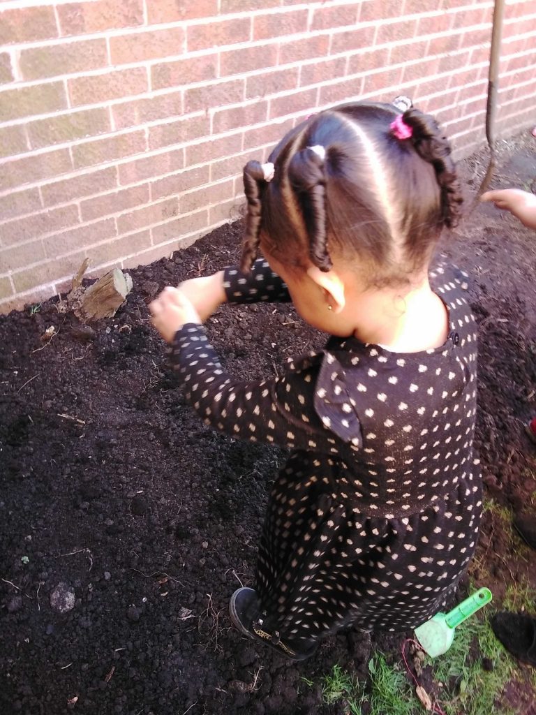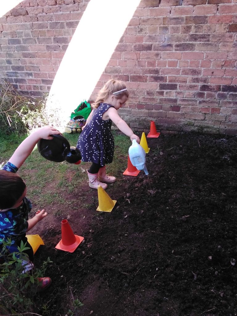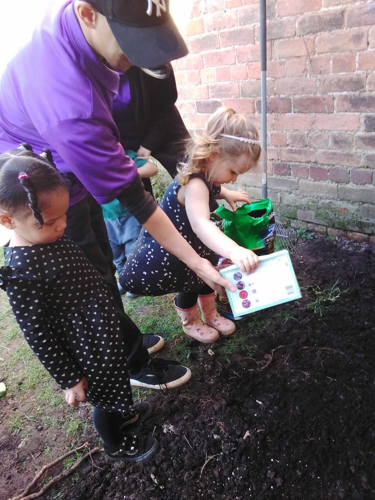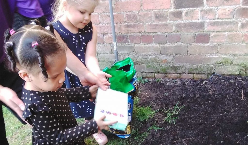 The children went out into the garden and used spades to prepare the soil for planting mixed flower seeds and then sowed them into the ground.