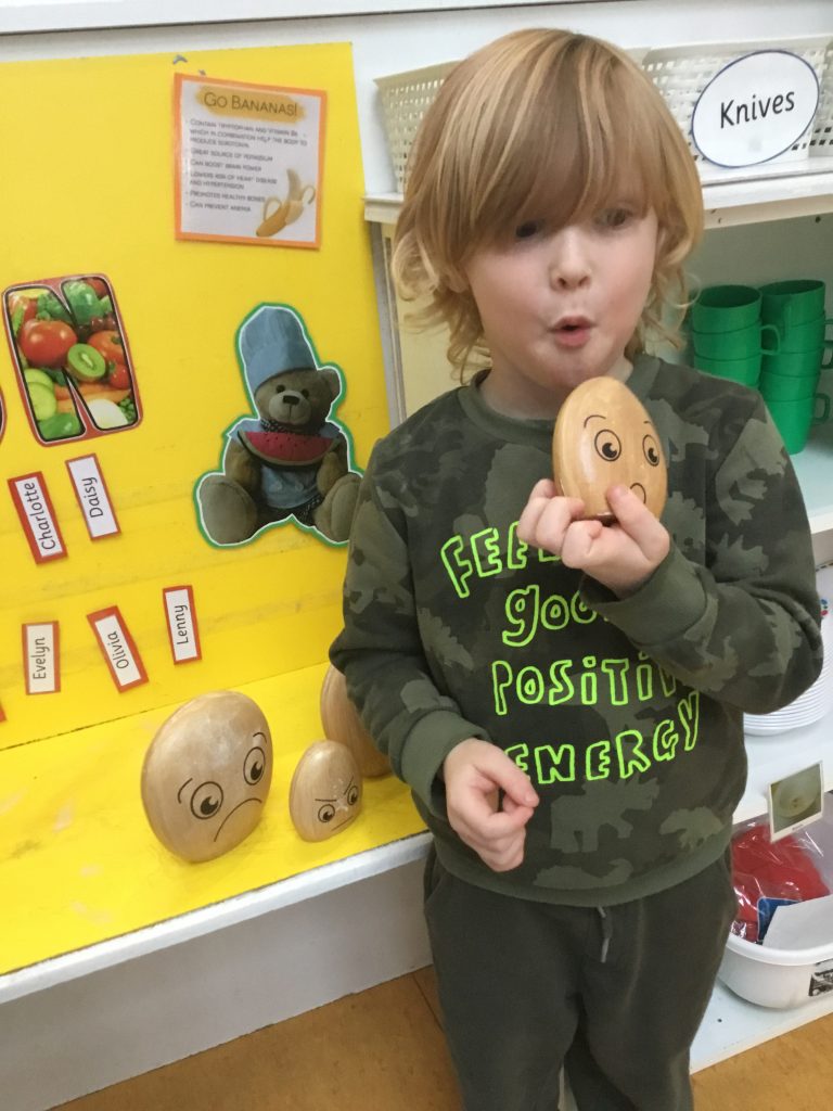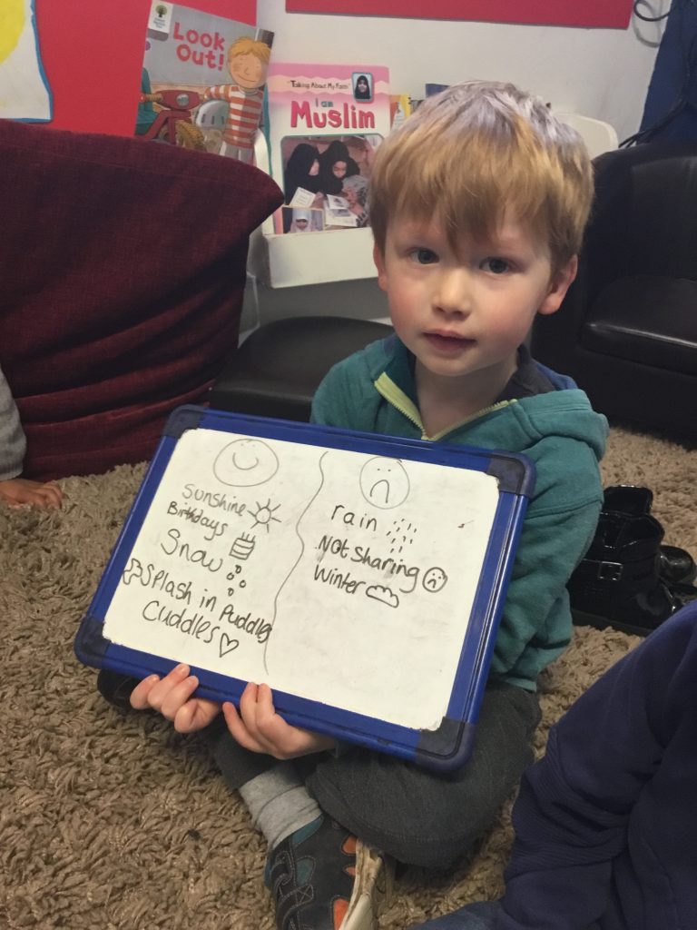 The Early Years’ children came dressed with their clothes on inside out as a visual way to explain how we may look different on the outside, to how we feel on the inside. They also enjoyed talking and playing with our feeling face spoons and made a list and drew things that made us feel a certain way.