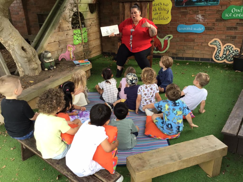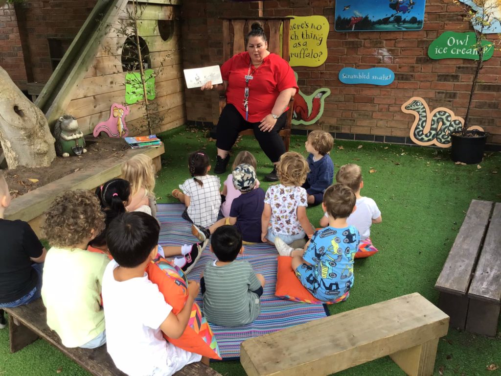 The children listened carefully to Miss Alice reading the story, and afterwards they were ready for adventures, stepping through the swishy swashy grass, the splashy sploshy river, the squelching squerching mud, the stumble trip forest, and the swirling whirling snowstorm.