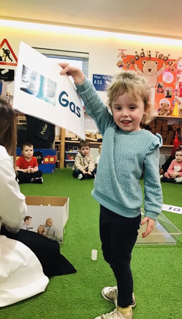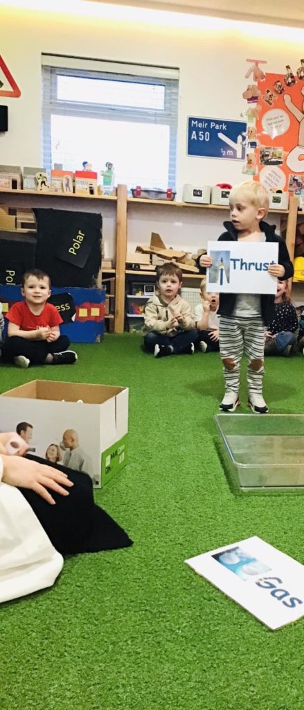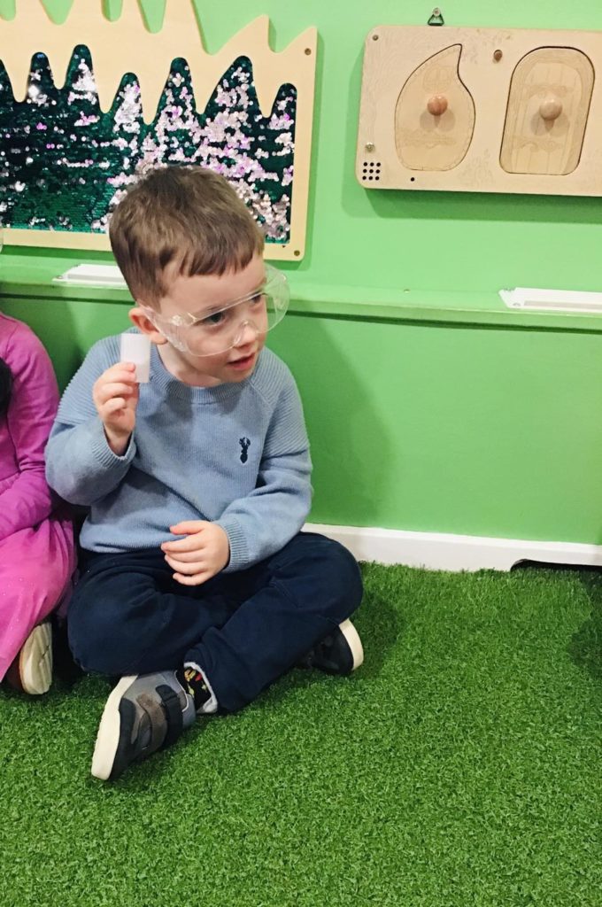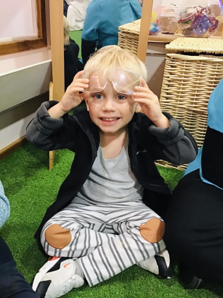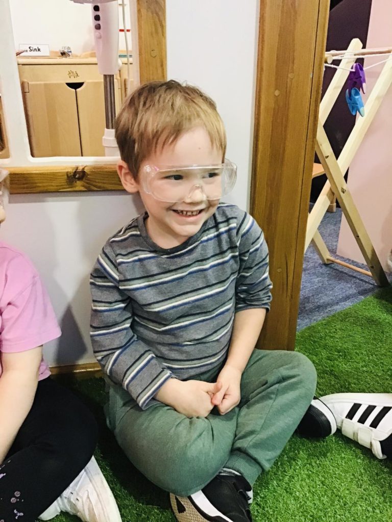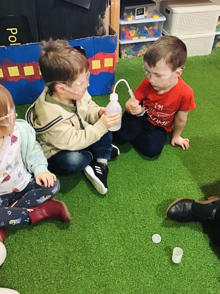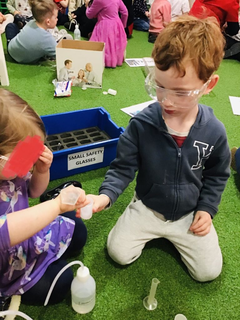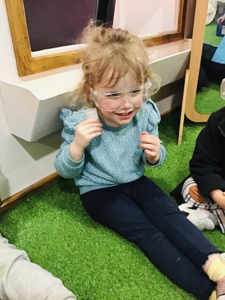 Sam, who is one of our parents at nursery, happens to be a science teacher. She very kindly volunteered to make rockets with the children. The children had an excellent time learning about what was needed to make the rockets fly. They engaged beautifully as they mixed the materials together themselves with their safety goggles on!