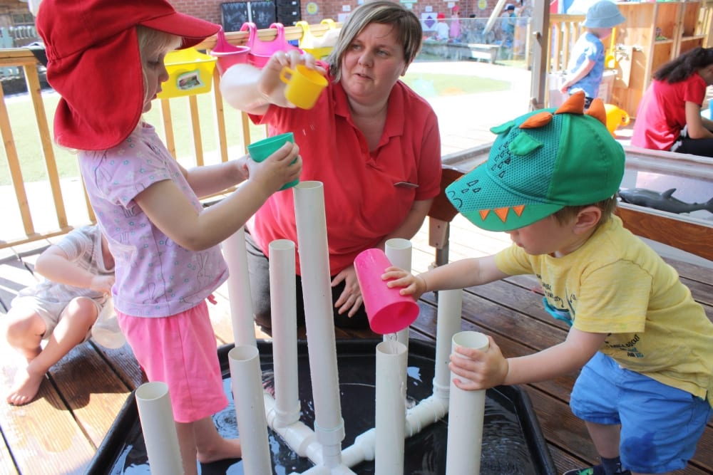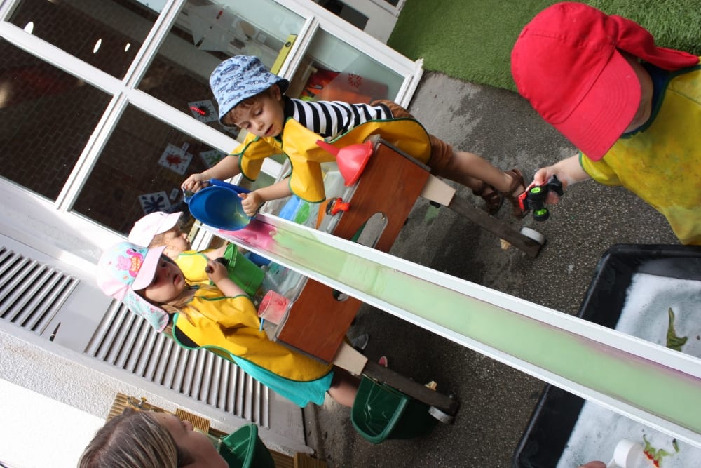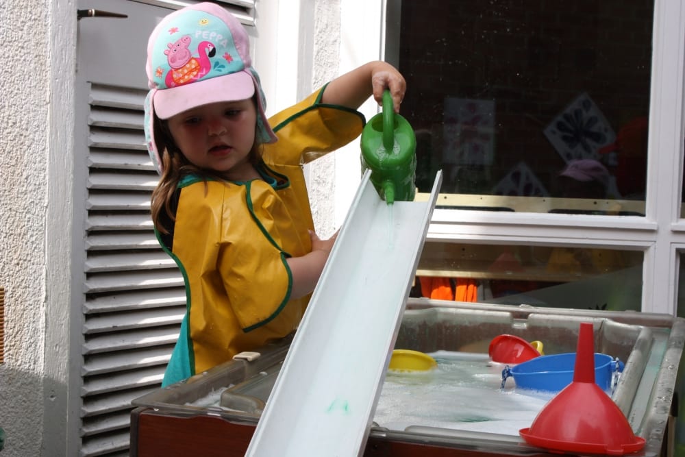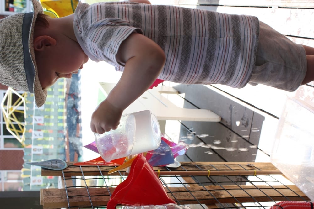 The children in Peter Rabbits have been exploring their new water wall, enjoying pouring water down the different tubes to see where it ends up and how it makes the windmills turn.