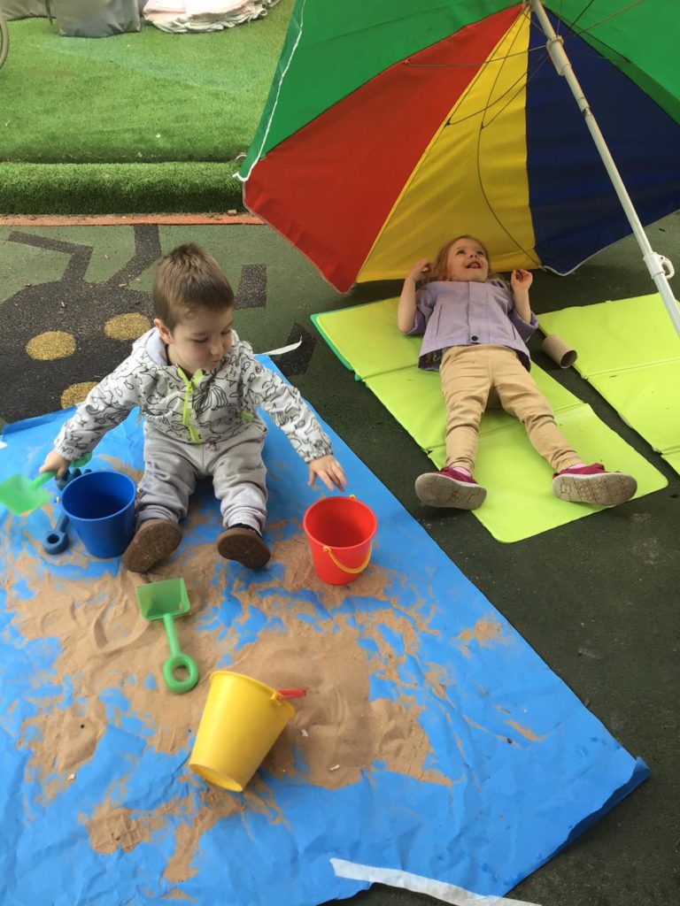 We talked about what to pack in our suit cases, made passports and went to the airport and flew off to the sunny seaside where everyone loved playing on the beach!