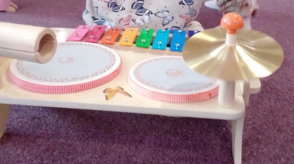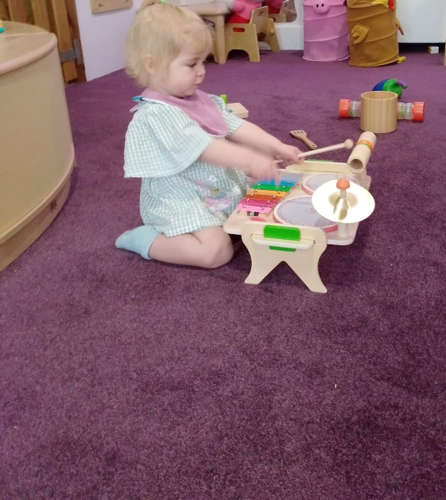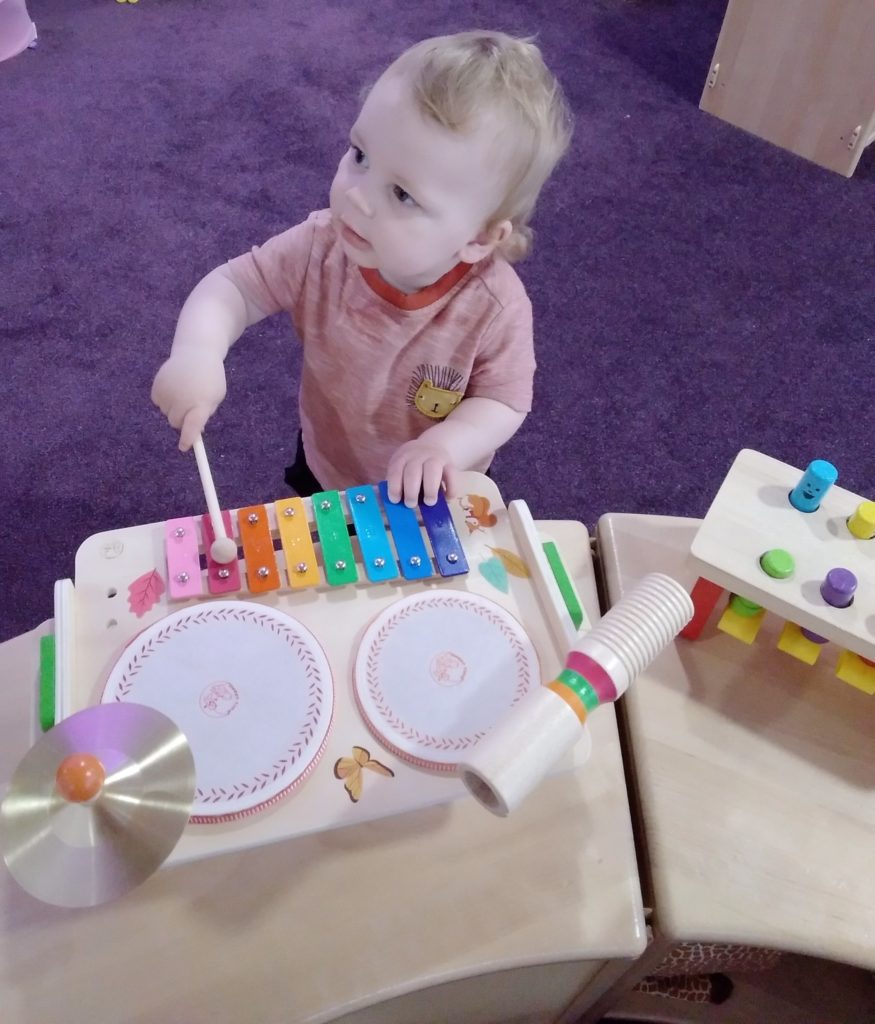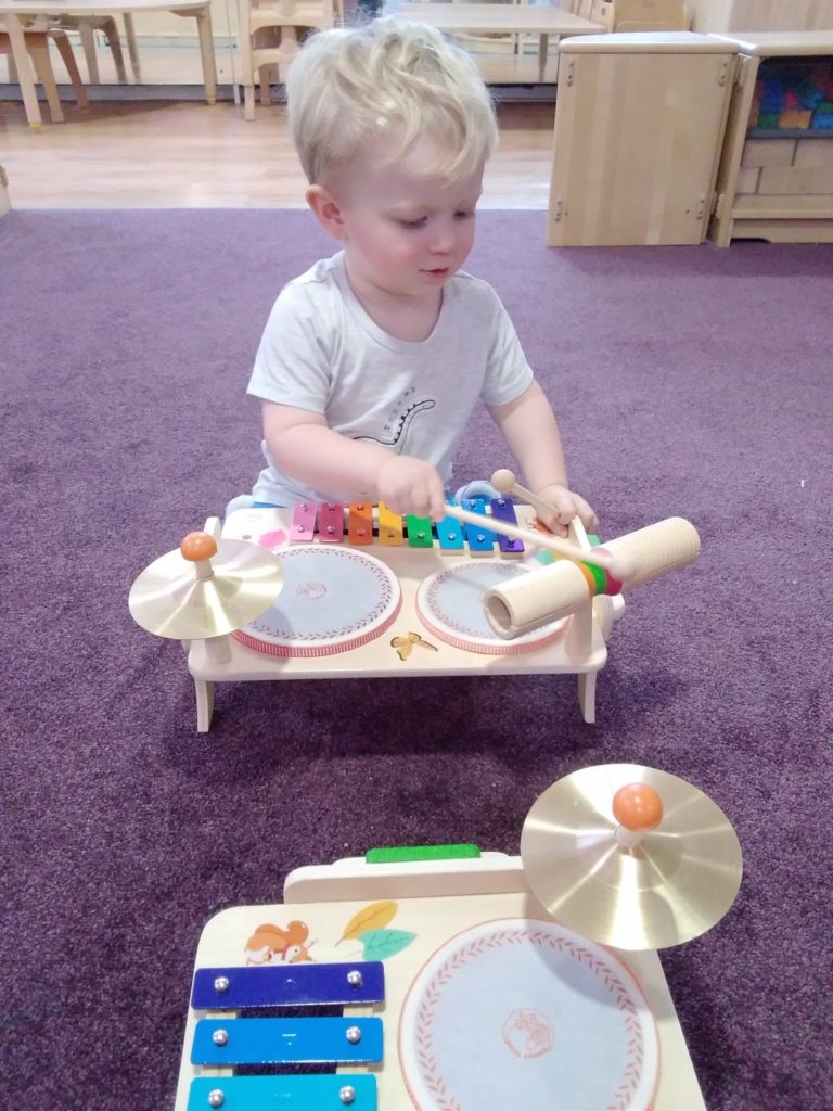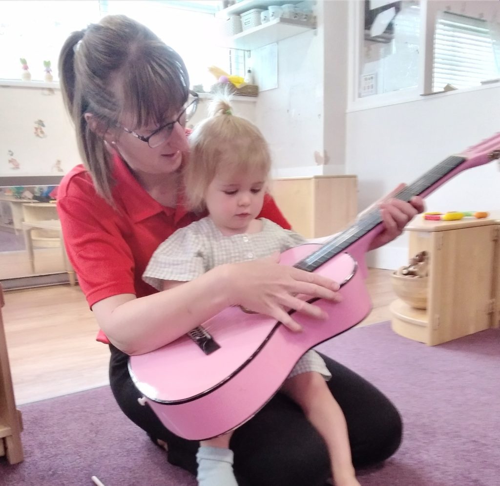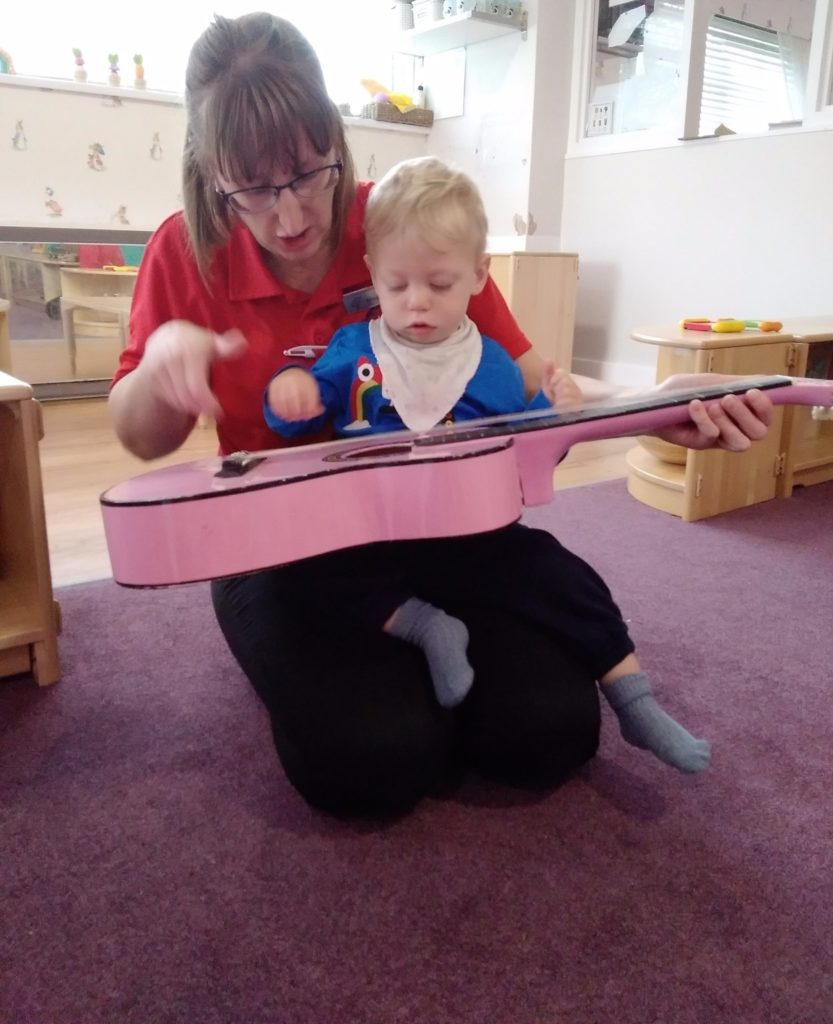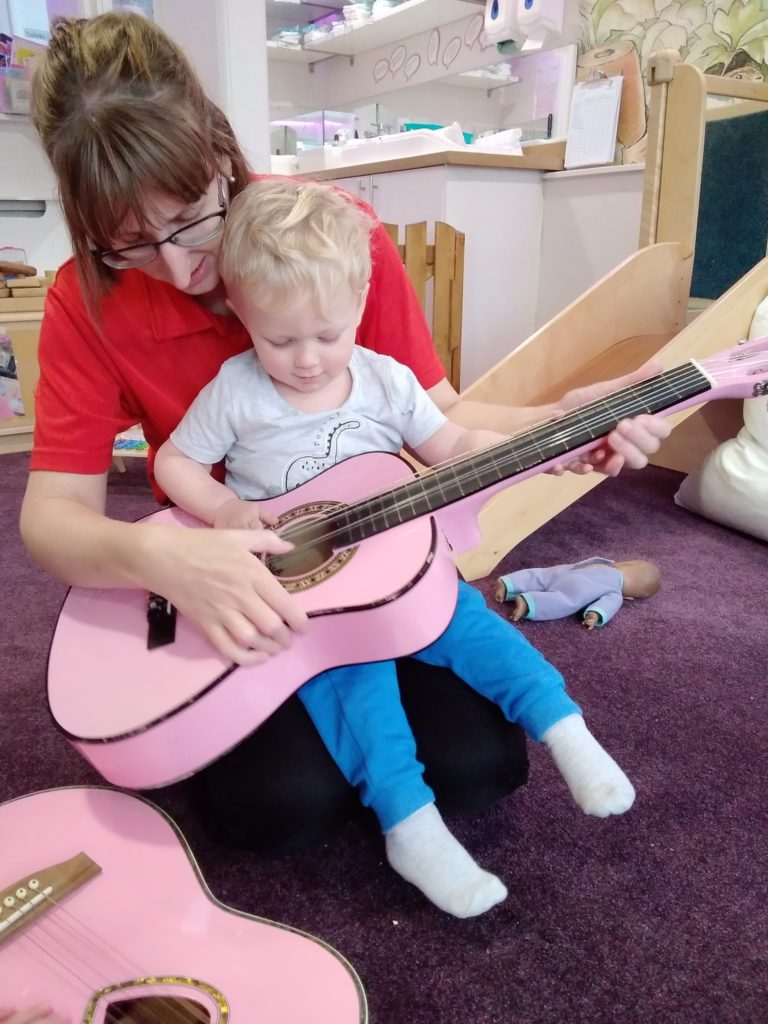 The Bobtails absolutely loved our drum set toys which have recently been added to their instrument collection. They enjoyed testing the different parts out and seeing which one made the loudest noise! Miss Michelle also became involved in the music making when she brought along a guitar. The children were keen to try plucking the strings.