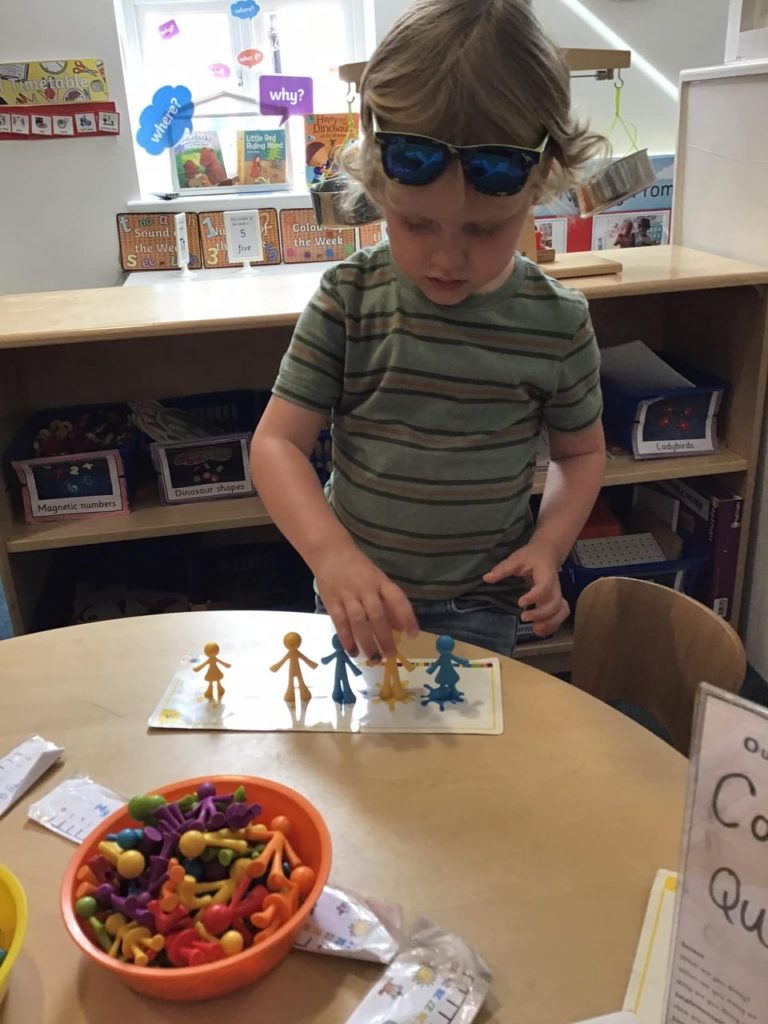 Back inside the classroom some of the children were using the colourful people counters and cards to recognise patterns and then carry the pattern or sequence on. They then compared quantities using language such as more than, less than and equal to.
