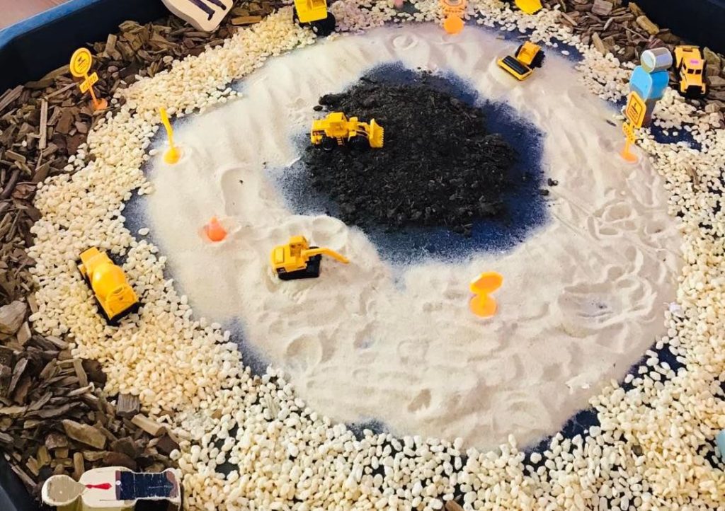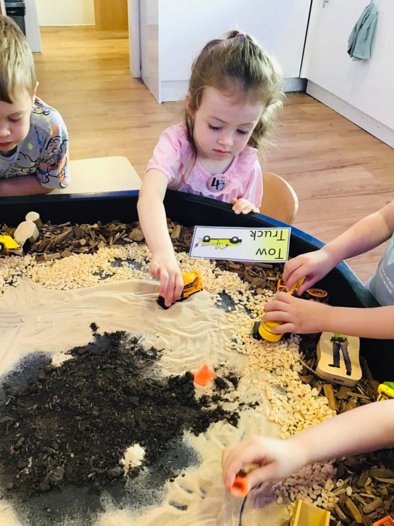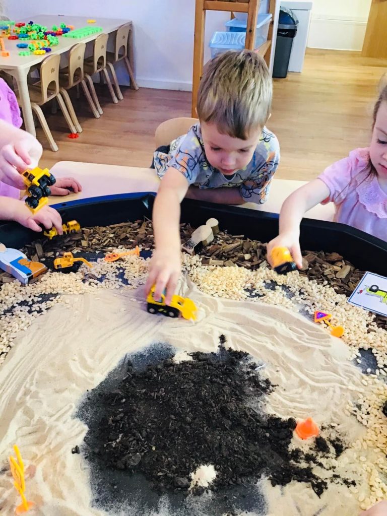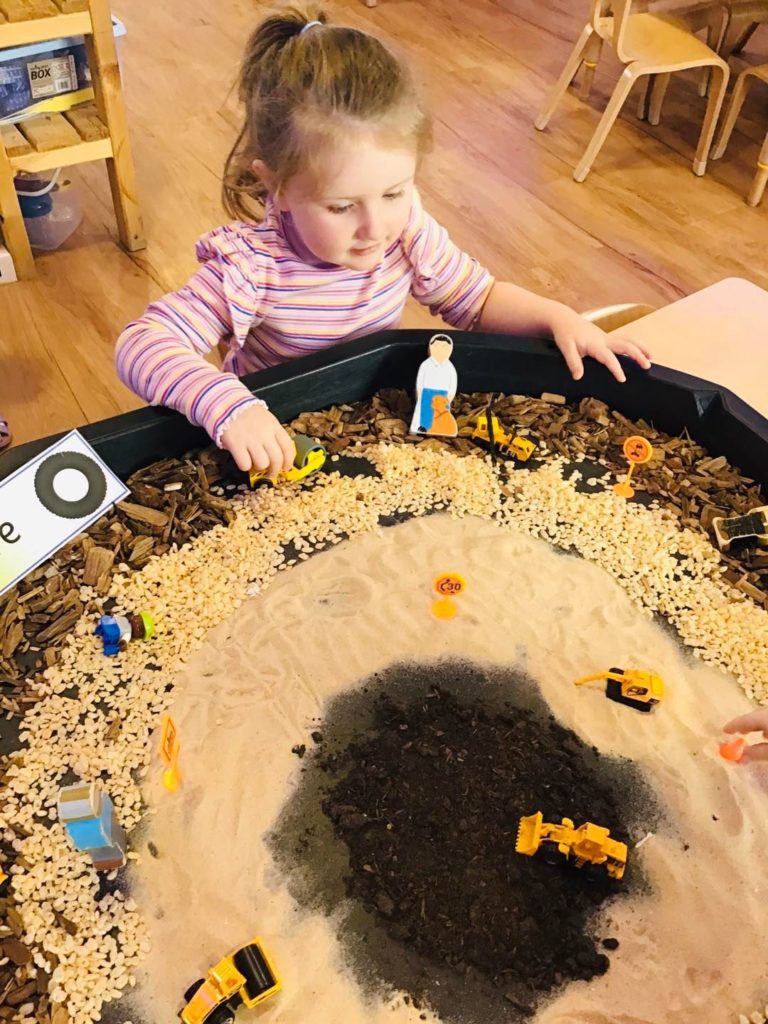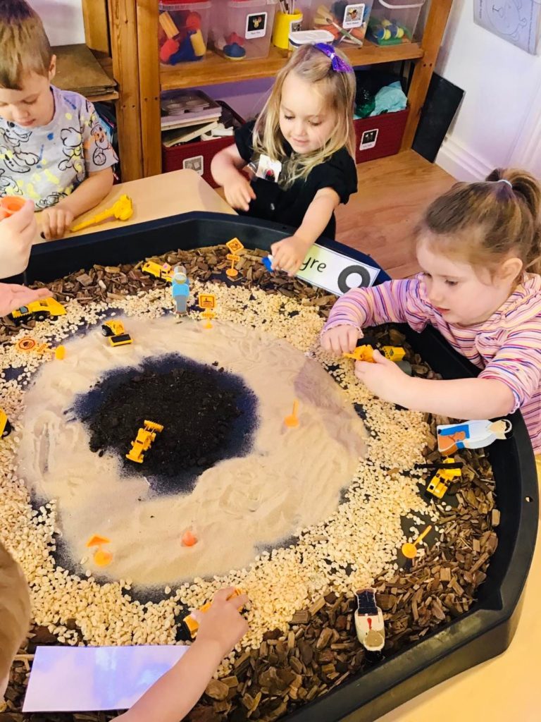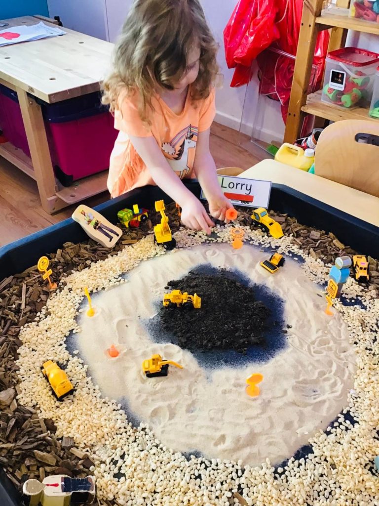 Everyone got engrossed in playing with the trucks and diggers in our construction site tuff spot. The children really enjoyed role playing builders as well as discussing the different textures they could feel.