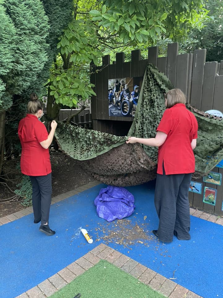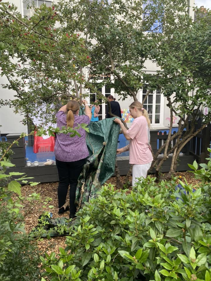 Learning outdoors has not been restricted to the children. With the children safely off home, our staff team gathered together to hear from Miss Natalie about her sand play training and to look at the potential for den building in the nursery grounds.
