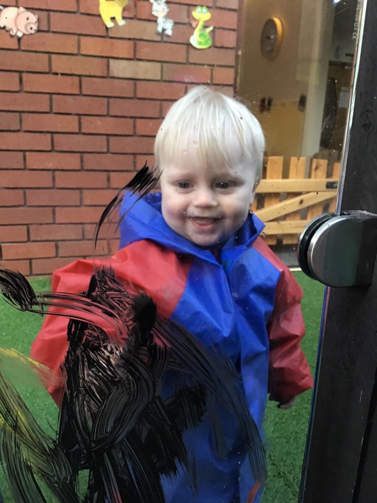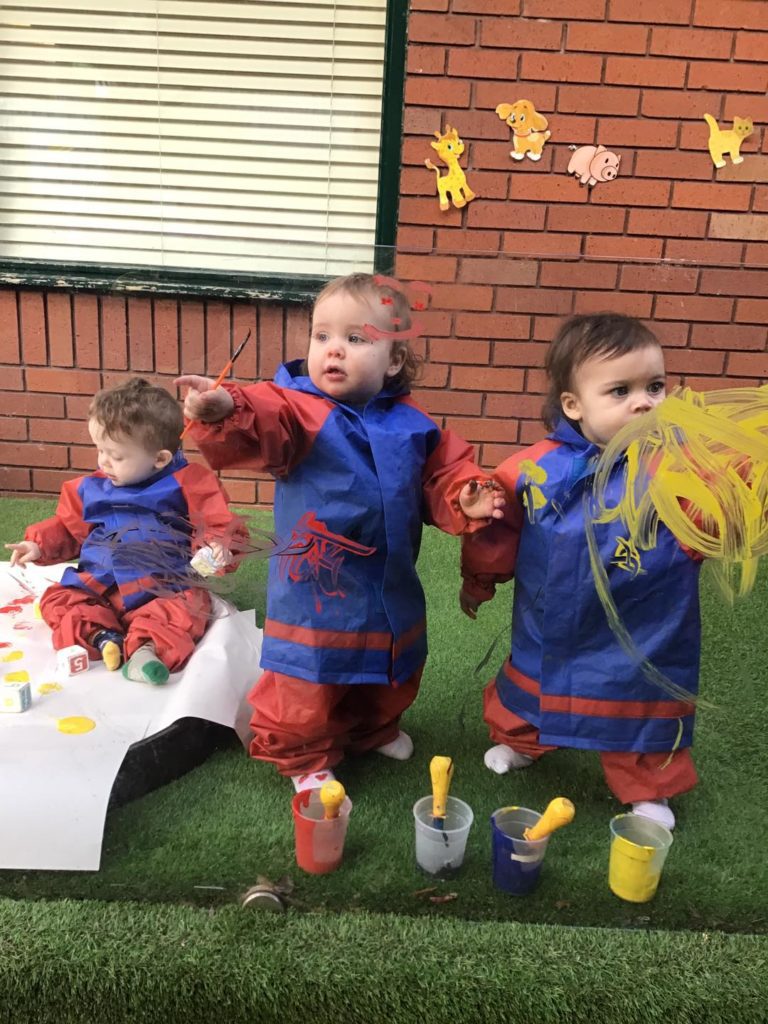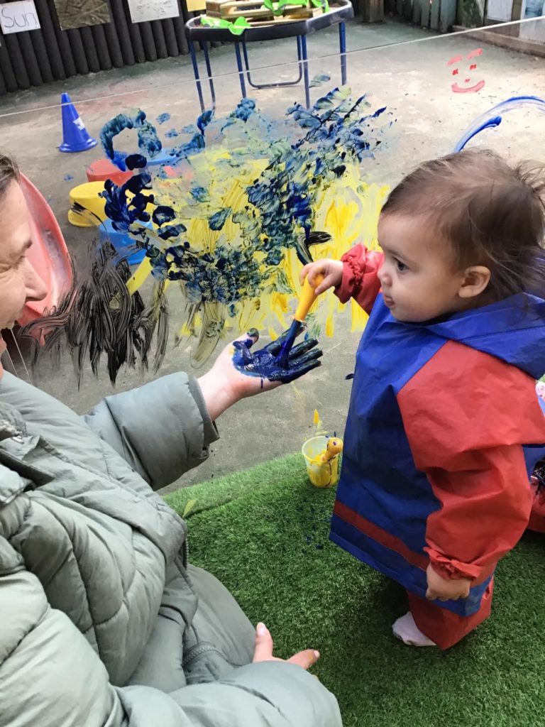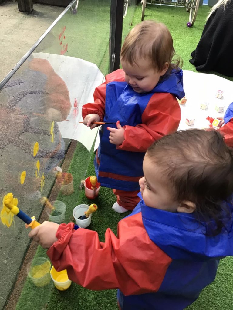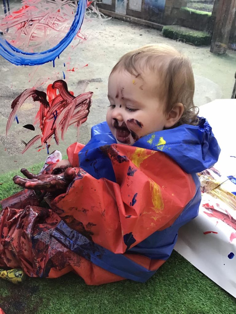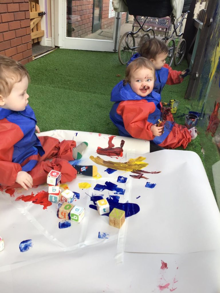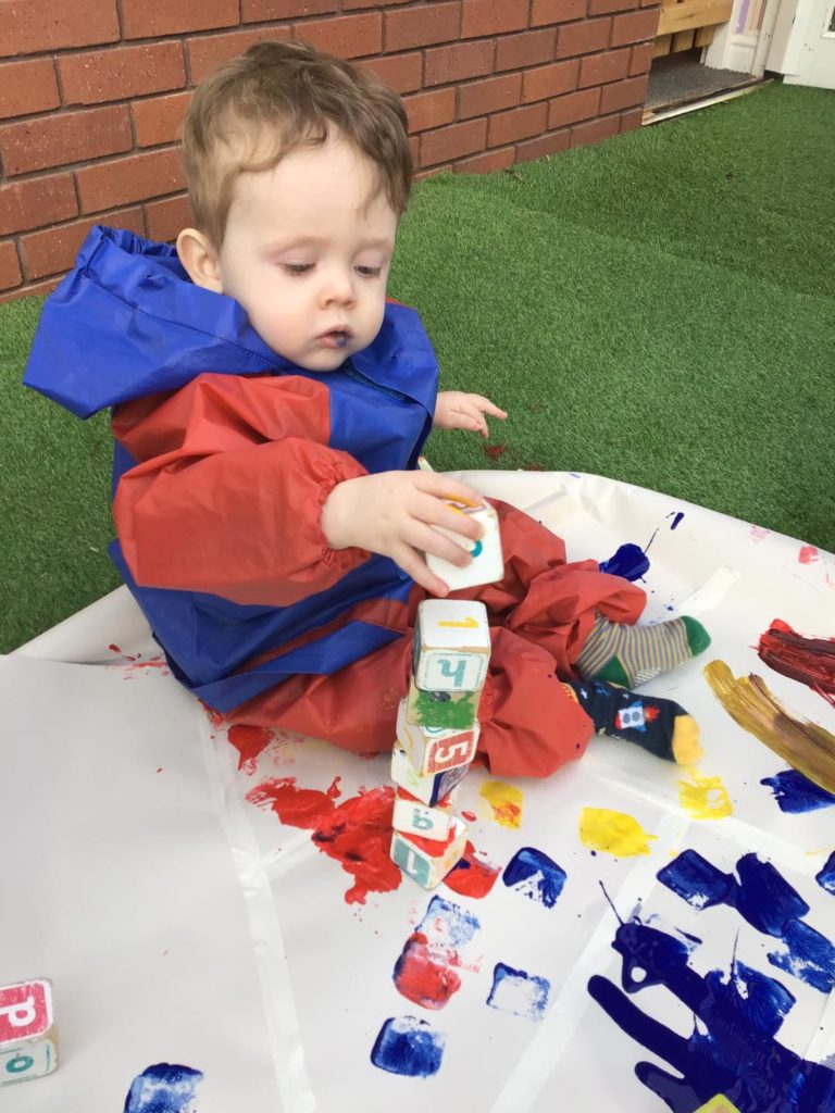 Our babies show great interest in building and painting at the moment. We therefore introduced painting in our outdoor environment, where they made marks with the blocks in the paint, built big towers and explored paint on their hands. The babies enjoyed the feel of the paint on their hands and loved seeing the different marks they could make on the panels using their fine motor skills.