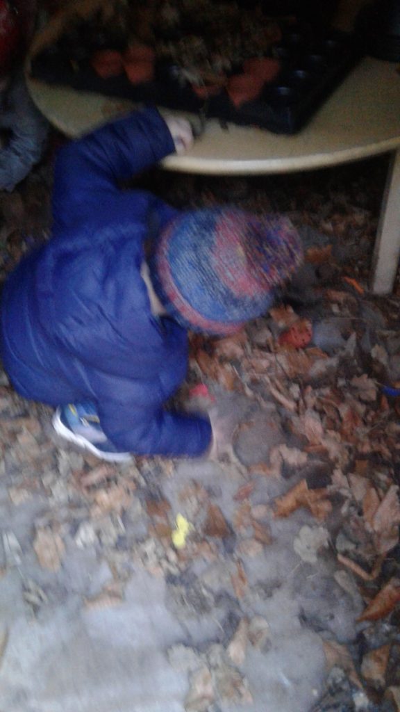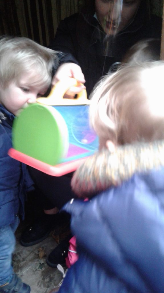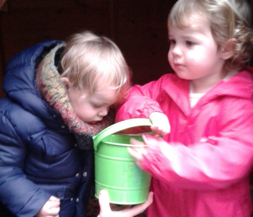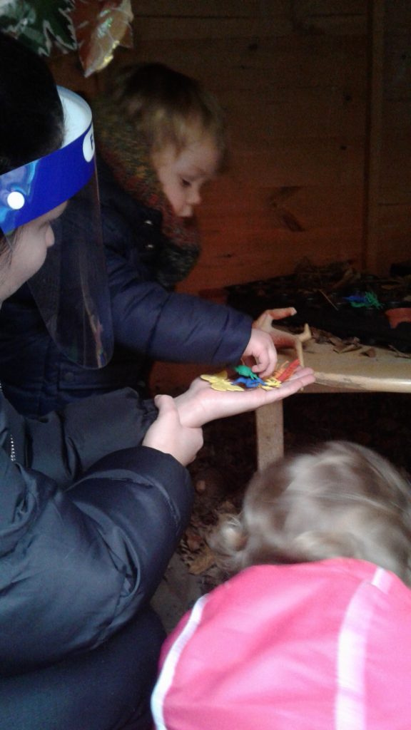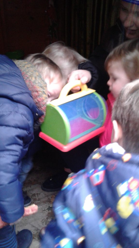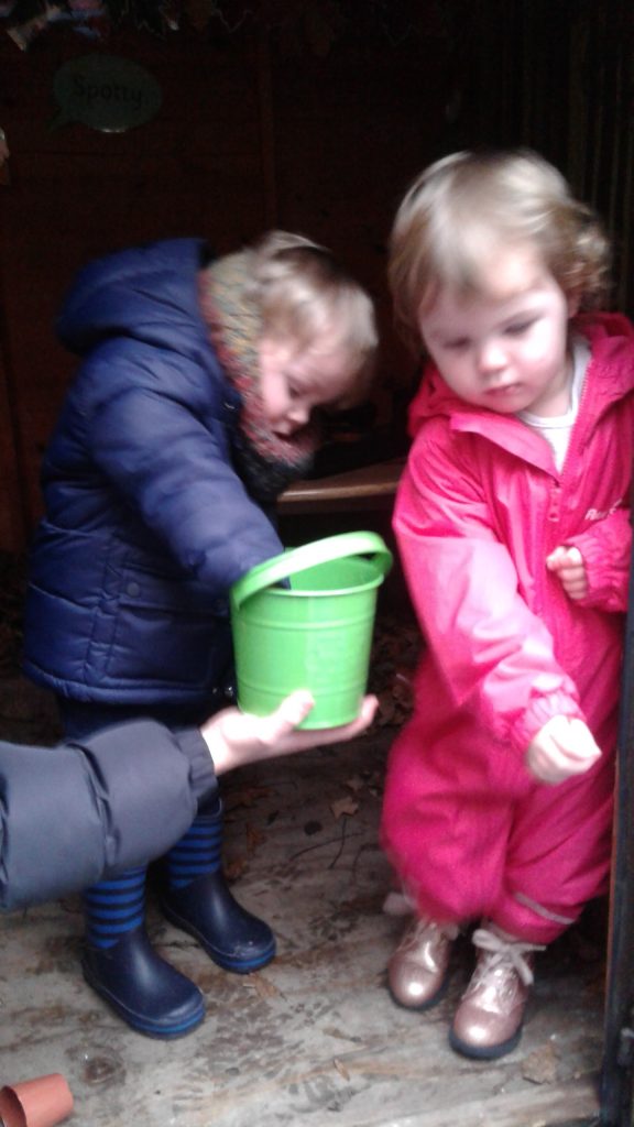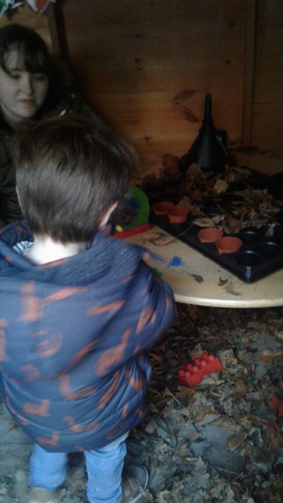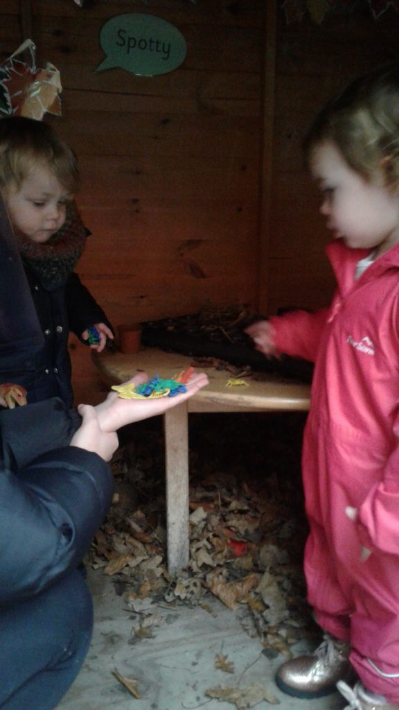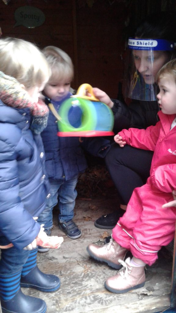 In our nature hut environment, there is so much for them to see, explore and learn. The natural environment of leaves, potting compost and plants makes it an incredibly stimulating and multi-sensory place to play. We have been planting pumpkin seeds, hunting for bugs in the treasure basket and the leaves.  We’ve also enjoyed smelling the herbs while watering them and helping them to grow.