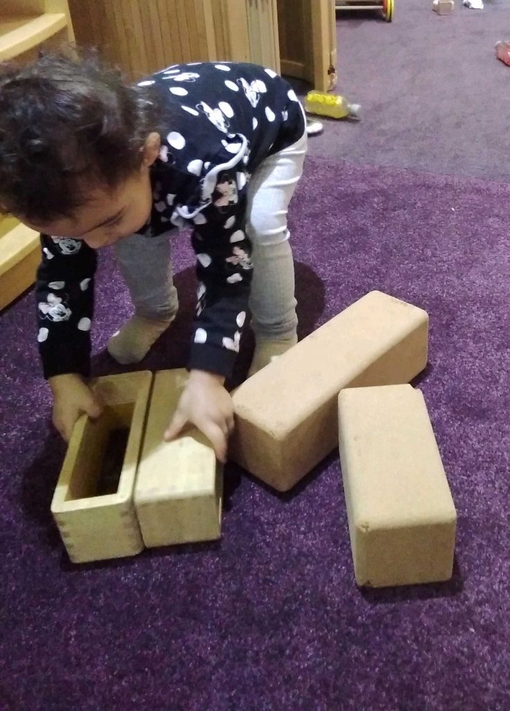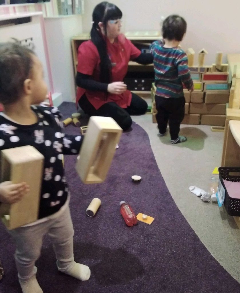 Whilst playing, one of the children asked Miss Mia if they could build a house. Everyone thought this was a great idea. So, as a team, the children hunted round the room for objects and building materials they could use to construct the house.