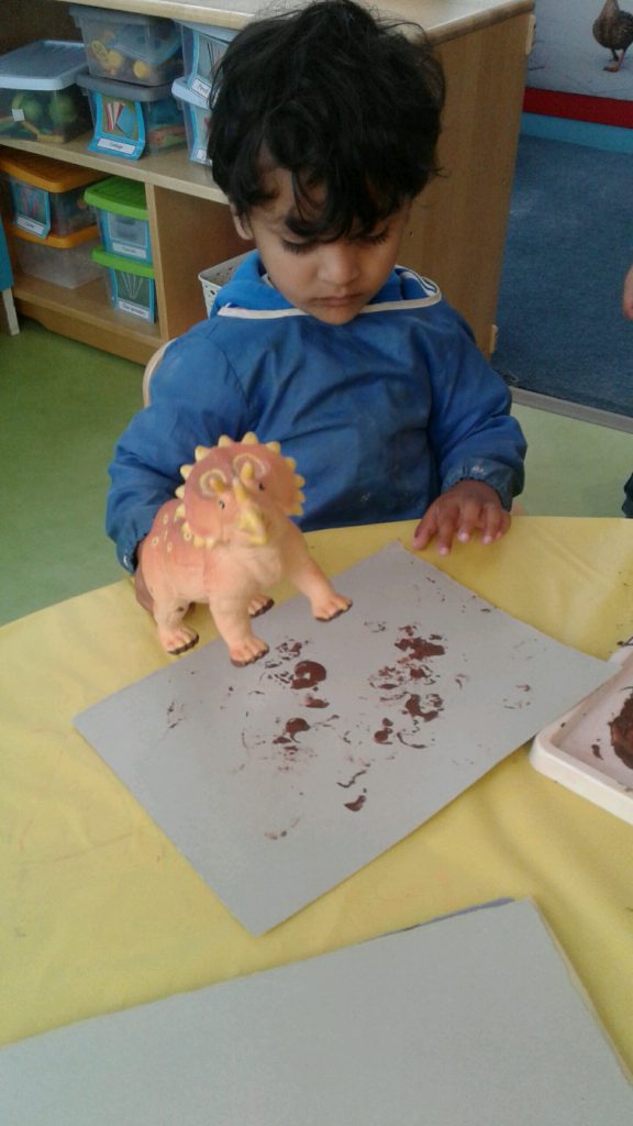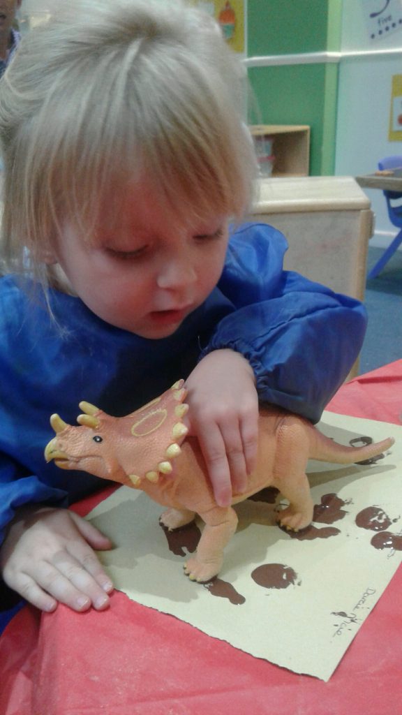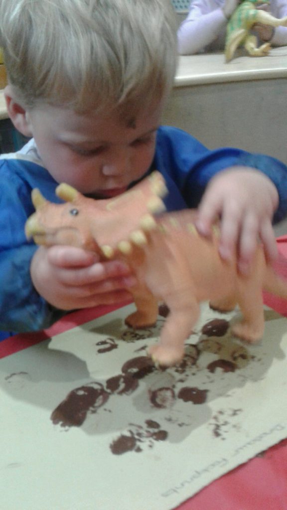 After hearing the story, the Peter Rabbits had so much fun with their own dinosaur activities. They made their dinosaur footprint marks using ‘real life’ dinosaurs to tread in the oozing mud and then make prints on the paper. The children loved looking at the footprints the dinosaurs had made.