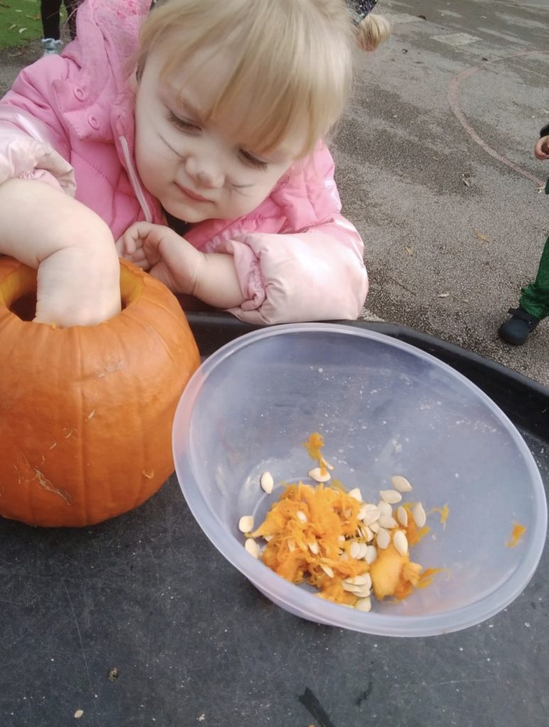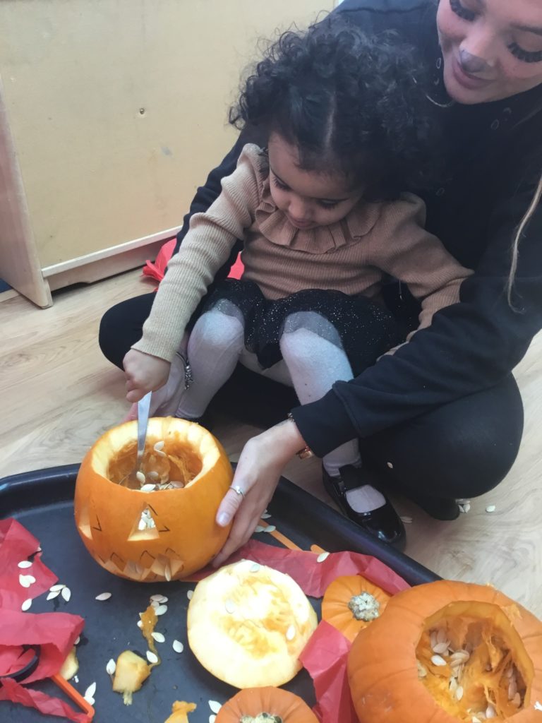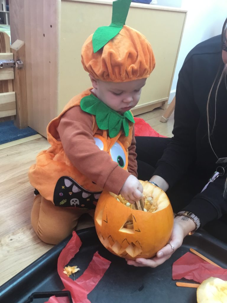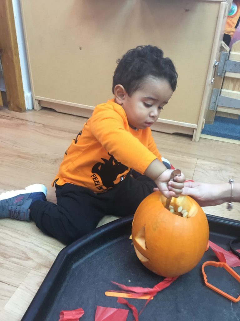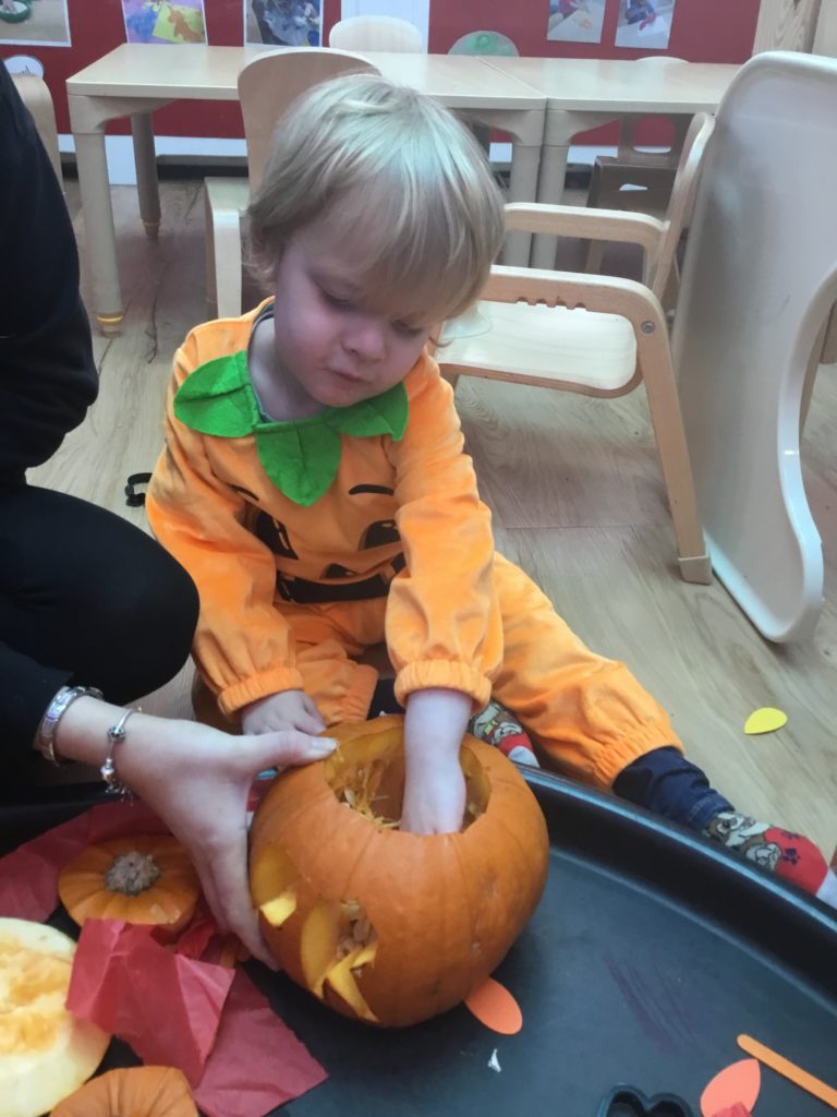 Exploration of pumpkins was the theme of the day at many of our nurseries as the children got involved with carving, scooping out the slimy seeds, playing with the gooey insides, making decorations, painting them and just enjoying the sensory experience of touching the smooth skin. At Buckinghams the children were delighted to share with their friends the wonderful pumpkins they had carved at home, whilst at Meir Park, the children had fun going on a pumpkin hunt.