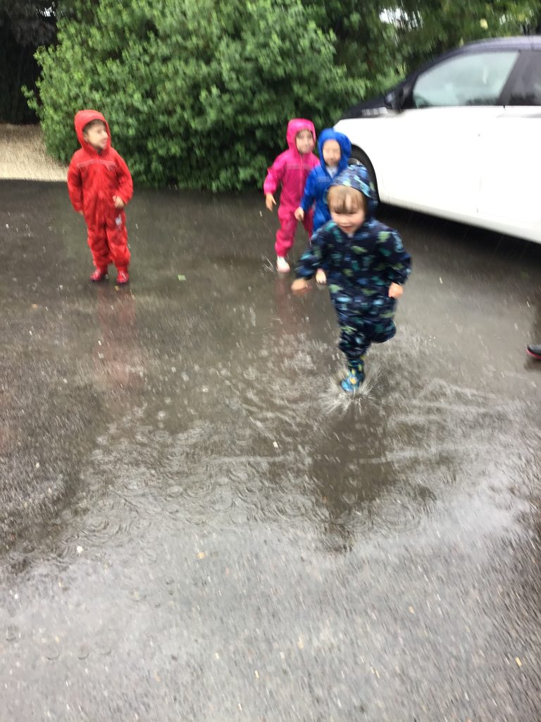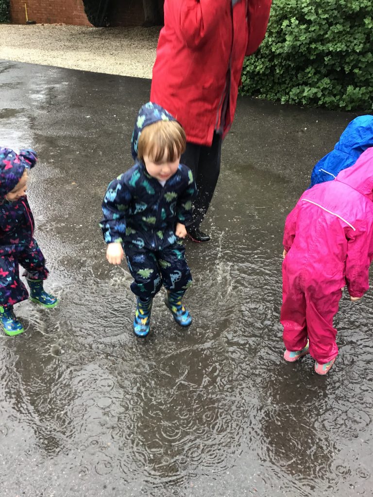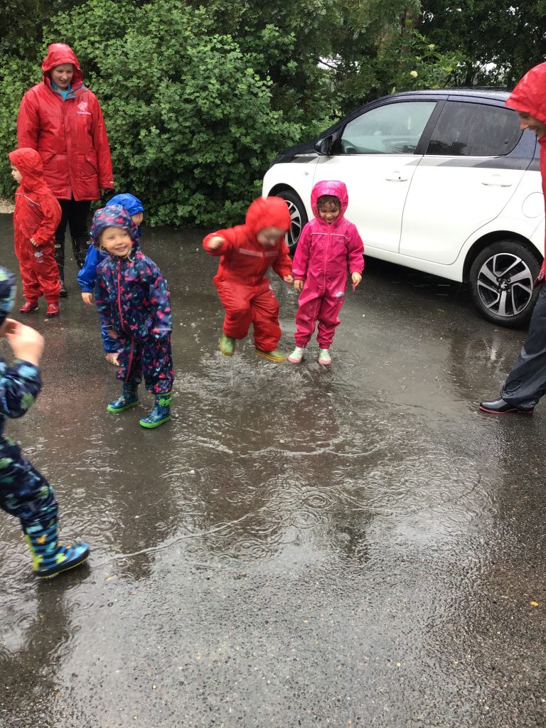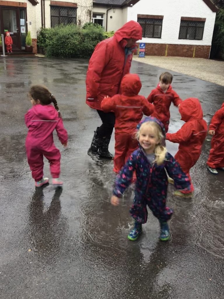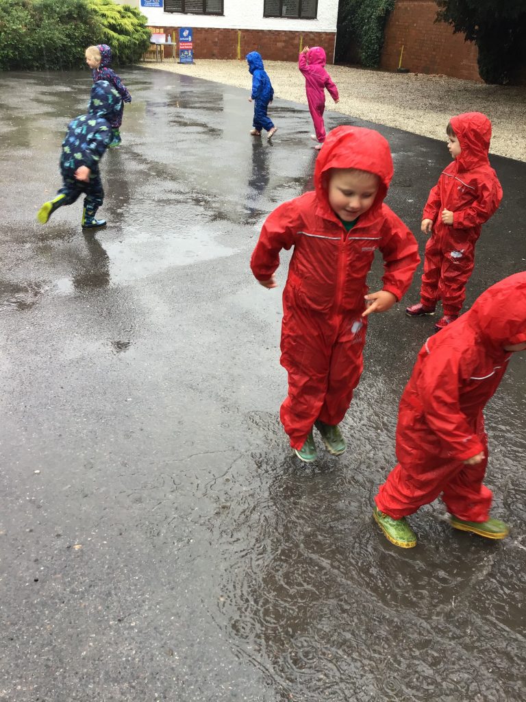 Reminding us all of the saying that there’s no such thing as bad weather, only inappropriate clothing, the children at Newark donned their waterproofs and wellies and raced outside for a quick stomp about in the rain.