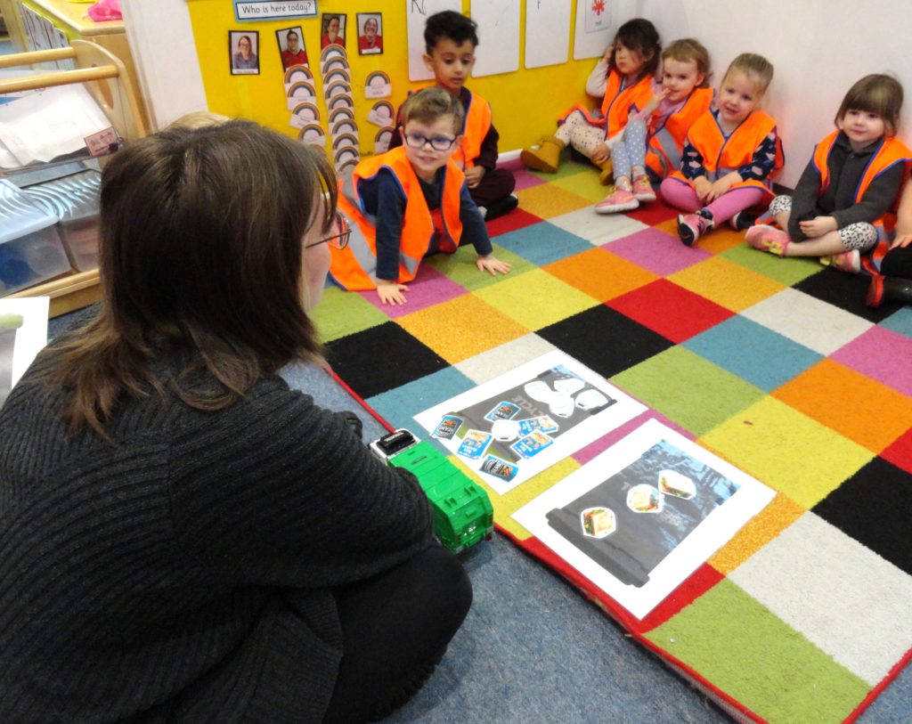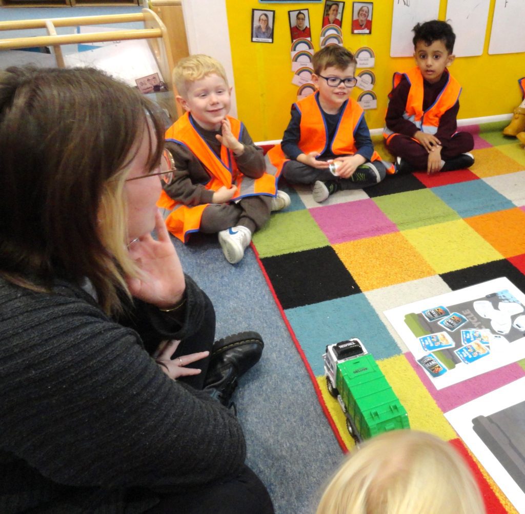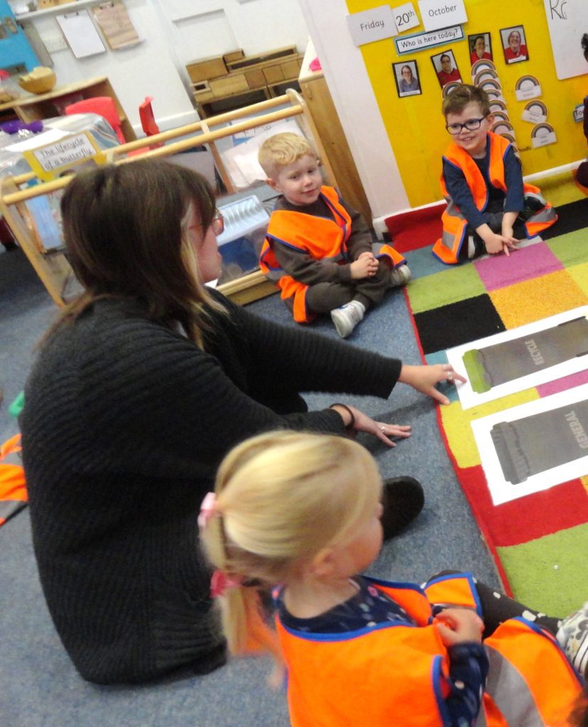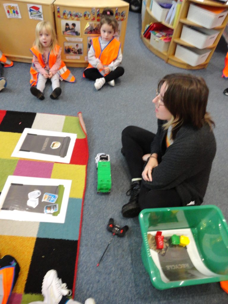 The children were all given special Hi Vis jackets to wear and Erin explained that the Hi Vis jackets help people, such as the bin and recycling collectors, be seen and stay safe.