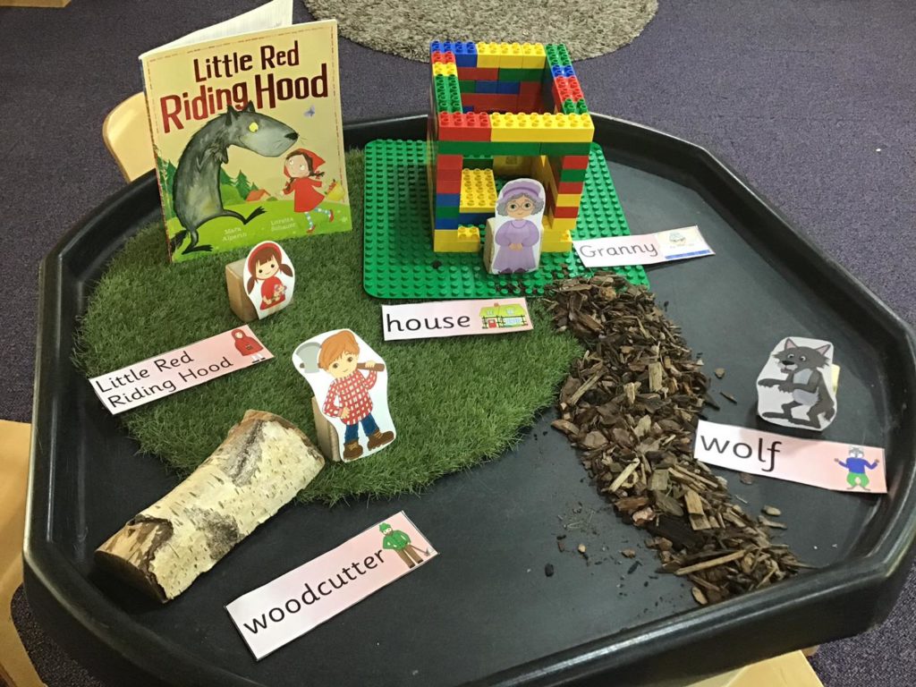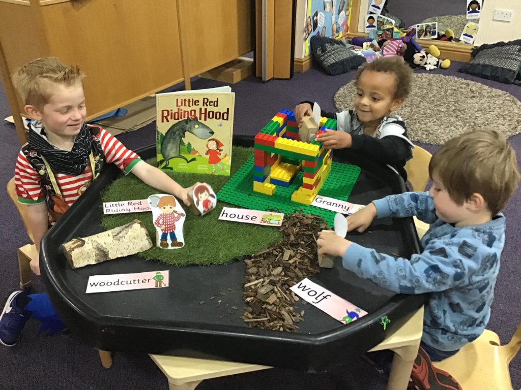 The children were soon immersed in their Little Red Riding Hood tuff-spot. The children made their own house using the Duplo and used the items in the tuff-spot to act out roles from the story with their friends.