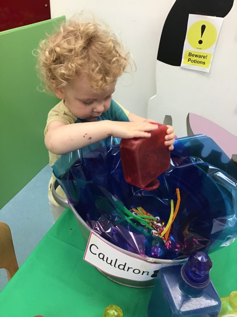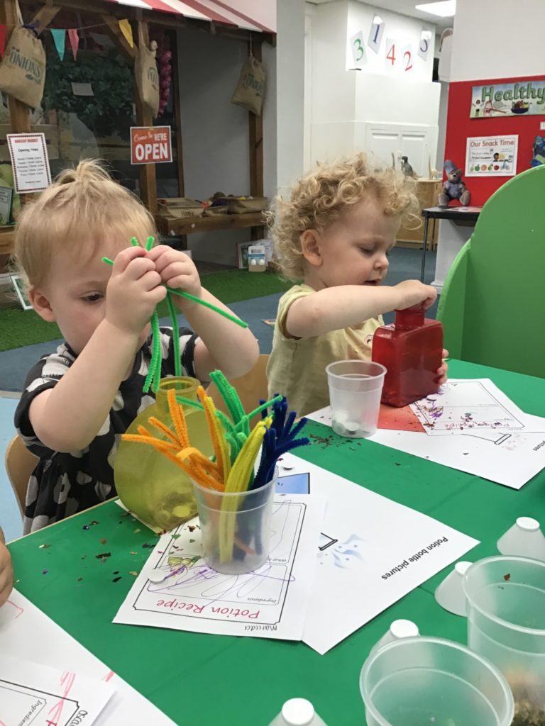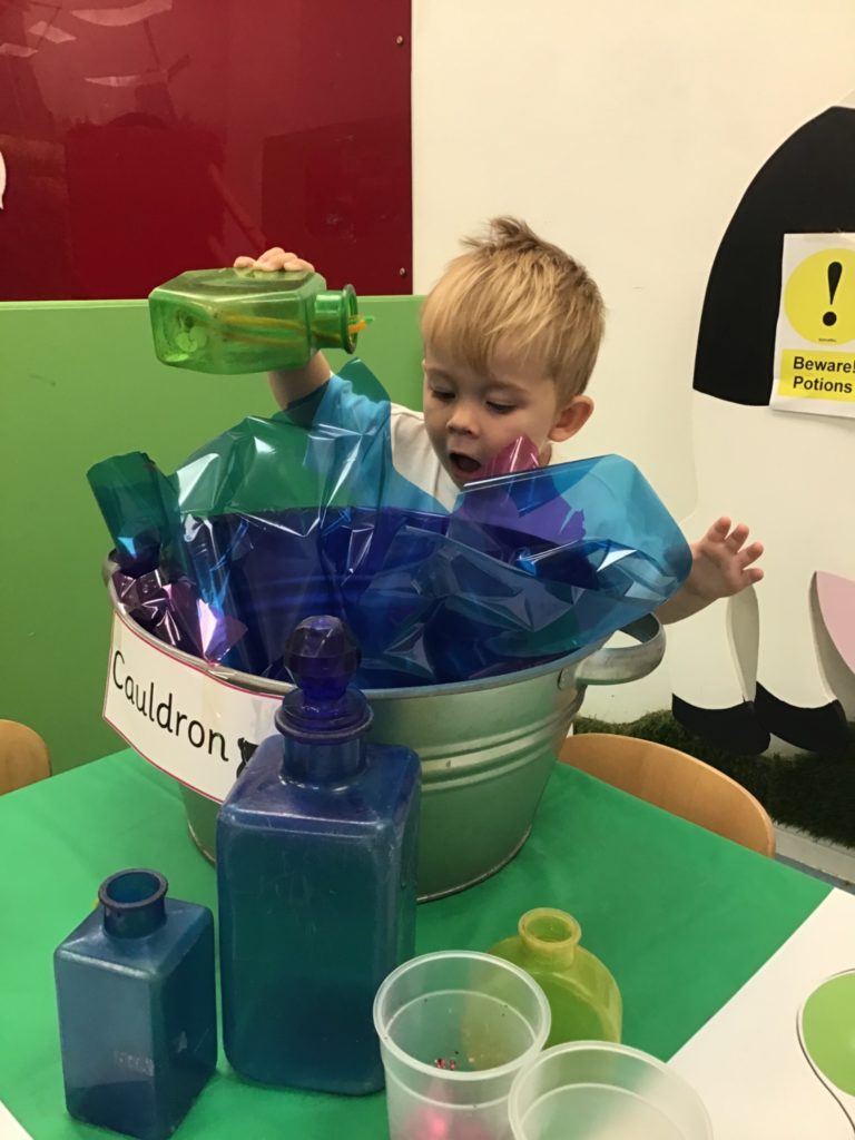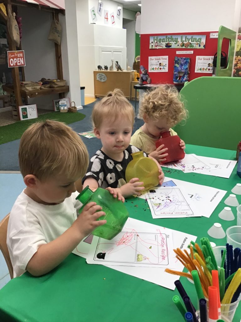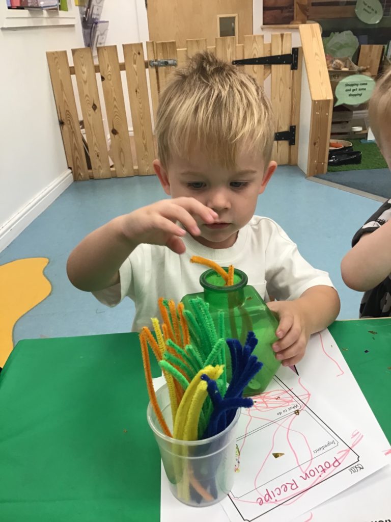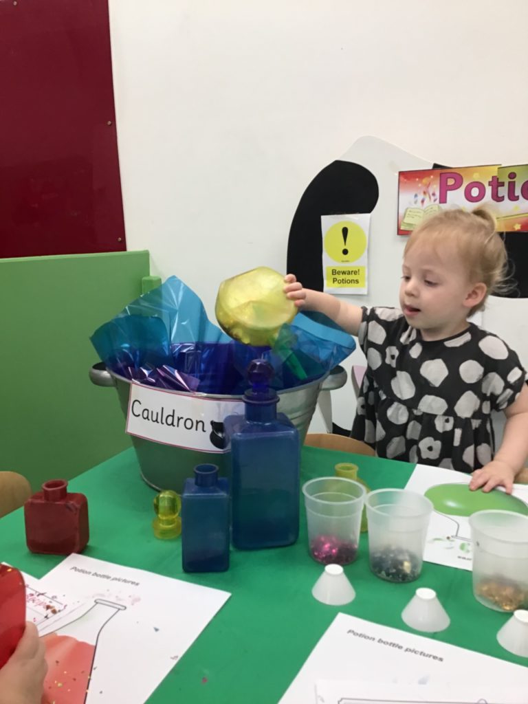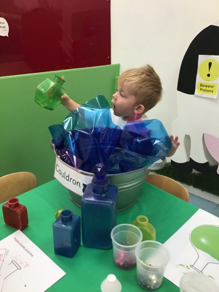 The children had so much fun helping the witch create special potions to pour into the cauldron to help fix her broomstick. Firstly, they filled out their potion slips using a range of colourful marks. They then got creative using a range of colourful glitter, pipe cleaners and googly eyes to put in their bottles. Individually they poured their very own potion into the cauldron.
