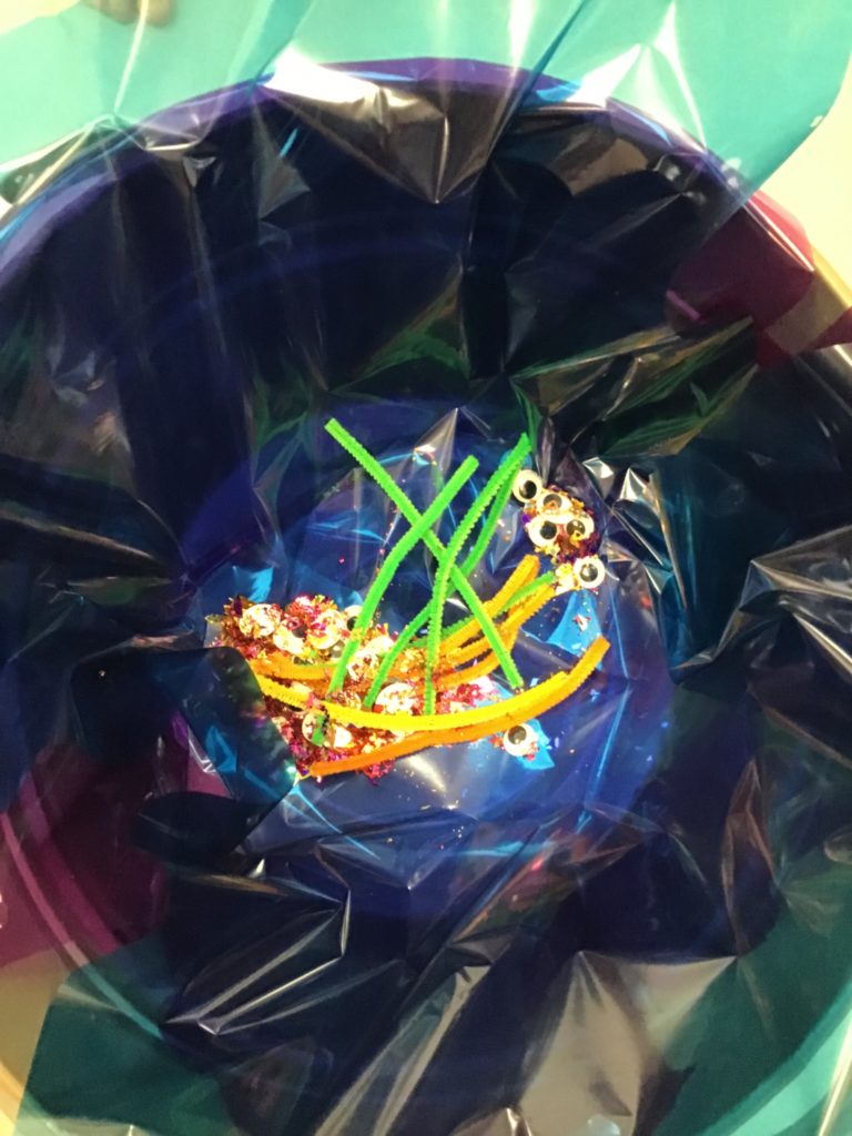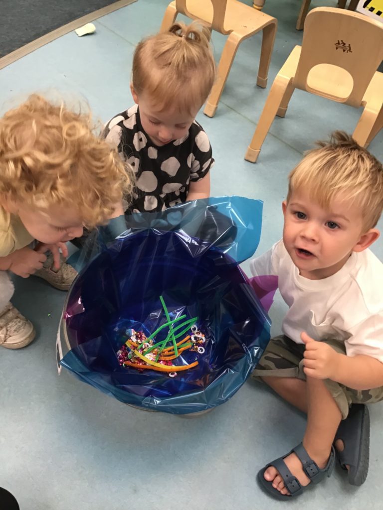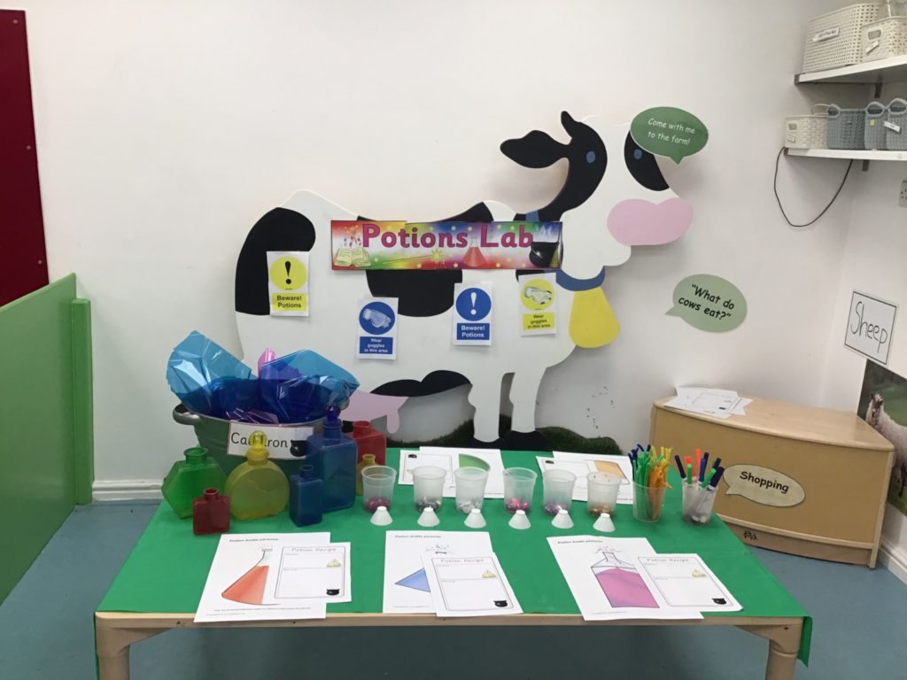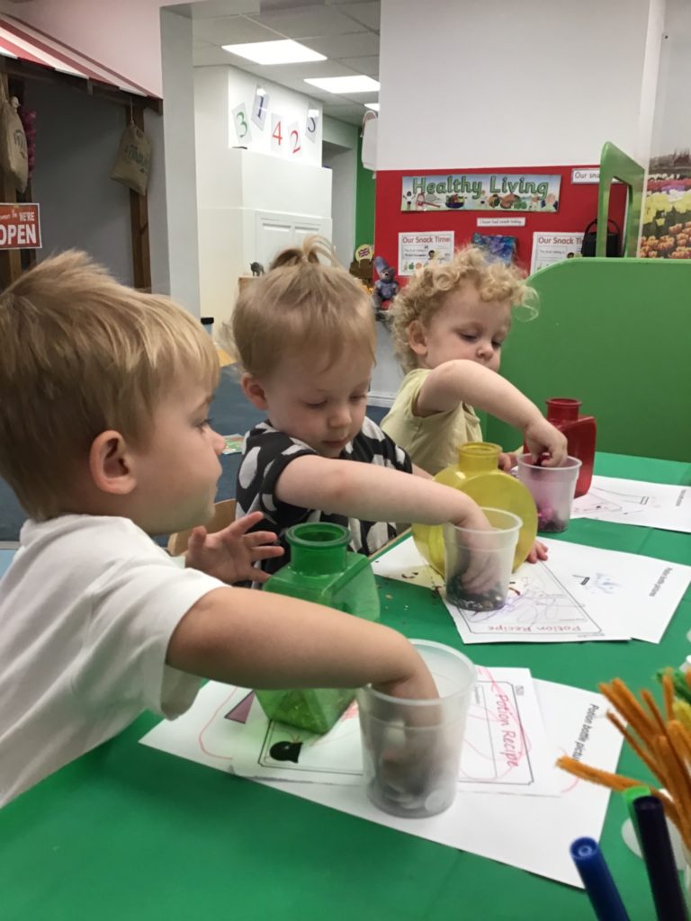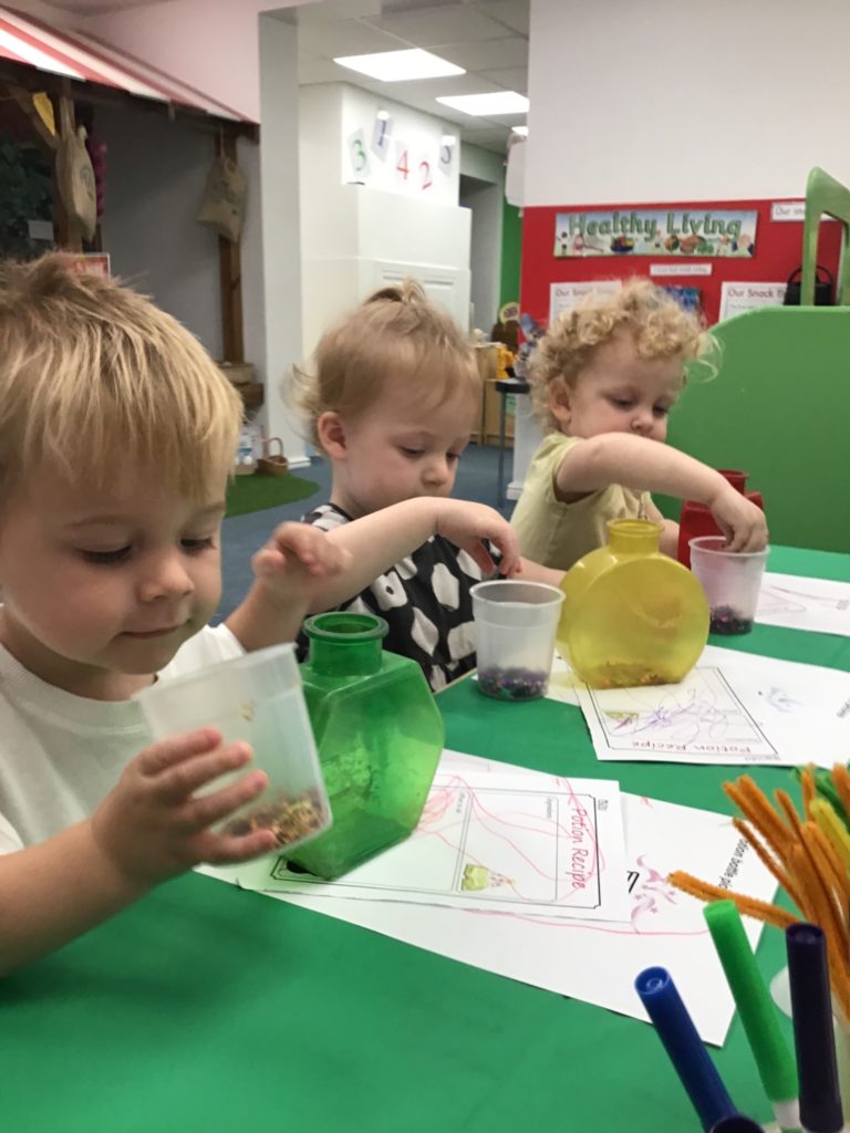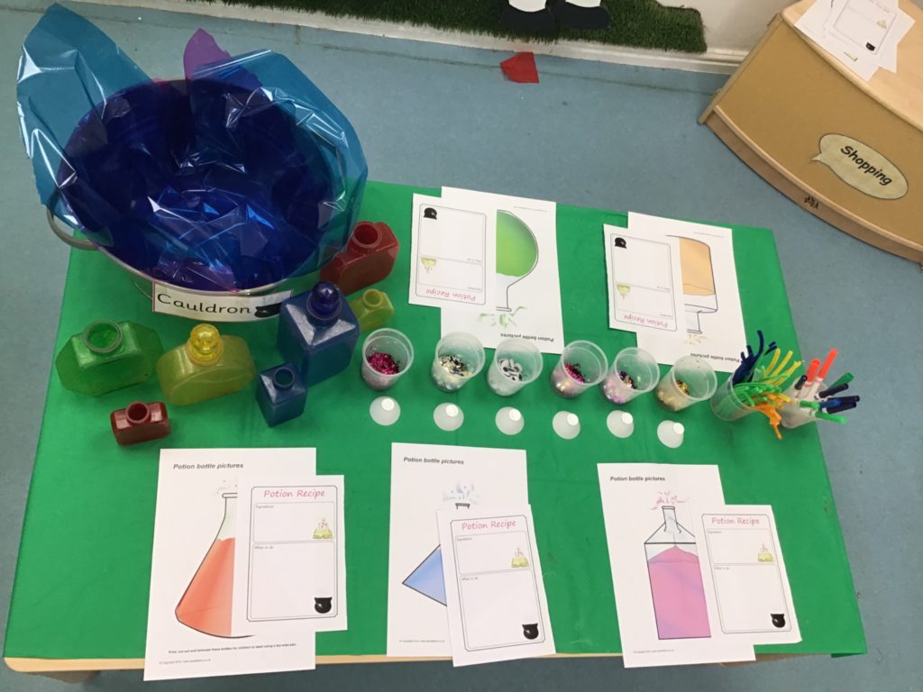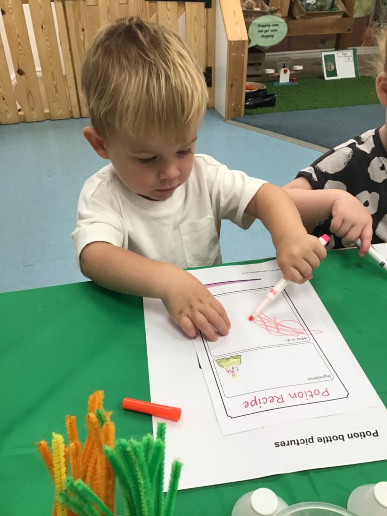 The children had so much fun helping the witch create special potions to pour into the cauldron to help fix her broomstick. Firstly, they filled out their potion slips using a range of colourful marks. They then got creative using a range of colourful glitter, pipe cleaners and googly eyes to put in their bottles. Individually they poured their very own potion into the cauldron.