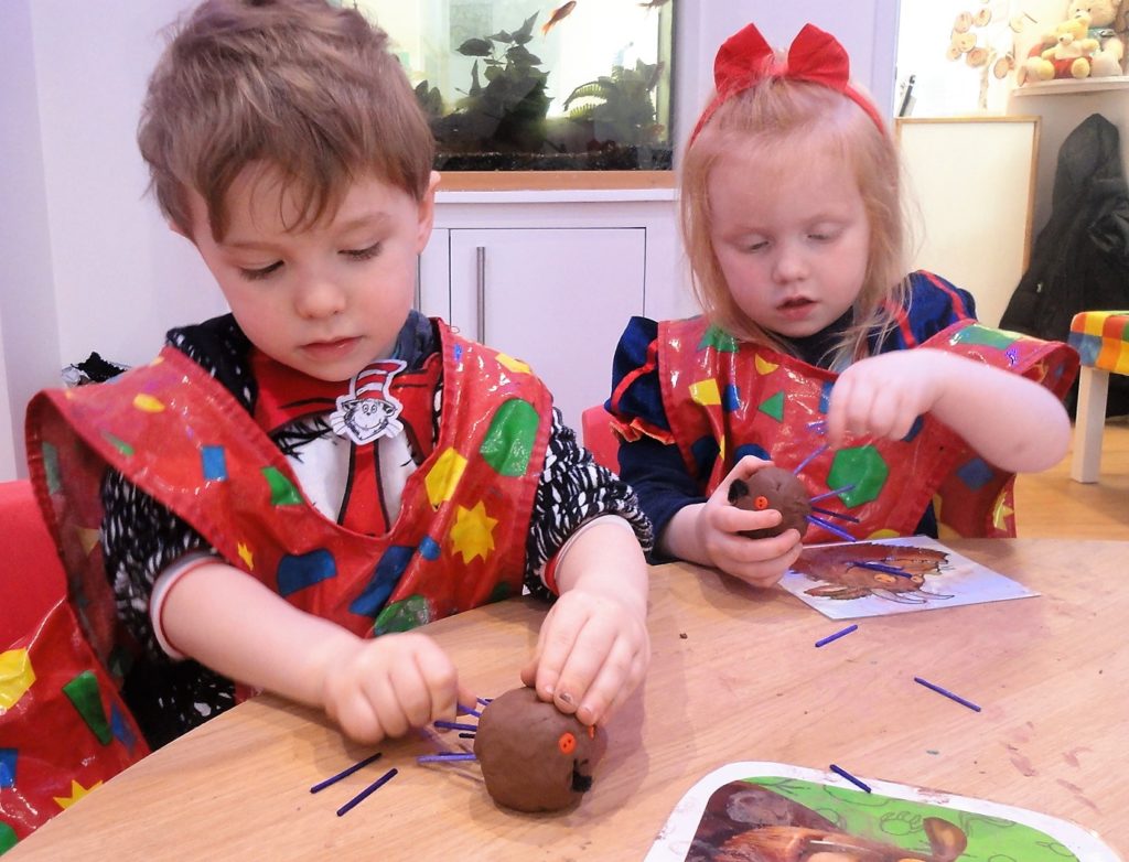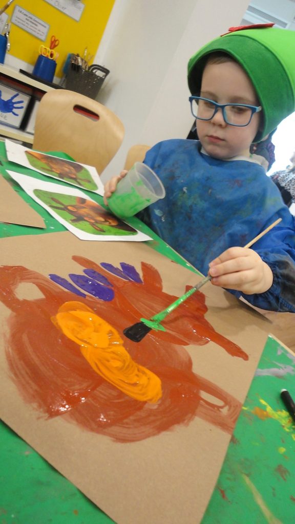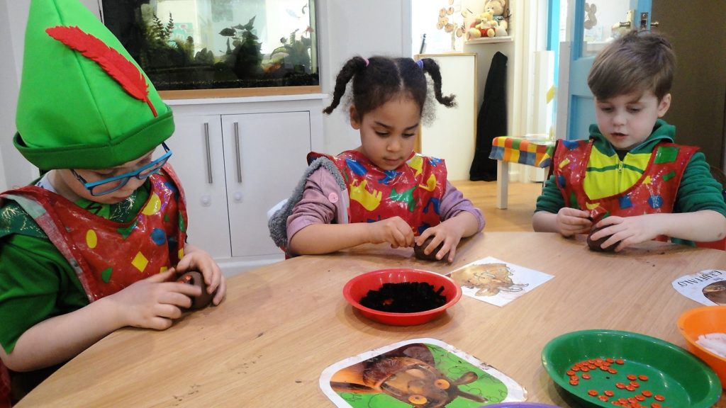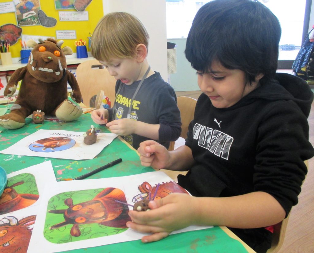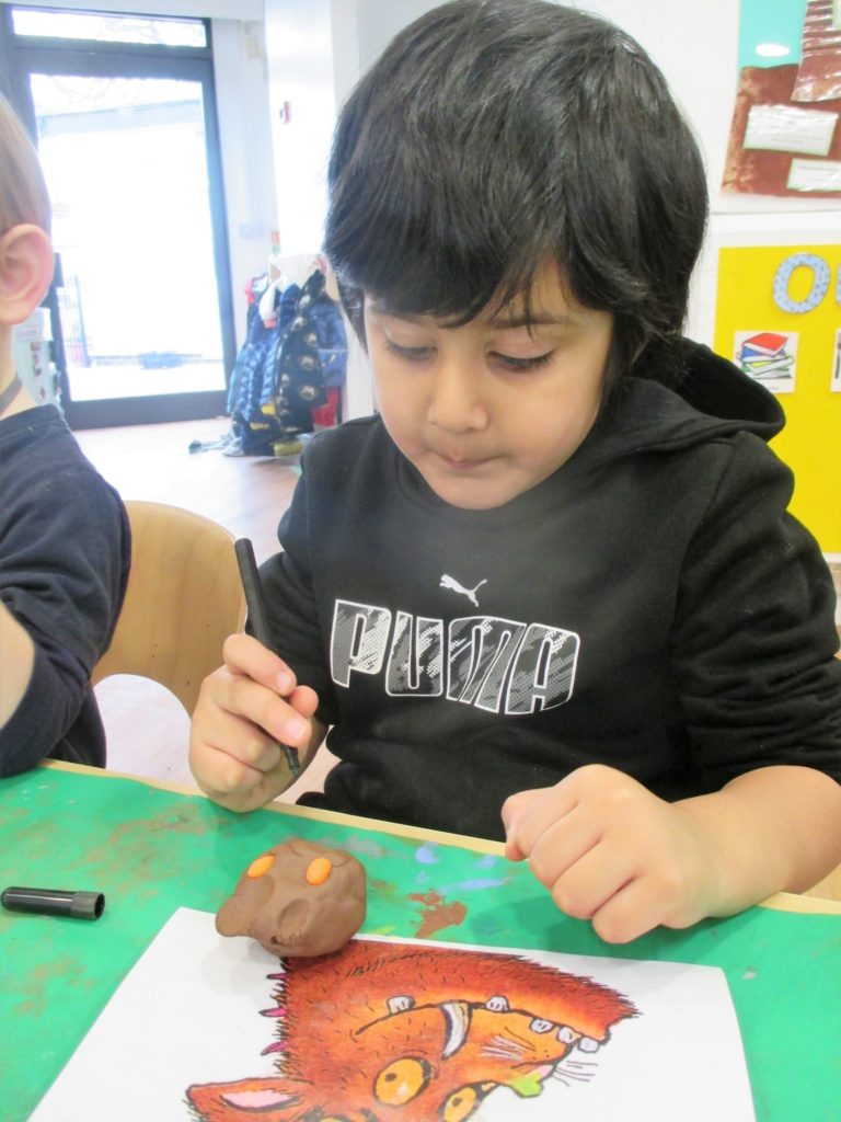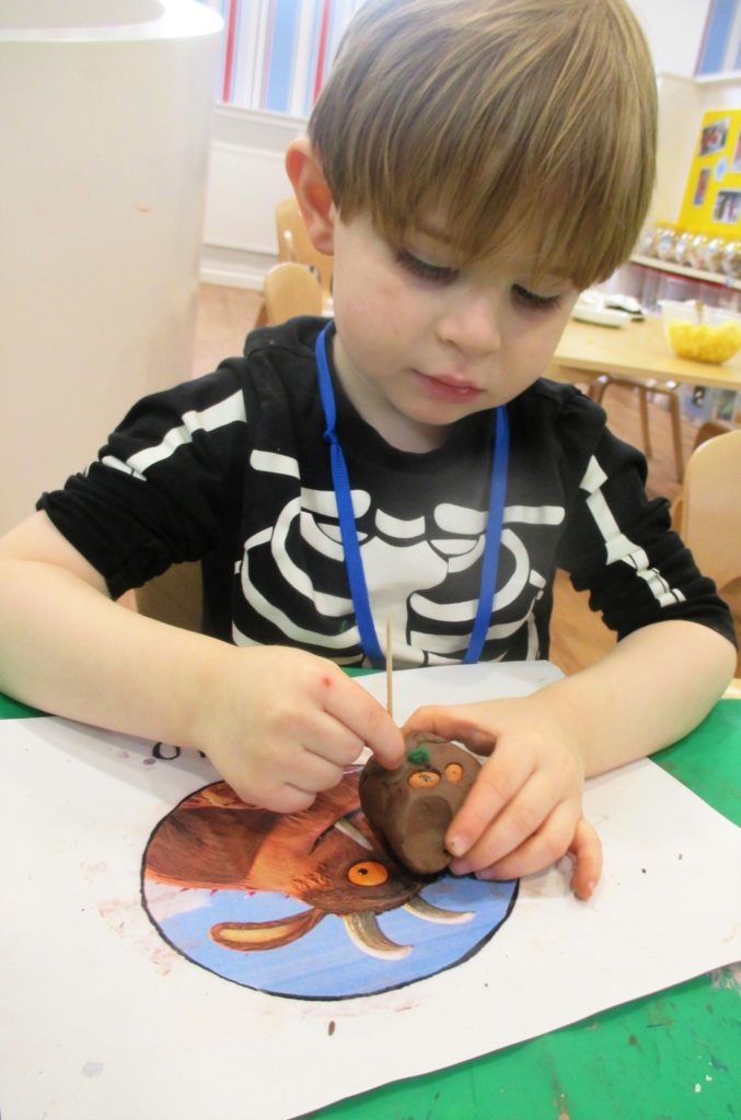 They participated in a variety of activities related to the story including using props and puppets to re-tell the story, painting the Gruffalo, making Gruffalo crumble and owl ice cream trays and making their own Gruffalo’s from clay.