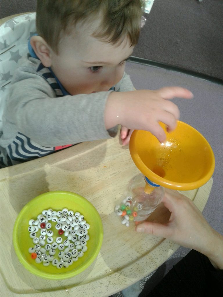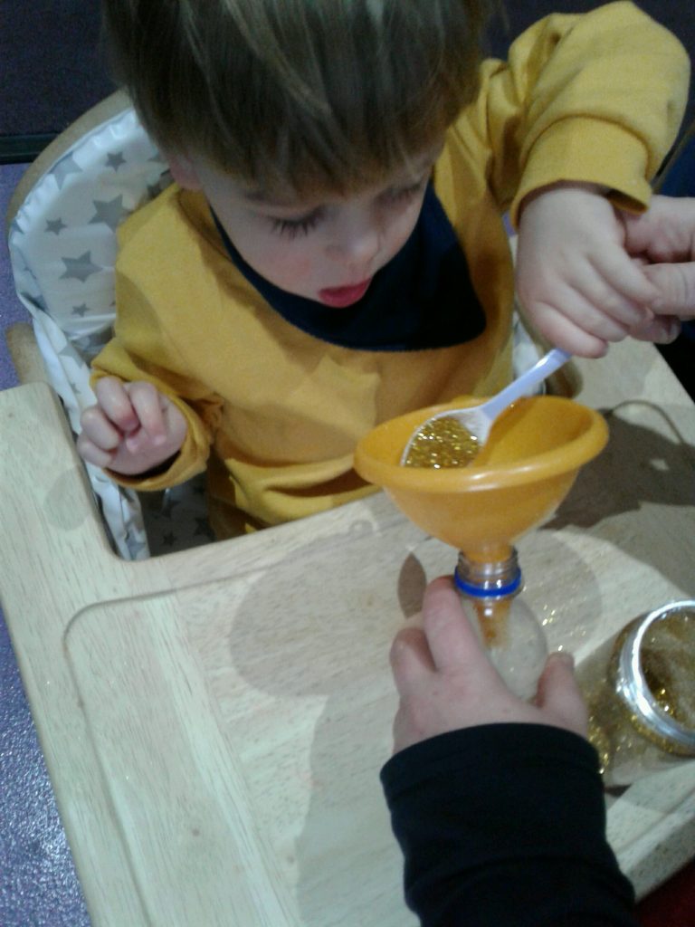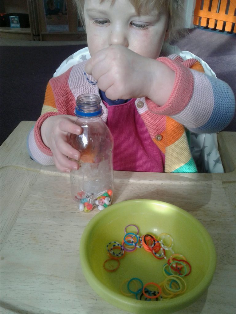 The children made their own sensory bottles by using their fine motor skills to pick up the objects to place inside. They concentrated and persevered so well as they tried to put the objects into the bottle making sure they got it in. Some of the children used a spoon to scoop up the items. The bottles made great shakers!