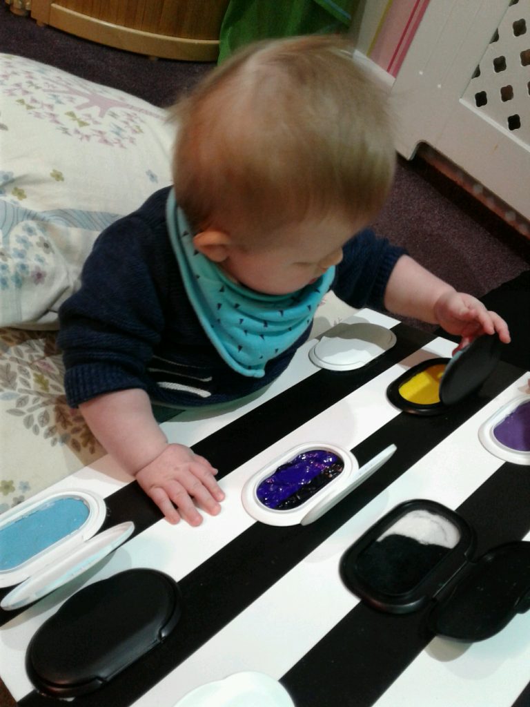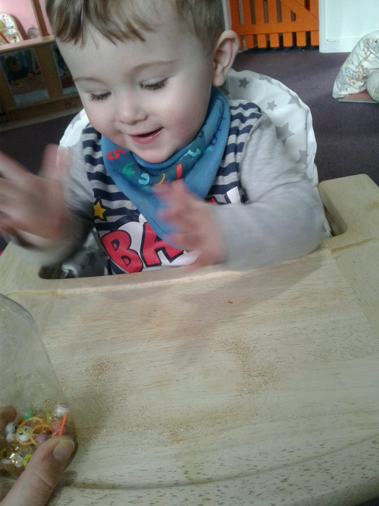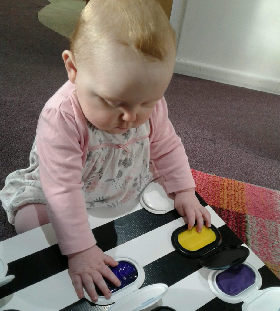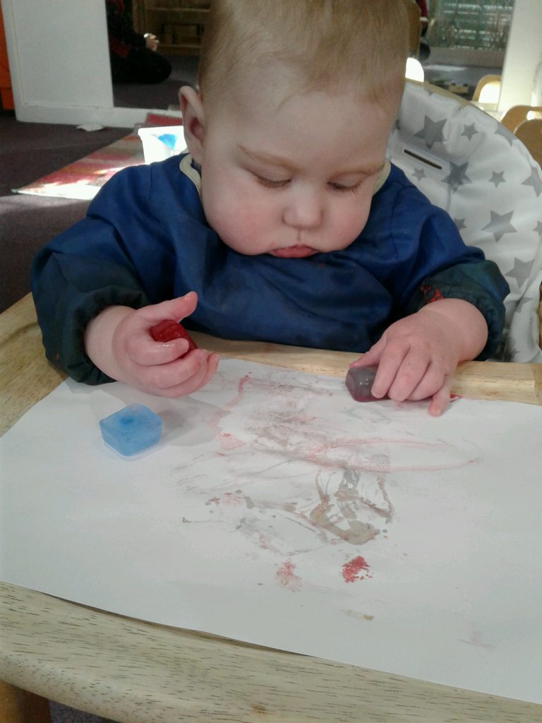 Finally, the children explored the feel of cold ice on their hands. The ice was coloured so that as it melted, it made colourful marks on the paper. As the babies moved the ice, they noticed the different marks it made on the paper.