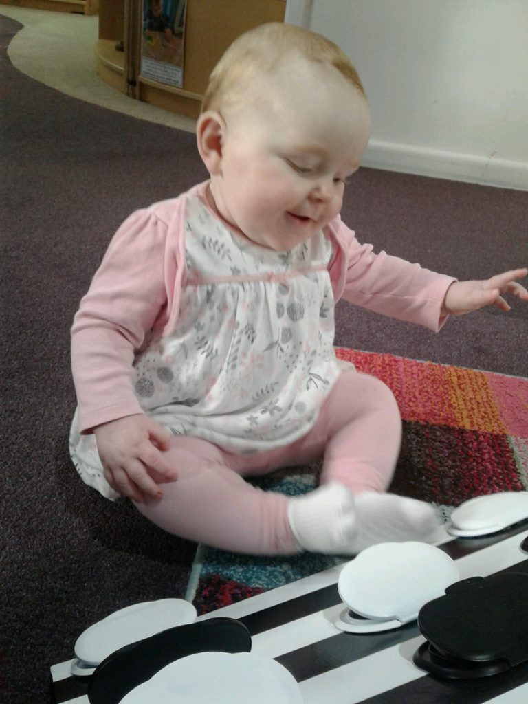 The staff used recycled resources to create a touch and feel sensory board for the children to explore. Each flap contained a different textured material for the children to feel. The babies really enjoyed lifting the flaps and seeing what texture was inside.