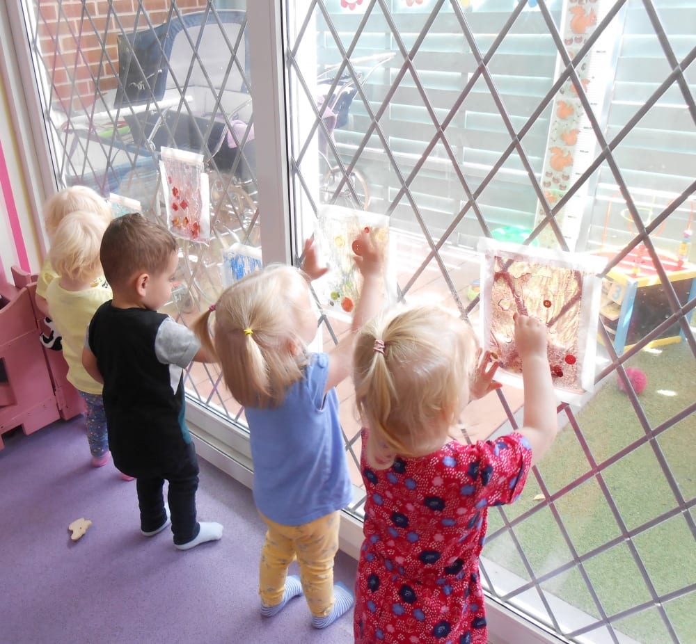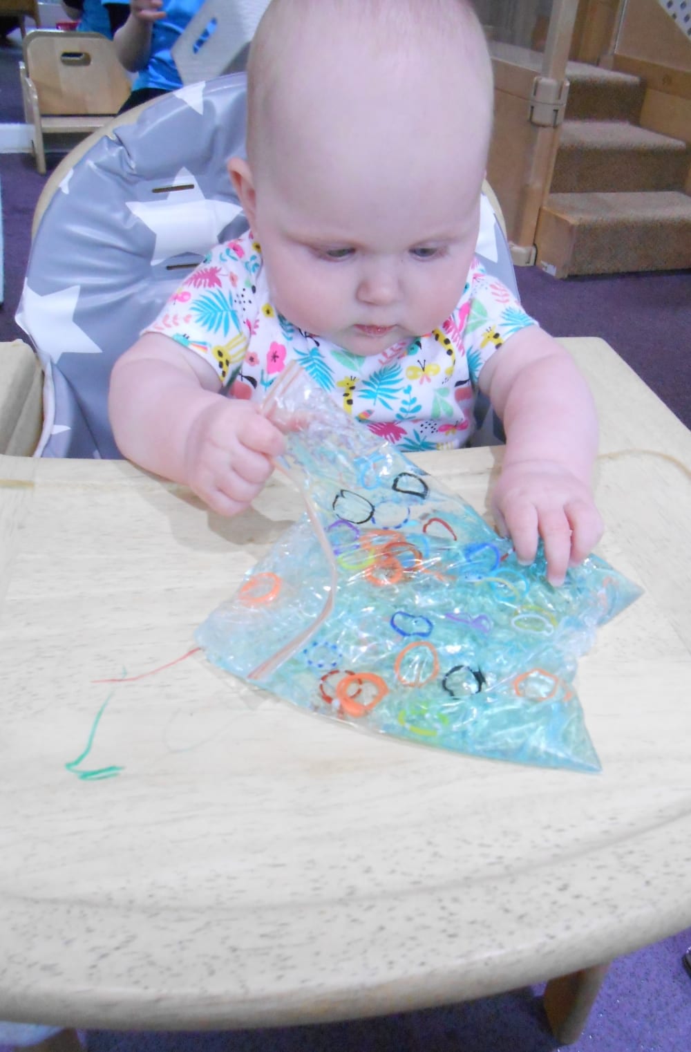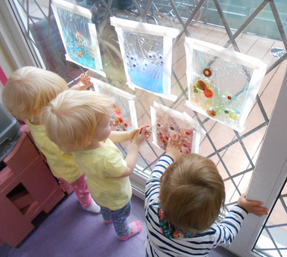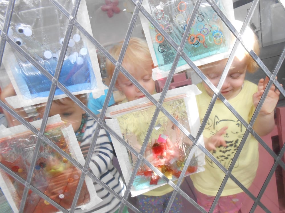 Finally, the children had fun with some sensory bags. The bags were placed on the windows so the light would show the bright colours. The children really enjoyed feeling the bags and pushing around the different objects inside. Our youngest baby loved the sensory feeling of the cool gel inside the bag pushing her fingers around on the bag. This mess-free sensory play is great for little hands to explore without the clean-up at the end!