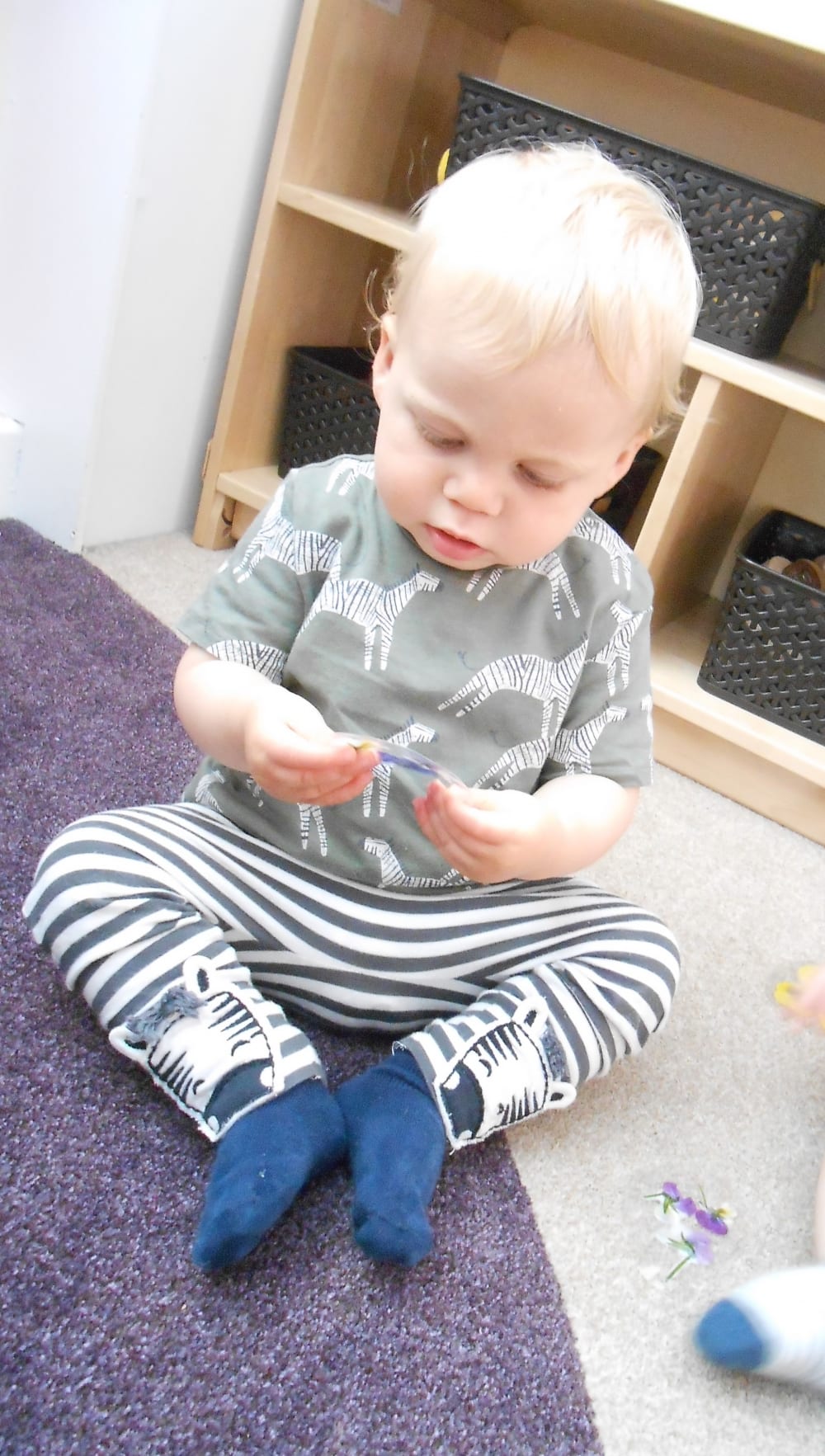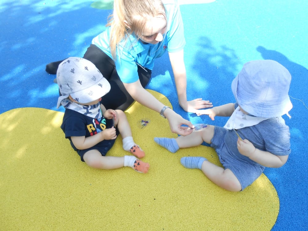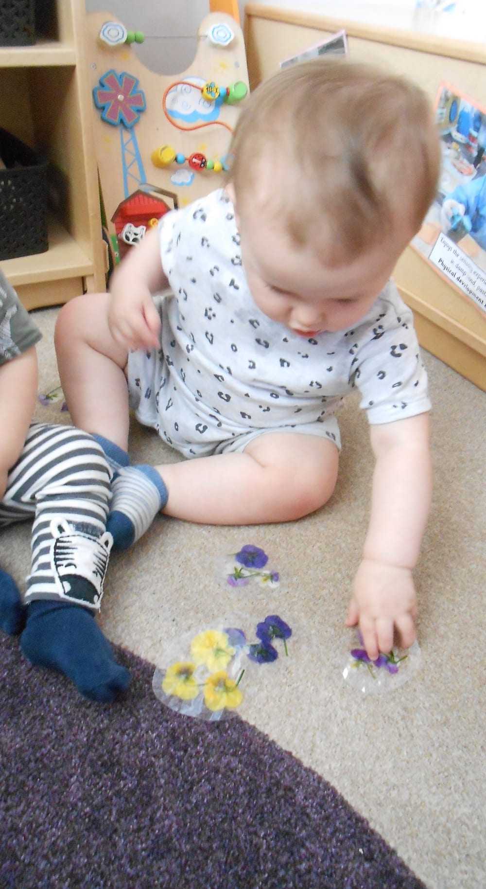 Miss Mia created activities for the Under 2s to help them learn about the world around them and to develop various skills. The children explored four different experiences to help with their development. The activities were: look and feel boxes, edible finger painting, sensory bags and laminated flower exploration.