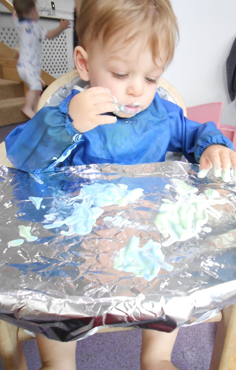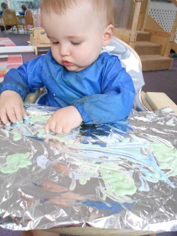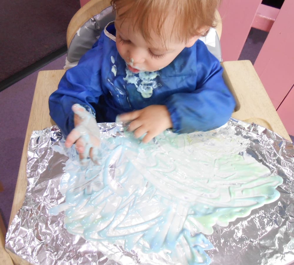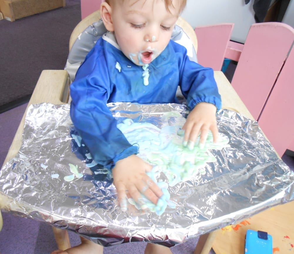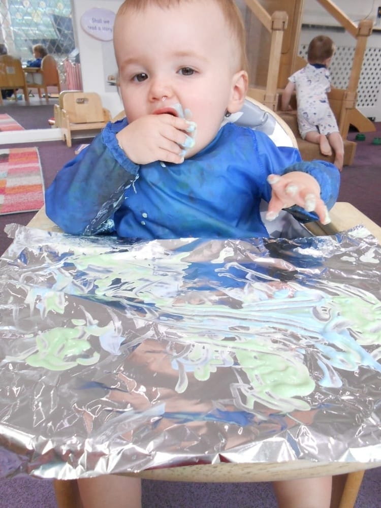 The edible finger painting was a huge hit with two of our babies. The finger paint was made using natural yogurt with a little food colouring to add some colour. The edible finger paint was then placed on a sheet of foil. As the babies moved their fingers around in the edible paint the foil made a ‘crinkling’ sound. They really enjoyed this activity, making different marks in the edible paint whilst having a little taste too!