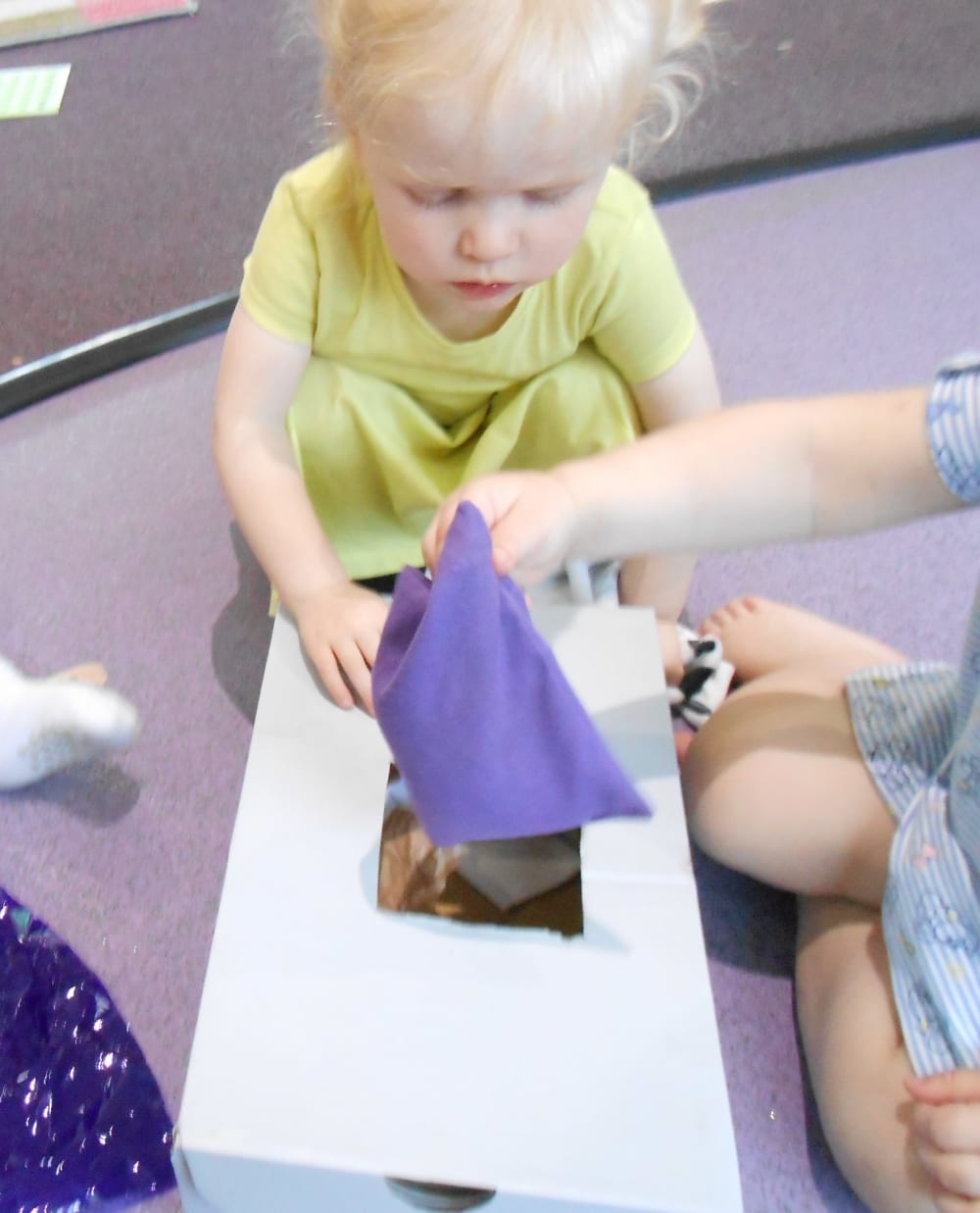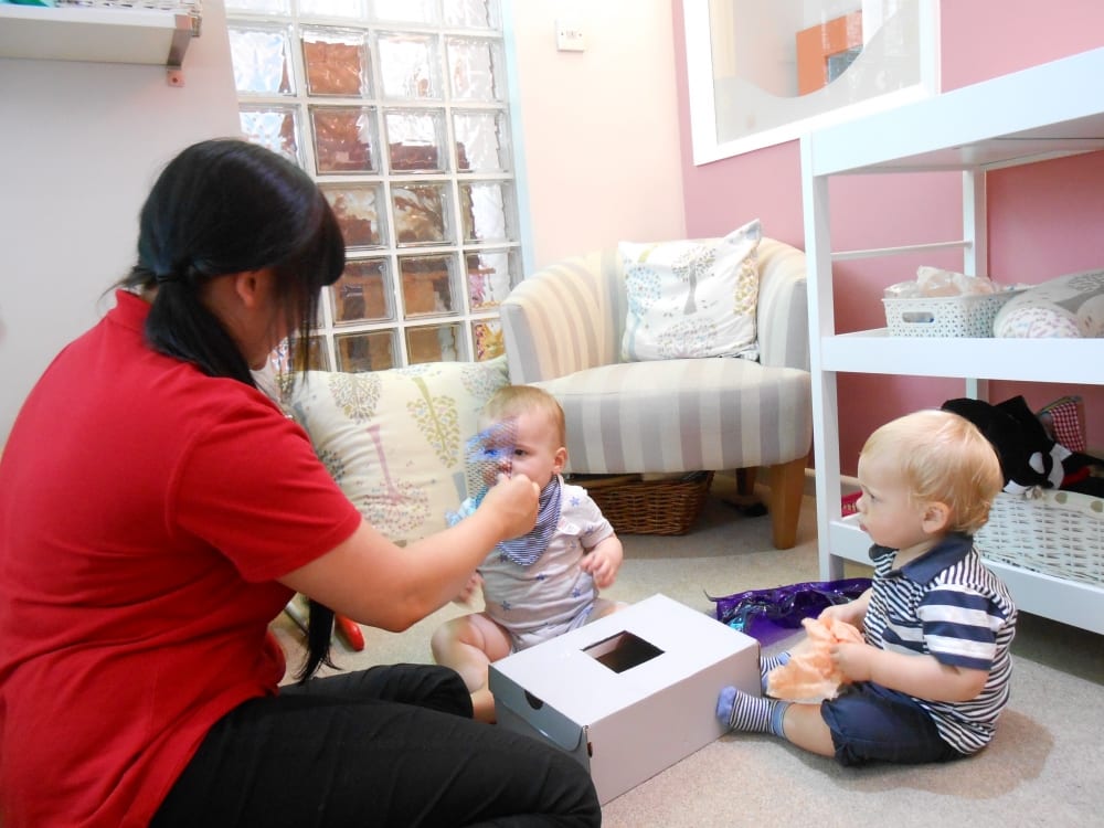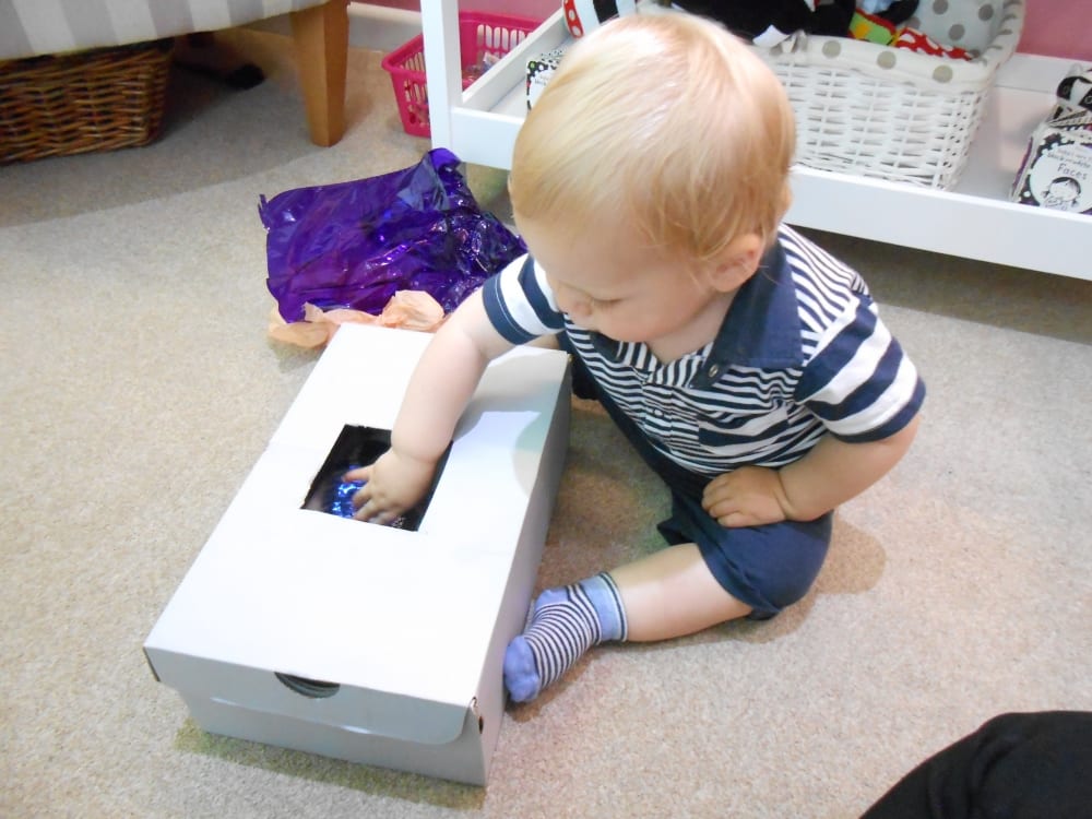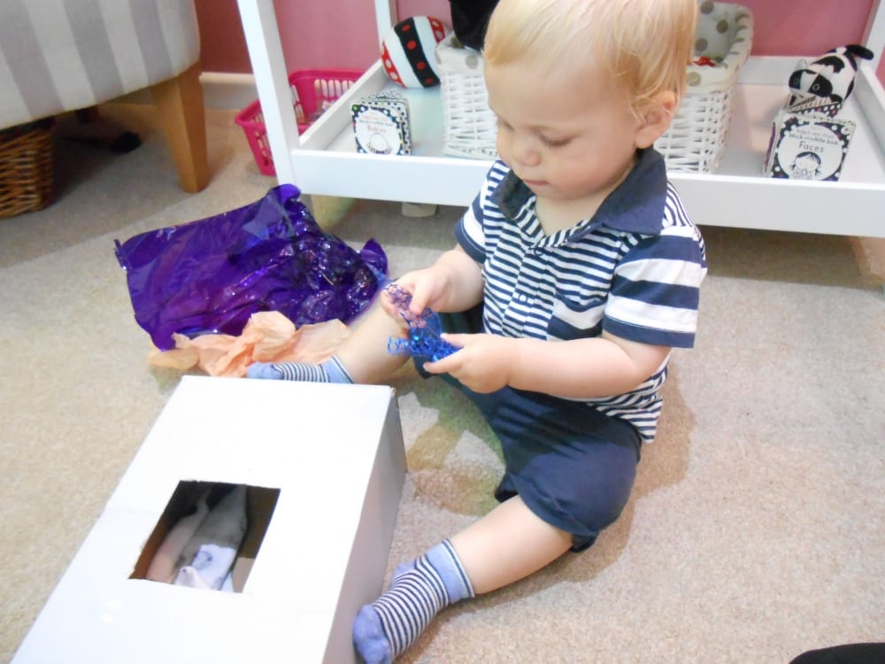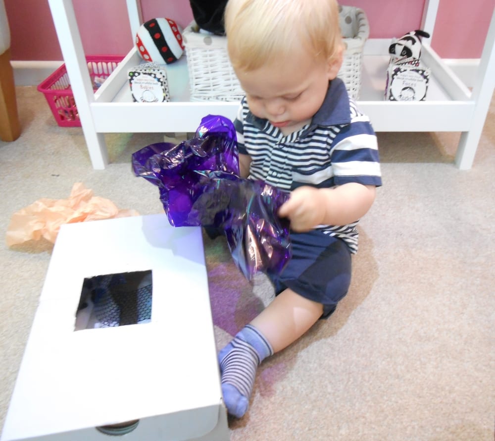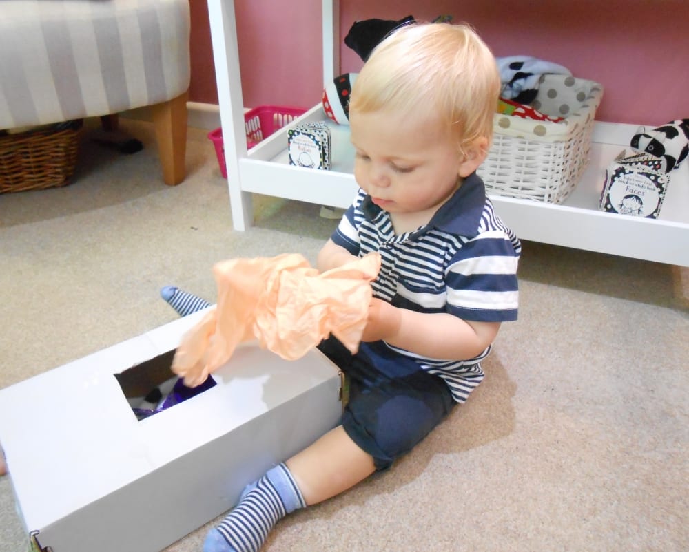The children explored the items within the sensory box feeling the different textures of the materials hidden inside. They placed their hand into the box and felt each item as they pulled it out. In particular the children liked the coloured mesh material as they could look through the fabric and see each other. This activity supports babies’ hand-eye coordination and sense of touch.