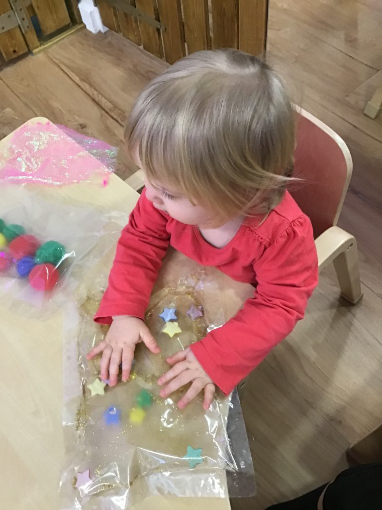All this exploration encouraged speech with the children using single words, sometimes putting more words  together as they played with the materials. For Jack it was a, “Wow!” whilst  Eleanor said, “Shake it, shake it stars!”