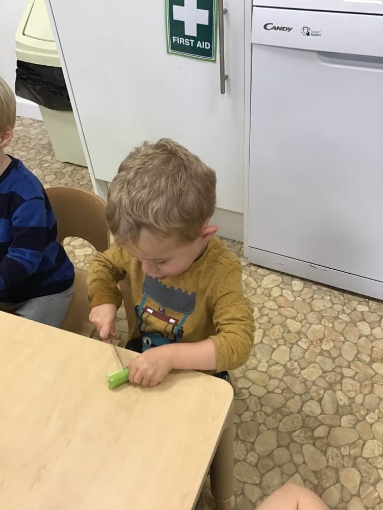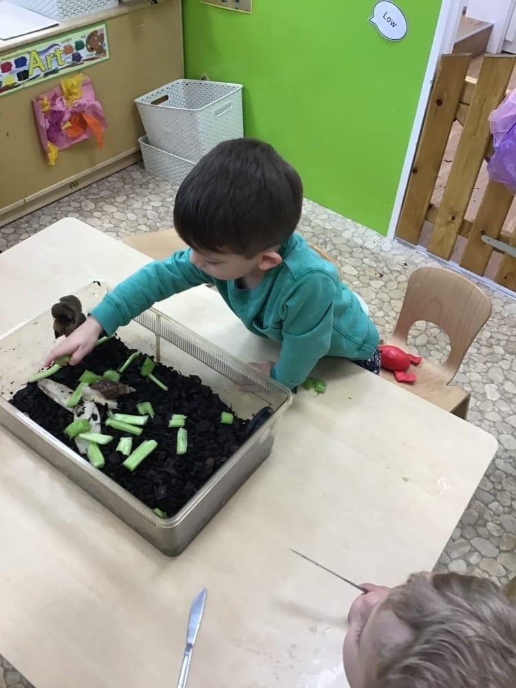 Some children were even brave enough to hold them. We then had a discussion about what the snails would like to eat. We decided on celery which the children then carefully helped to cut up and to feed to the snails.