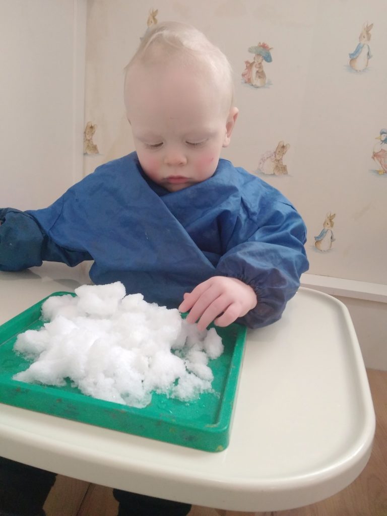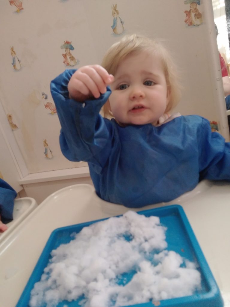 At Acorns the under 2 children had a fantastic time exploring in the snow. The Bobtail children walked through the snow to hear it crunch underneath their wellies and then felt the snow to see what it was like. They also enjoyed using the large soft play blocks for pretend sledges and had great fun sliding down in the snow on these.