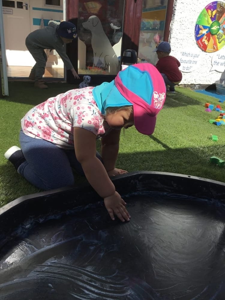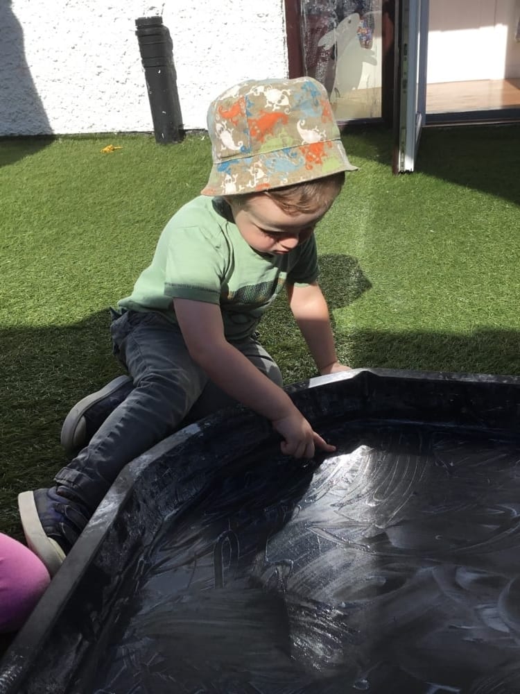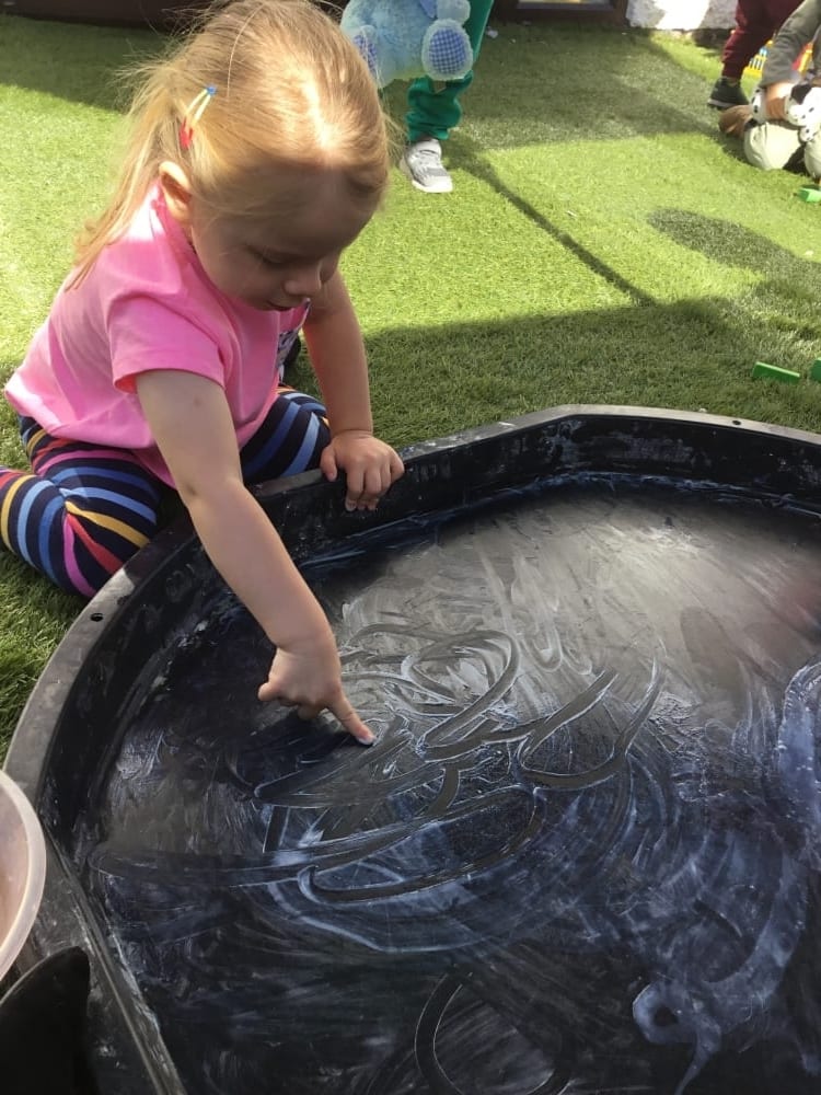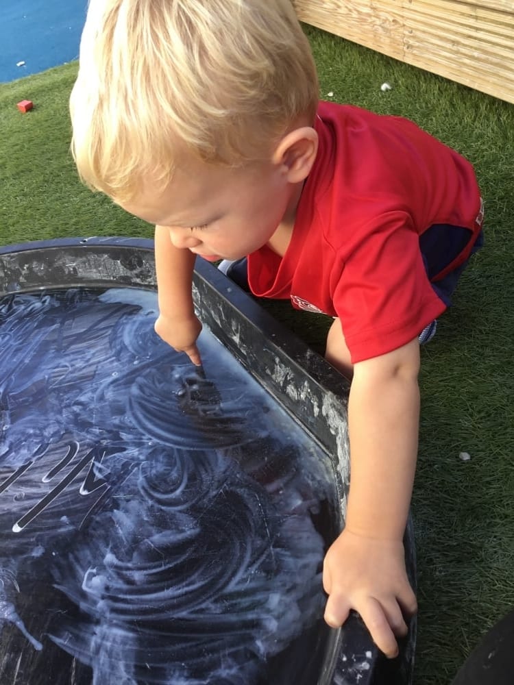 The Benjamin Bunnies and Peter Rabbits have been exploring the different ways we can make marks so we decided to add a soapy water tray to our outdoor activities. This was a simple but effective way of helping them to develop their mark making skills in a fun way.