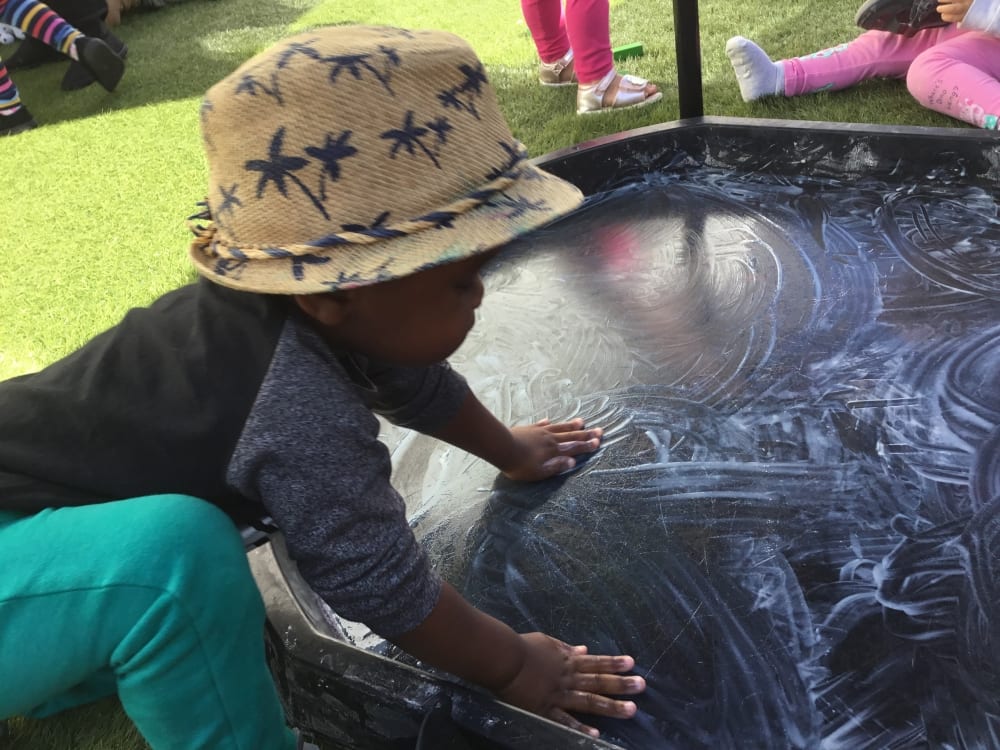 The children were very curious as they used their fingers to make lines and circles. As they became more engrossed in this activity they started to move their hands around the tray to create larger marks. They loved the tactile nature of the activity as they traced their fingers through the slimy soap. Some of the older Peter Rabbits were able to practise copying the letters of their names! Well done!