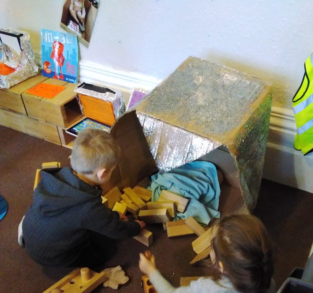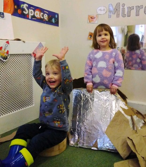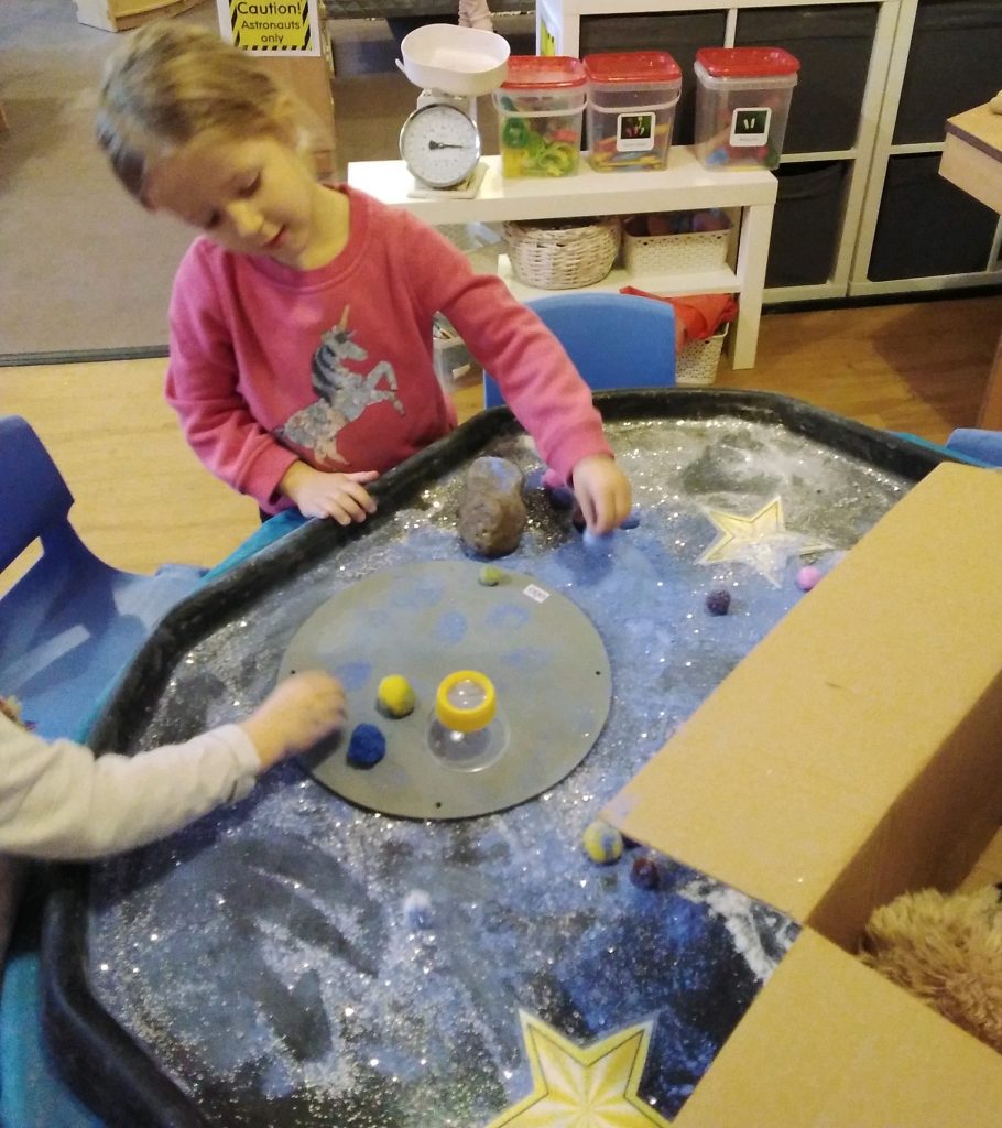 Our Early Years and Peter Rabbits have loved getting involved with our space themed activities. They have been busy counting down from five and blasting off into space, just like Baby Bear in the ‘Whatever Next’ story by Jill Murphy. Role playing this story has been tremendous fun, with the children wearing colanders as space helmets and climbing into boxes for their journey to the moon.
