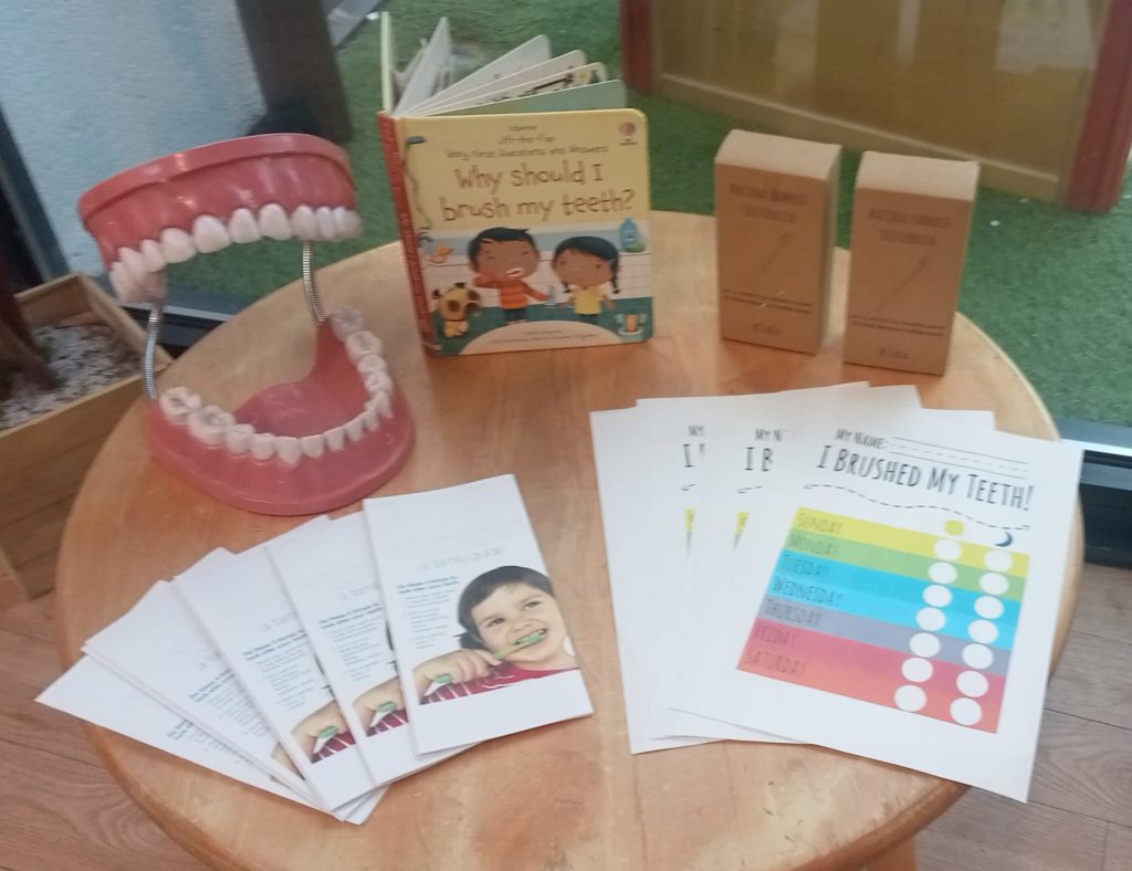 Miss Sarah put together this brilliant resource for our families to encourage toothbrushing. It contains natural bamboo toothbrushes, worksheets for the children, information sheets for parents/carers, a book for the children to look through with parents/carers and our very own artificial set of teeth to practice on.