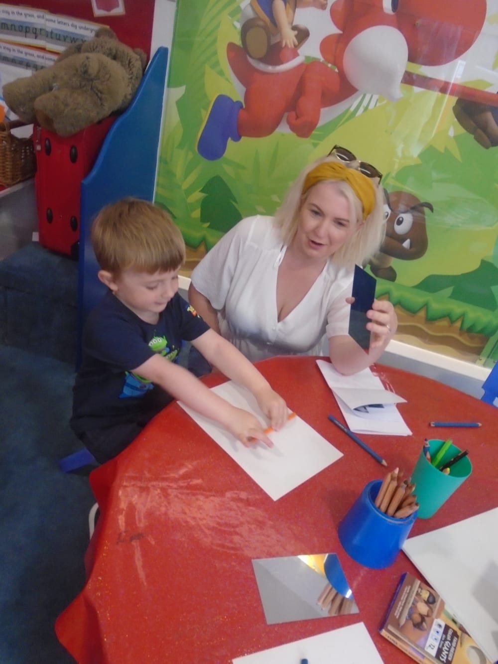 The activities we had on offer included the children and family members creating self-portraits. This could be done with pencils or play-dough. They used the mirrors to draw themselves based on their reflections. Some even opted to draw each other. Over on the play dough the children and their special visitors were busy moulding and using different materials to create portraits.