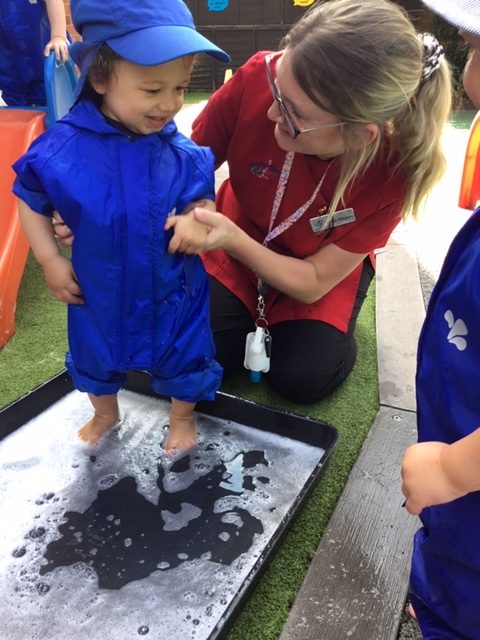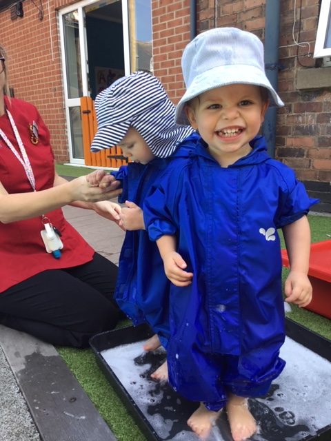The children made their own puddles to jump in and out of. They made their own water slide and enjoyed making big splashes in the water tray!